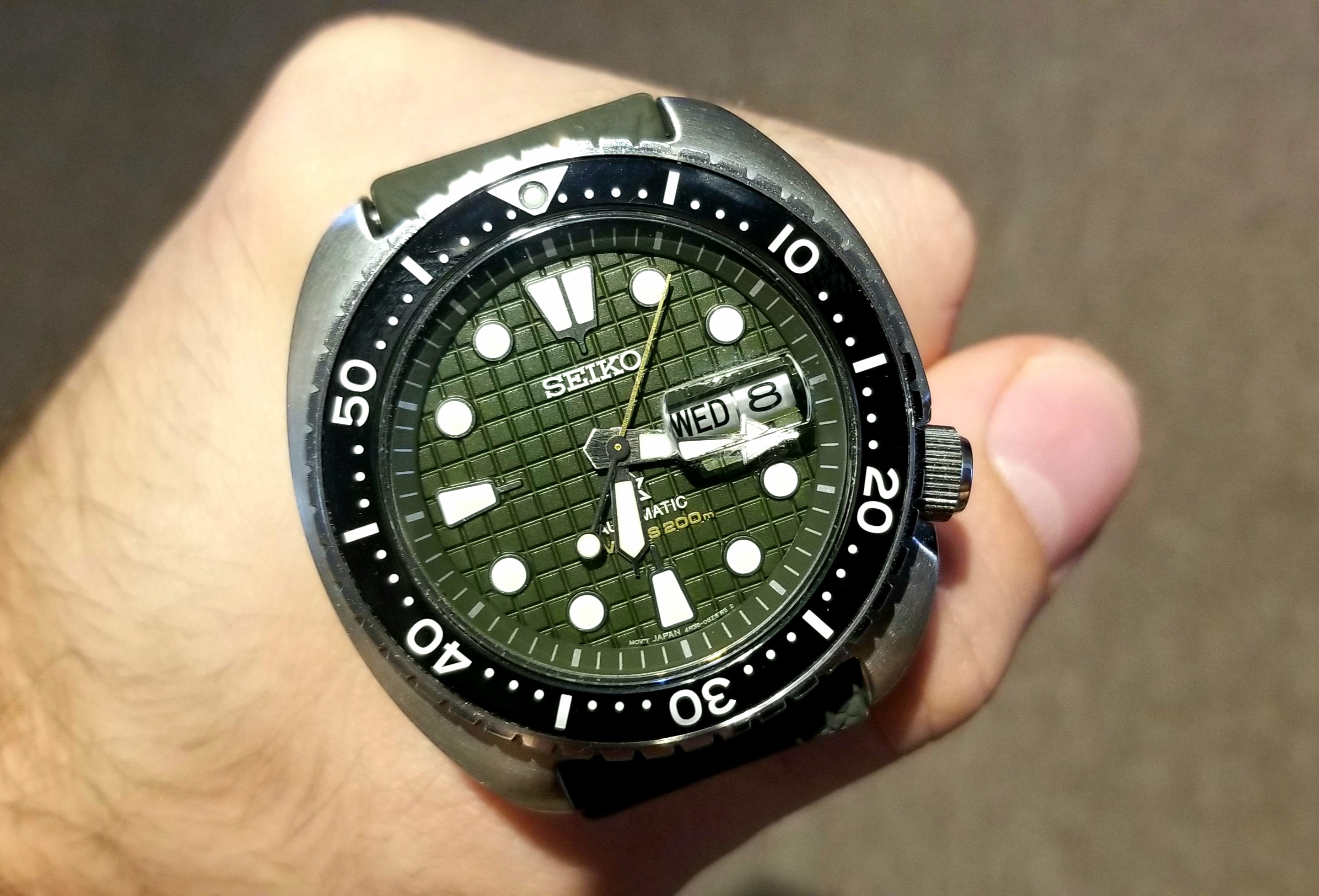 And it's somewhat refined looking rather than flashy or bright. The turtle cased Seikos fit me better, and this doesn't try to rotate 60 degrees from flat on my wrist like my Solar PADI Tuna. The keeper also doesn't slide too easily like with my Tuna, so the strap doesn't hang out and flop around. I think my Tuna tends to sometimes fit too tight, or too loose, while the hole spacing on this turtle strap fits me better.