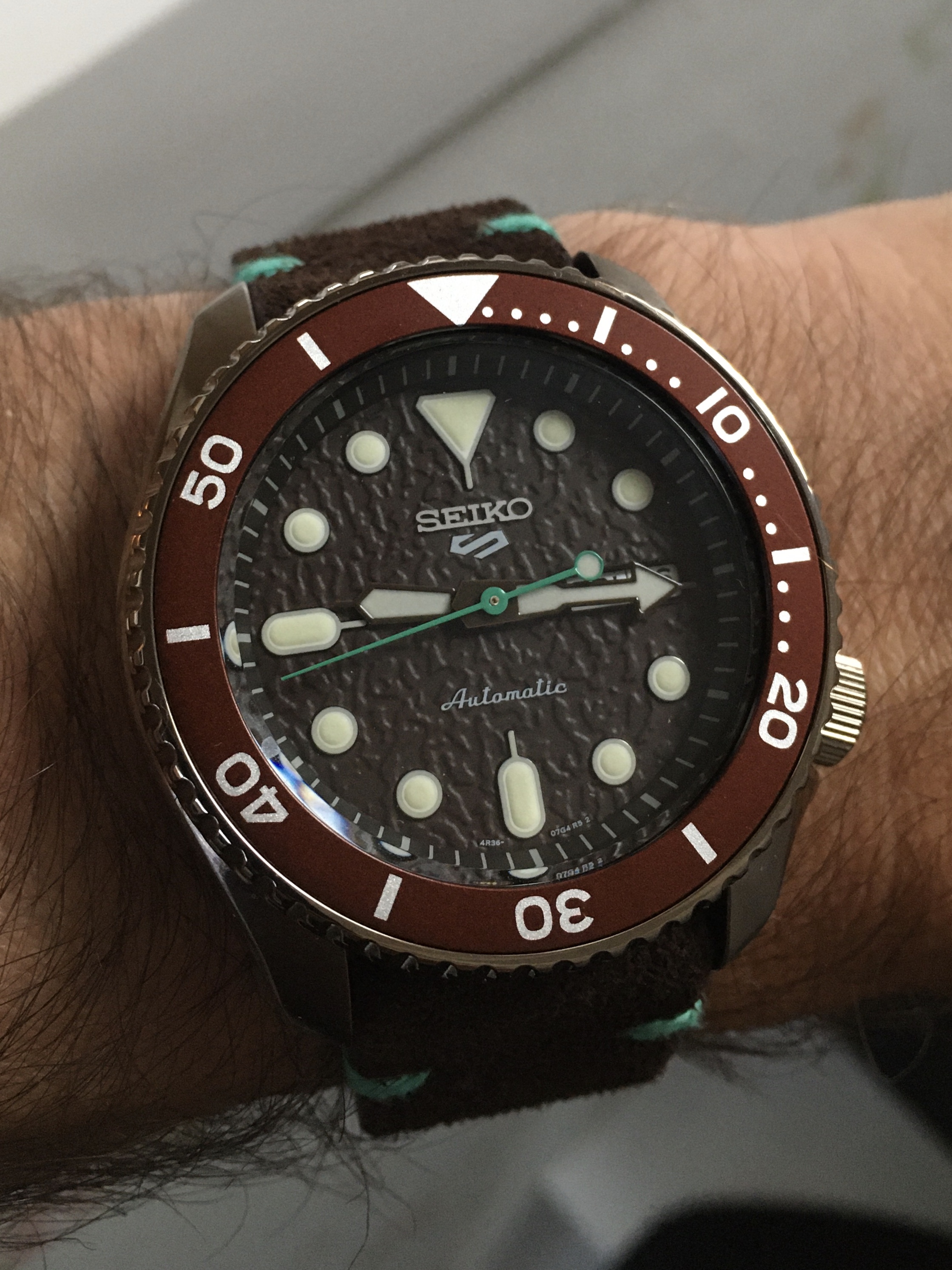 Here is my first Seiko, nothing fancy but I really like it, the fit and finish is excellent. Was not sure about a brown watch when I saw the sellers pictures but it is great irl.