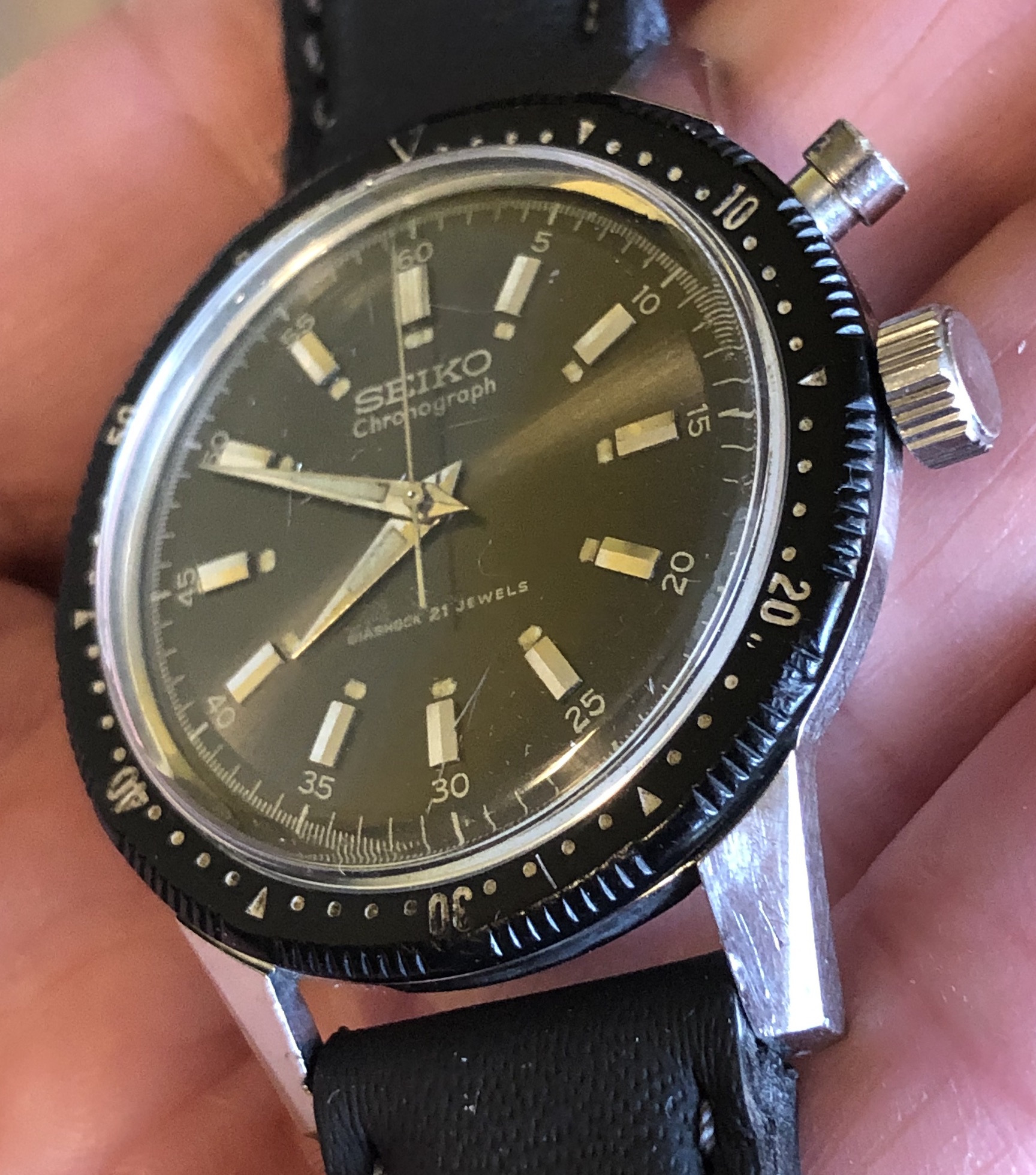 New arrival, this is the chrono I've been wanting. A 1964 ref 45899 made for the Tokyo Olympics. Far from pristine, but it's quite hard to find these that haven't been tampered with and with an intact bakelite bezel, so I'm pleased to get this one. Under the damaged crystal, the dial is quite clean, but I'm not going to bother polishing the crystal since I have a correct replacement.