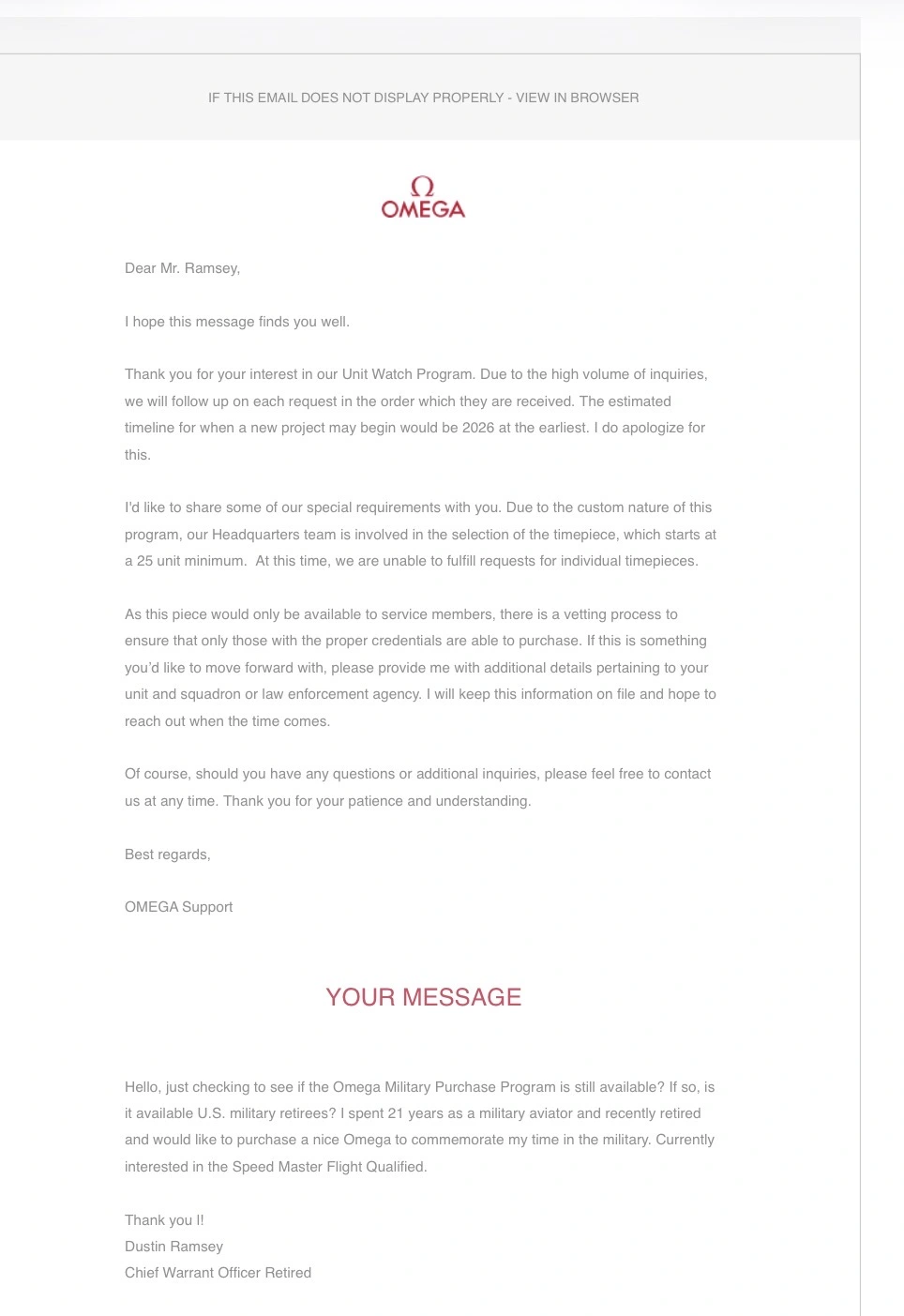 Still in limbo. Looks like the company wants to do Type Model Series with Squadron buys. Will be tough to get a watch without going through a squadron. Really tough, if they dont fly your plane any more.
