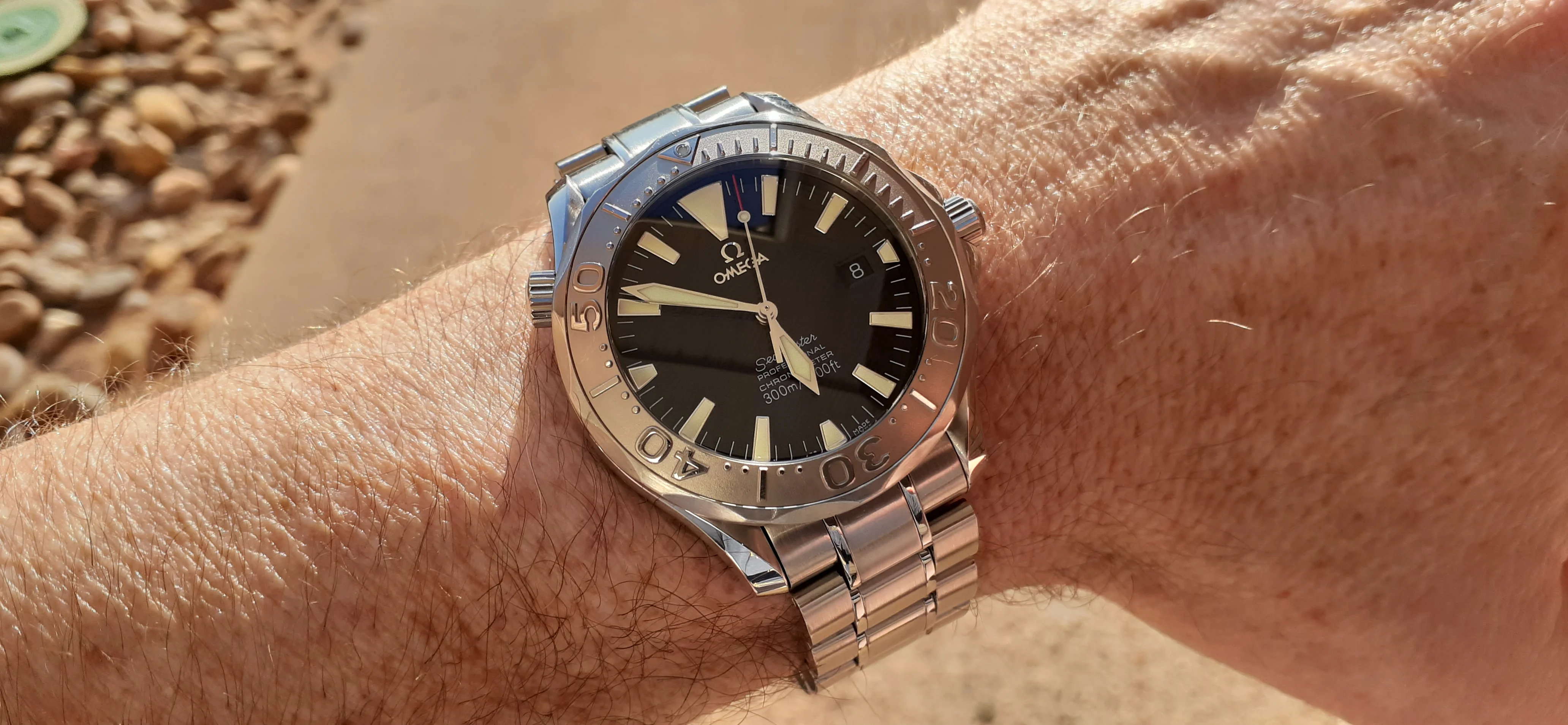 ·I am selling my Omega Seamaster 2230.50 "Non-America's Cup" Please look at the photos for condition. I bought it from Watch Vault NYC two or three years ago and as far as I know, it hasn't been serviced (there is even some of the red wax on the back of the case.) I timed it with WatchCheck over a week and it is averaging +7.4 sec per day. It is a great looking watch but it does have micro-scratches everywhere (I took a lot of photos today in harsh lighting to show it at it's worst) and a few deeper dings. Comes with the chronometer card, warranty card, bibliography card, three full links and one half-link only.