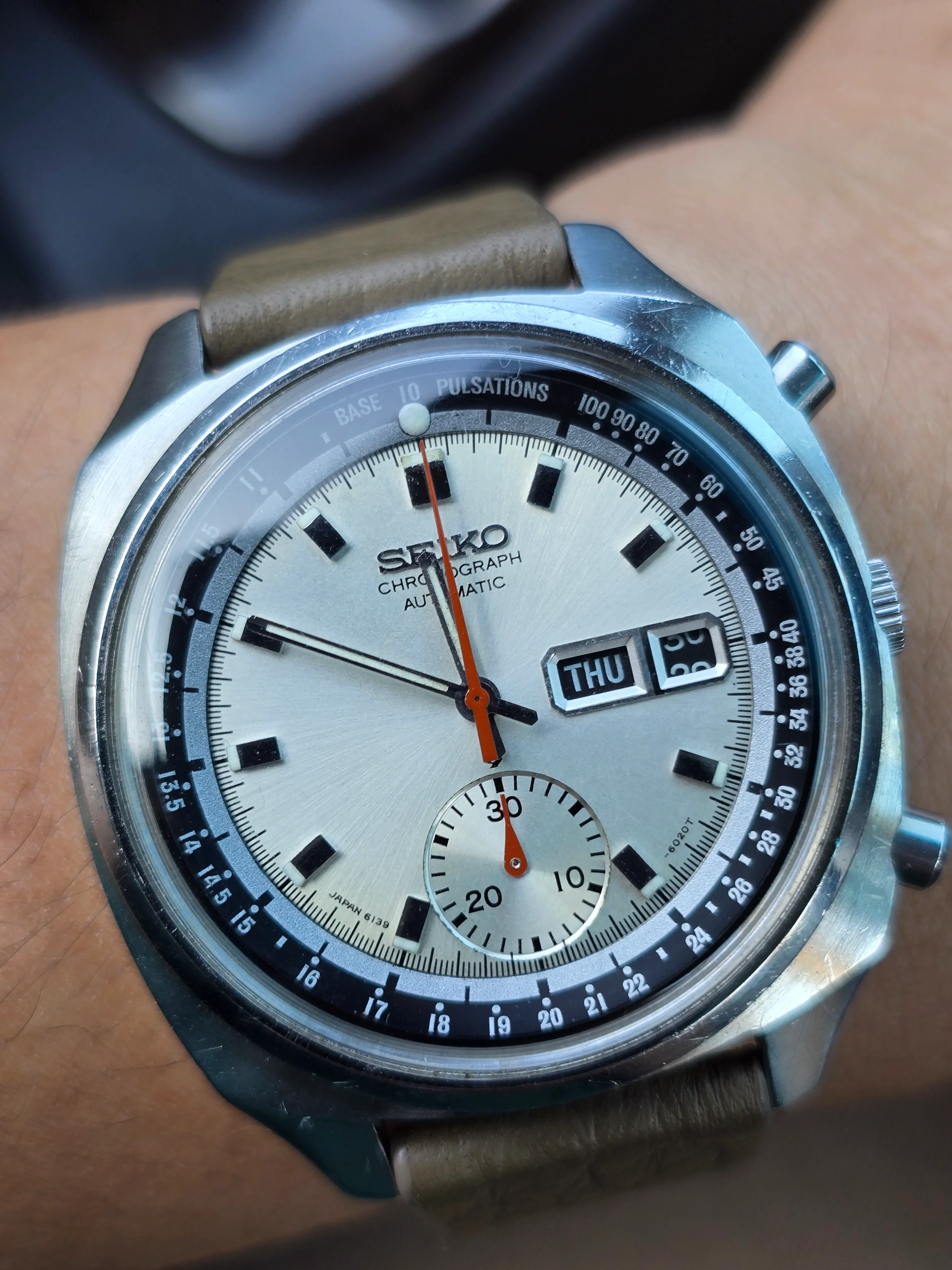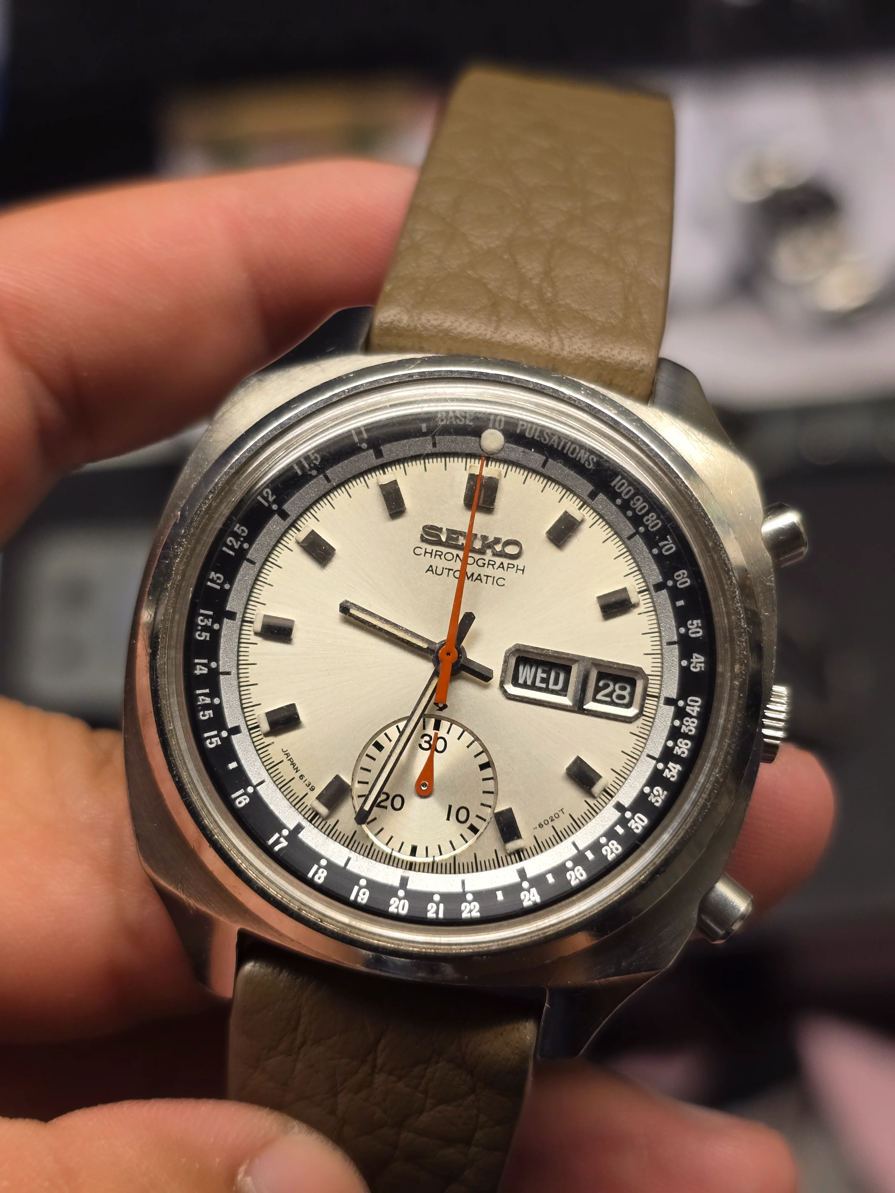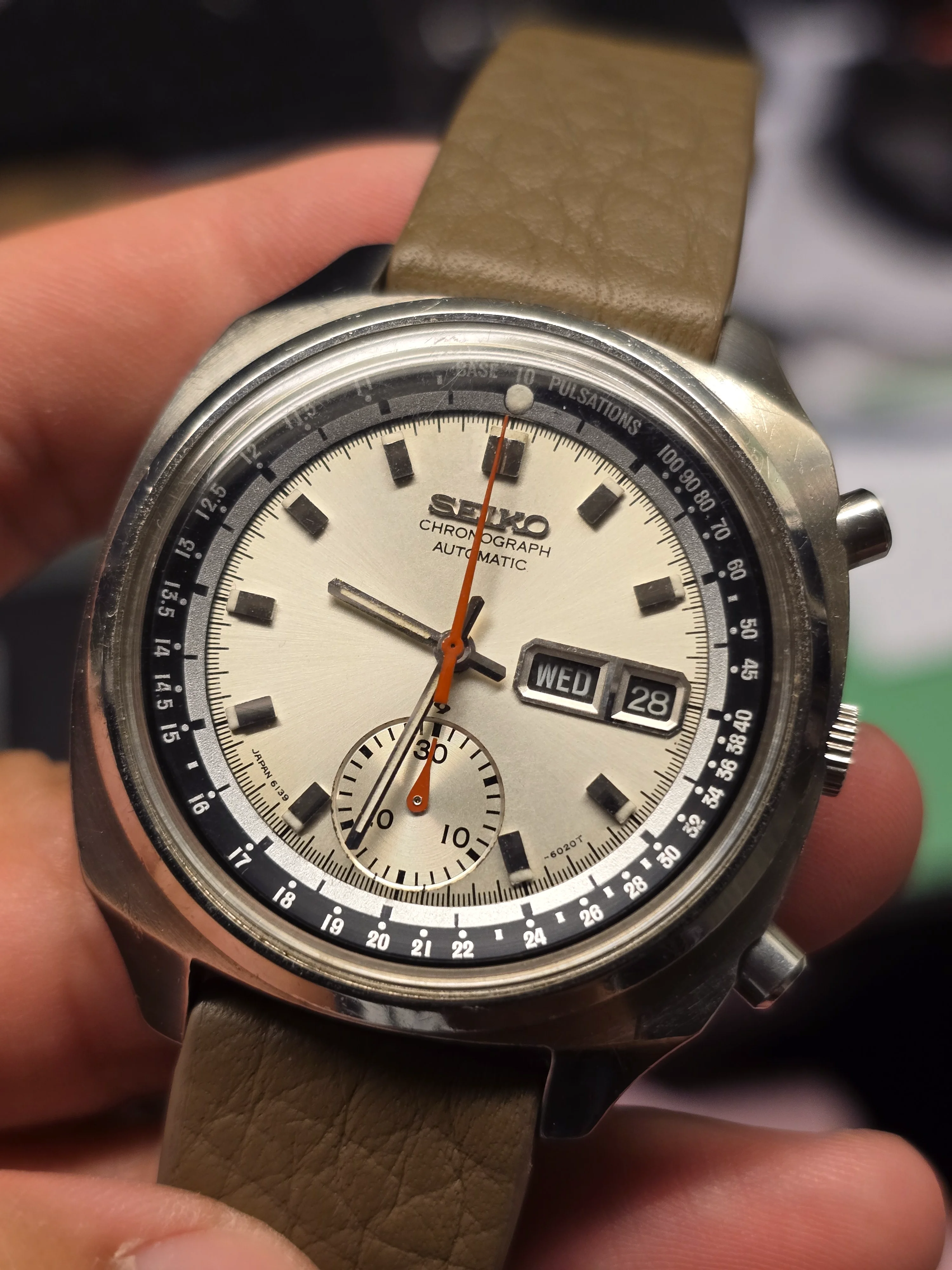 ·Up for sale is my Vintage Seiko Pulsations Chronograph Ref. 6139-6020. The watch is in beautiful condition, with a mint dial and clean overall appearance. All functions work correctly, and the chronograph starts, stops, and resets cleanly back to 0 as it should. Inner bezel move smoothly for the pulsation function.