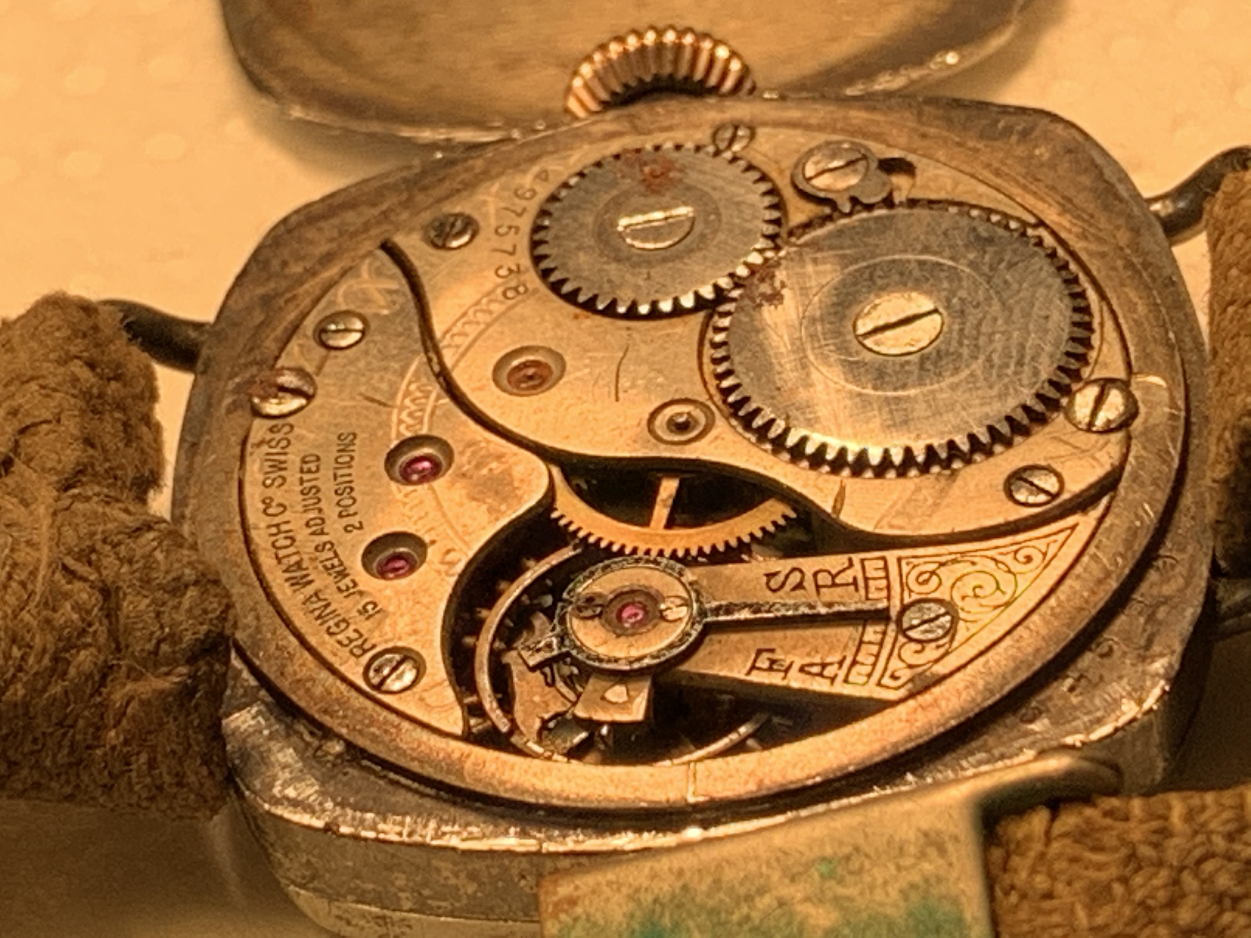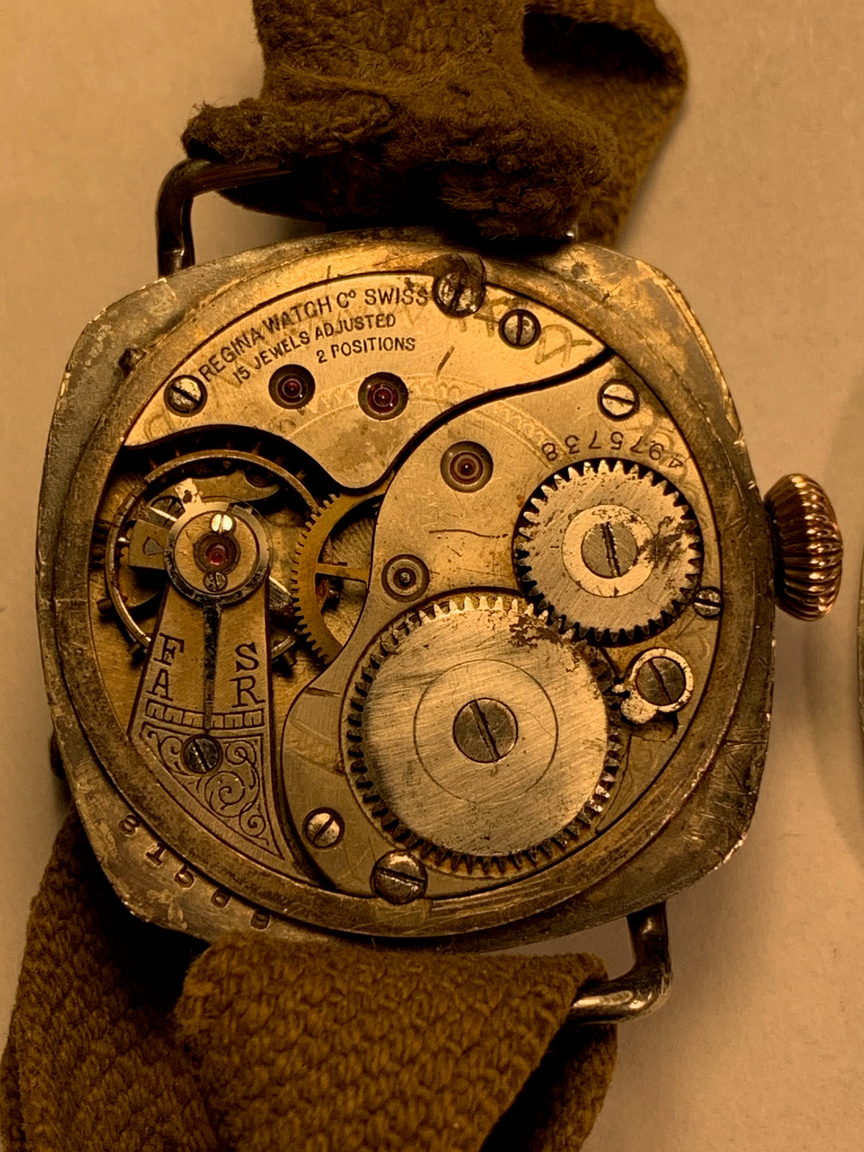 ·I have an all original WW1 Regina trench watch with a Fahys sterling silver case and guard. Movement is marked regina watch co Swiss 15 jewels adjusted 2 positions. The serial # on the movement 4975738. The serial # on the back case cover which reads Fahys Sterling Patent Pending, 10320668. There is also a number on the lip of the main case 81568. I have read Omega purchased Regina around 1915 and it may be an Omega movement with the Regina brand on it. I would appreciate any insight and information on the watch and it's history. Thank you.