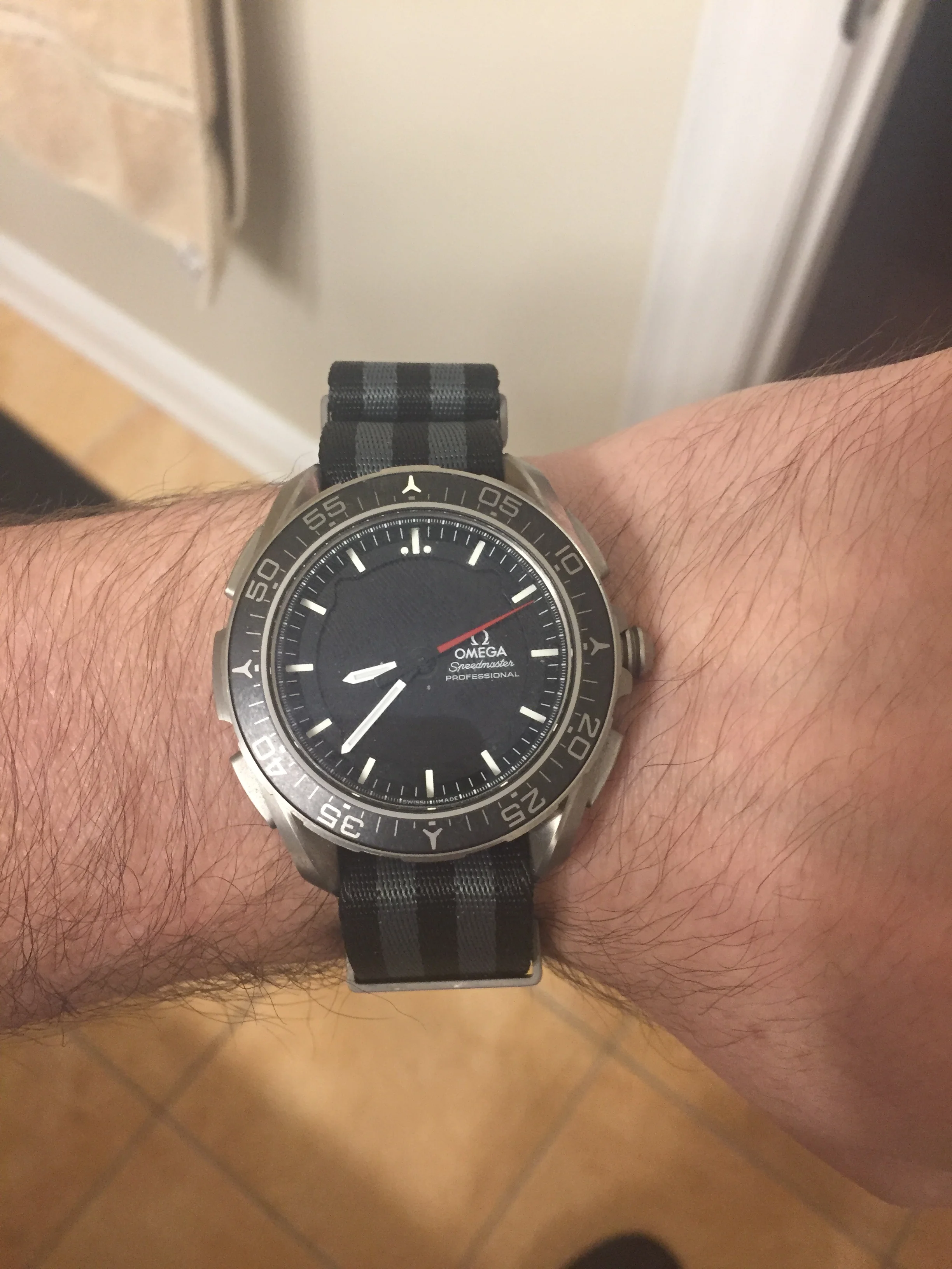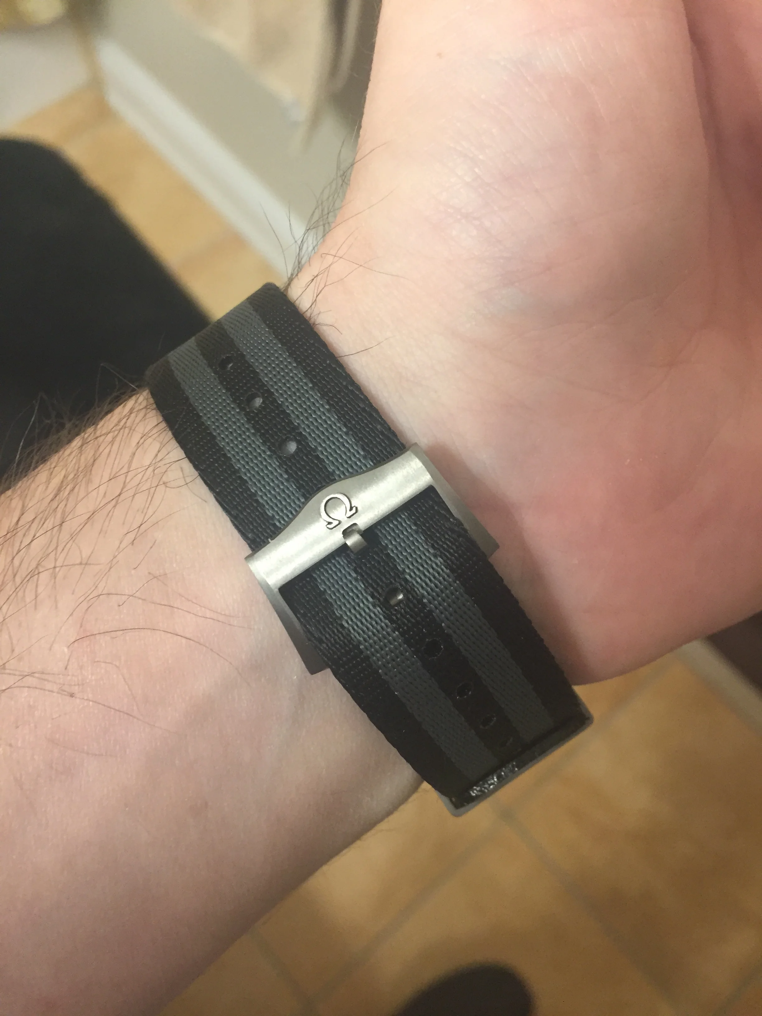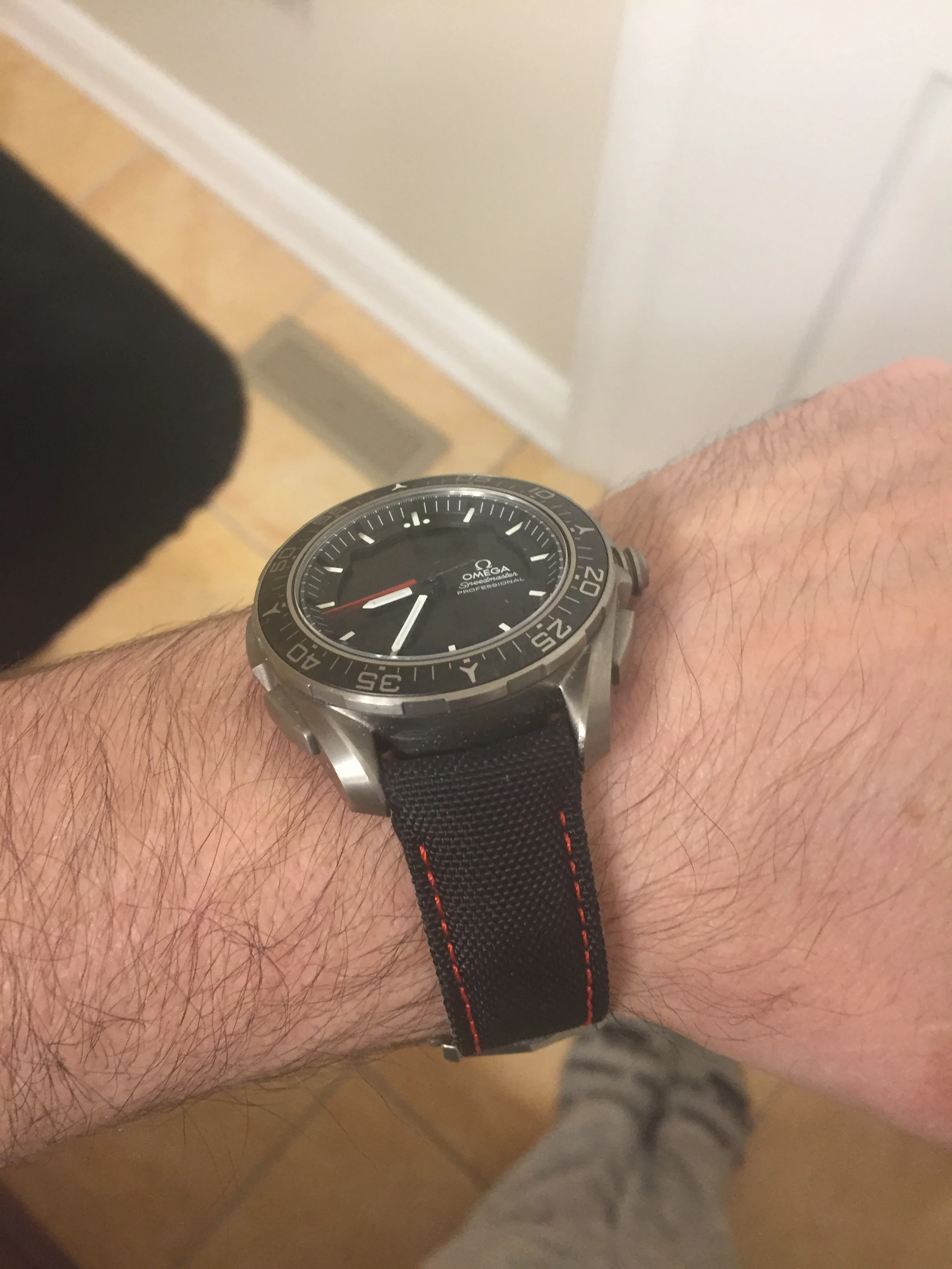 My usual strap is an aftermarket nylon one with red stitches to match the seconds hand and fitted lugs.