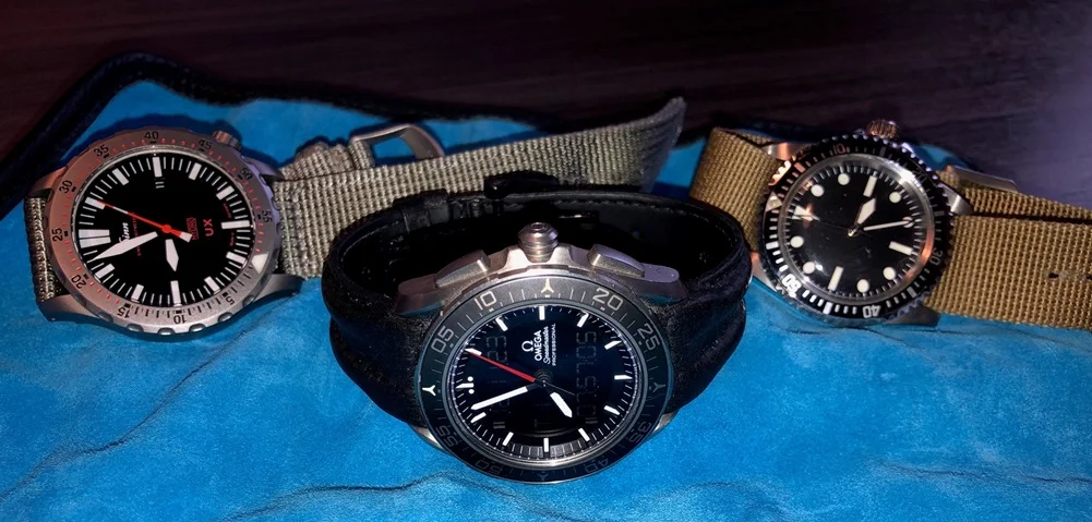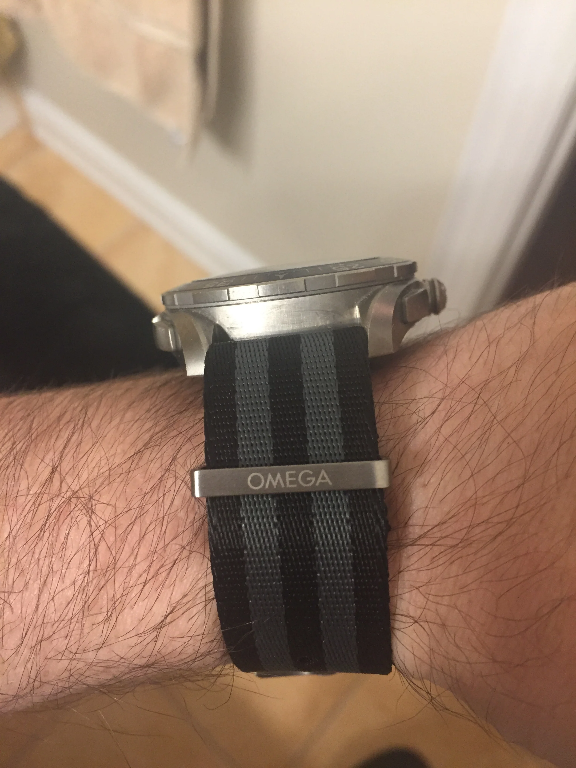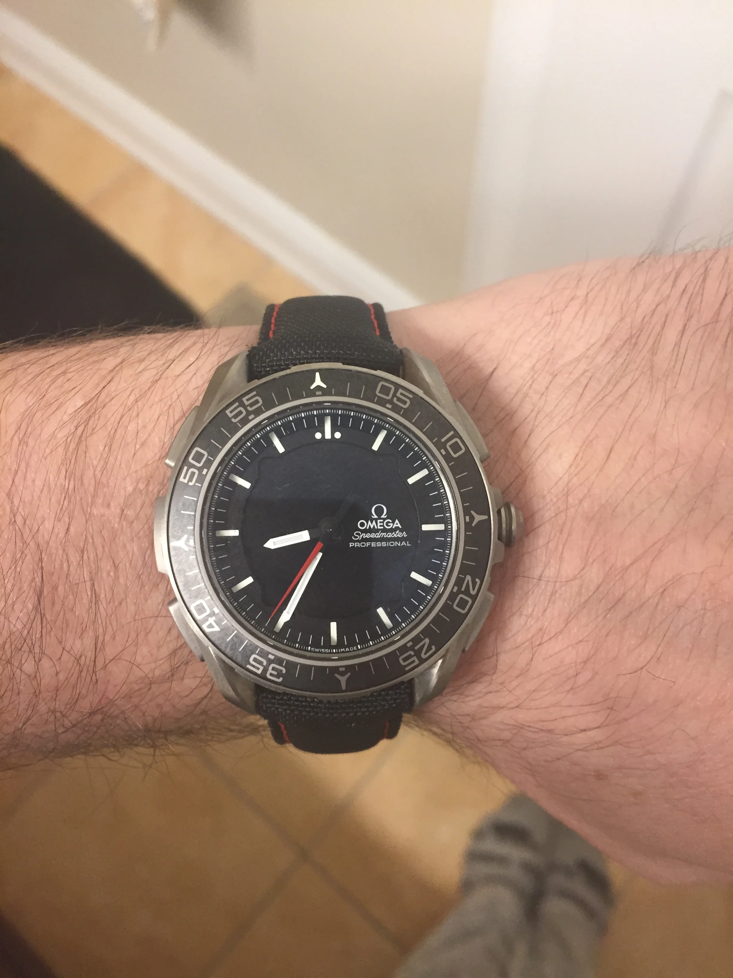 My usual strap is an aftermarket nylon one with red stitches to match the seconds hand and fitted lugs.