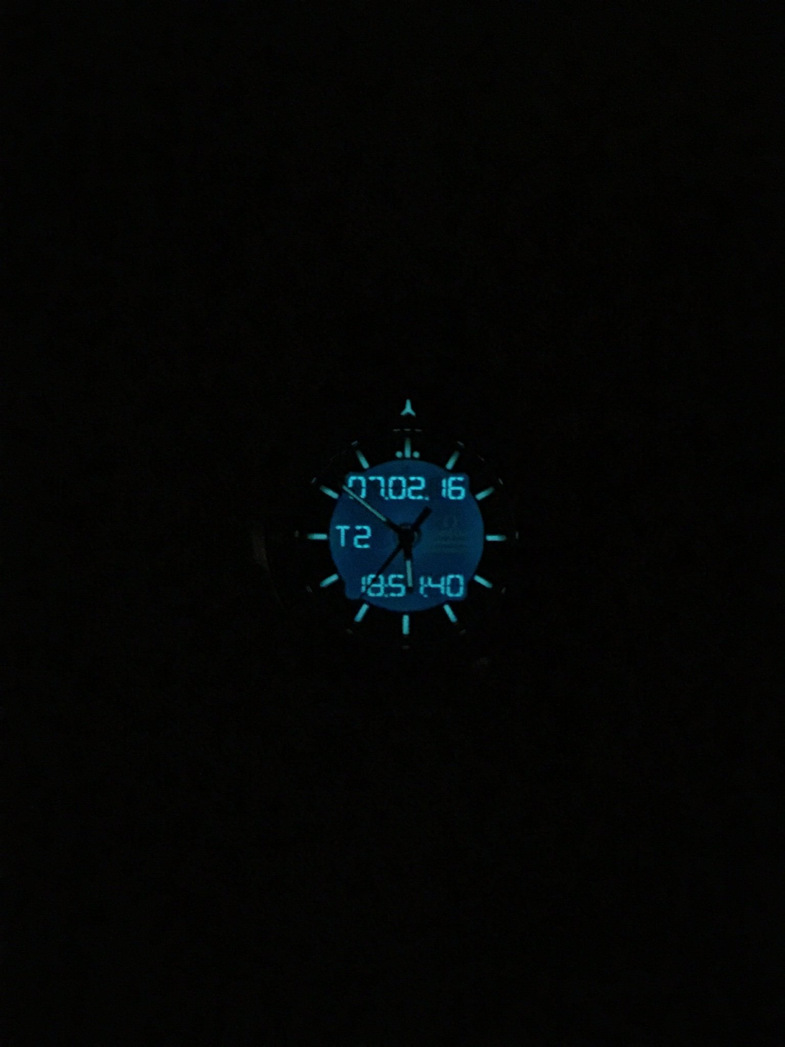 Here is a photo of the backlight in complete darkness. The indices really weren't charged up. Not bad but not as bright as my original X-33. The battery in the X-33 version 1 lasted about thirty months, however I don't use the backlight much or use the alarm. Time to replace the battery.