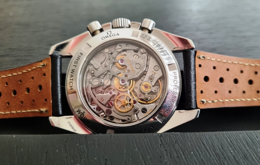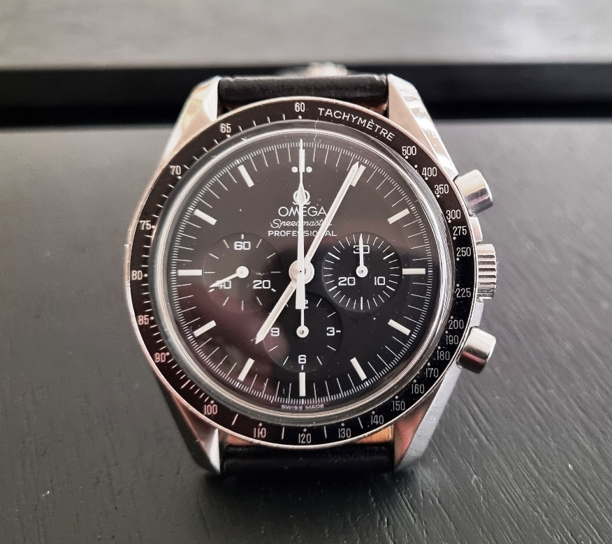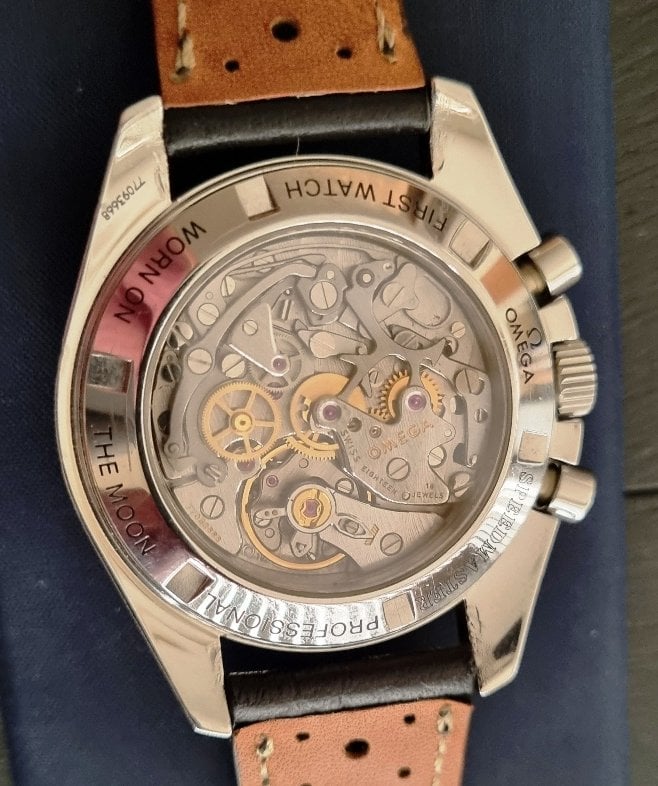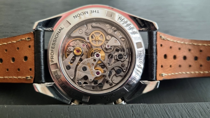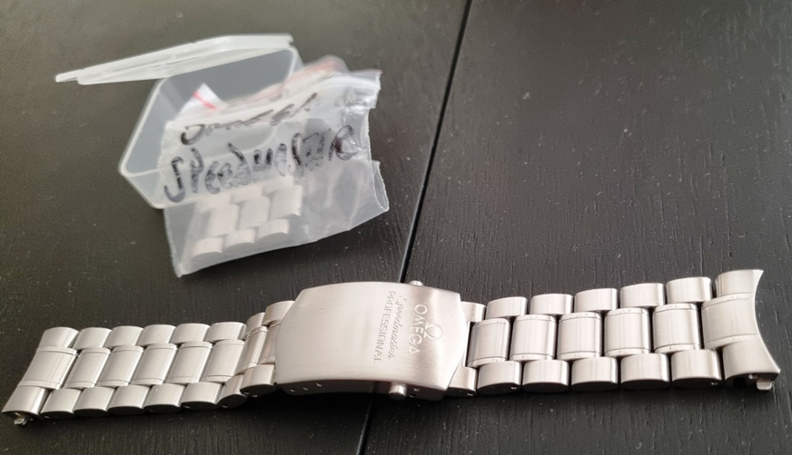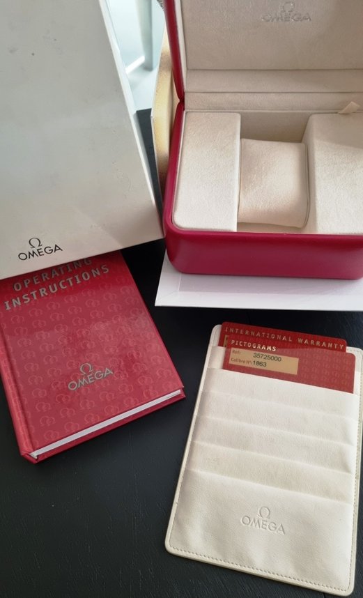 ·Year 2000 Moonwatch. Box, papers and full original bracelet are included. Unpolished case with obviously some minor scratches and minor dents especially to the outer of the bezel for its age. Original acrylic "glass" with Omega logo. Open case-back showing the beautiful 1863 movement. Stopwatch works as it should and resets excellently.