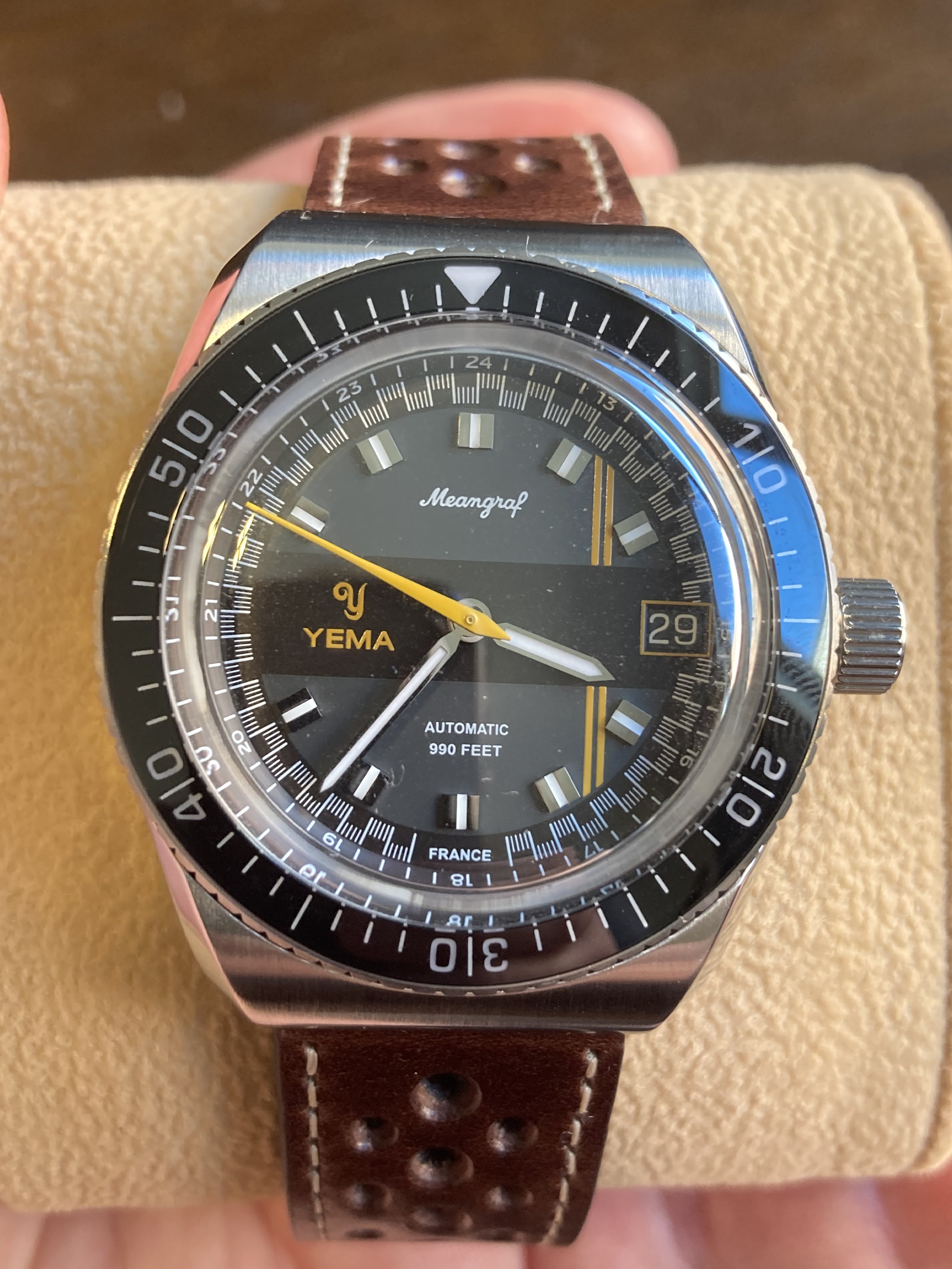 ·For sale: Brand new Yema Meangraf Sous-Marine Y60 diver. Pre-ordered this spring and just arrived; turns out it’s just not for me. But at 39mm and only 11.6mm thick I think it’s an excellent option for people who like the new ‘70s reeditions from Longines and Certina etc but can’t wear the large 42mm+ sizes they come in. (I have a larger wrist so this ends up feeling extra small on me).