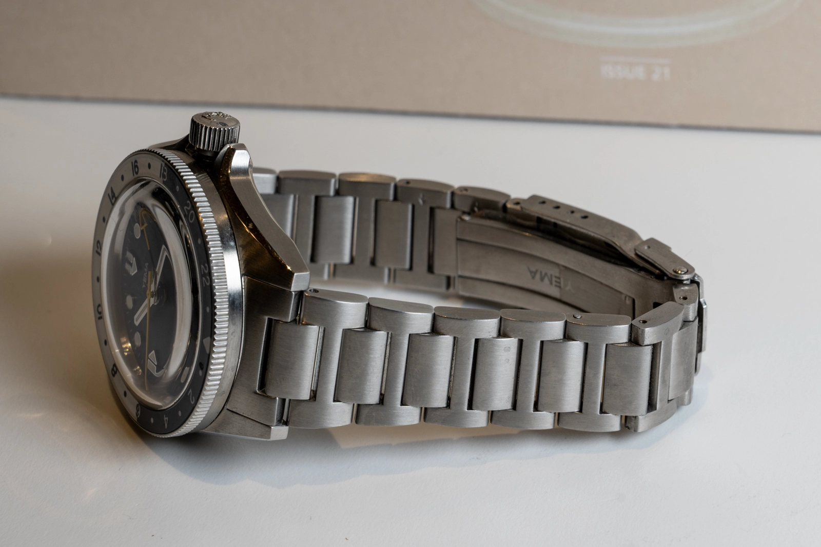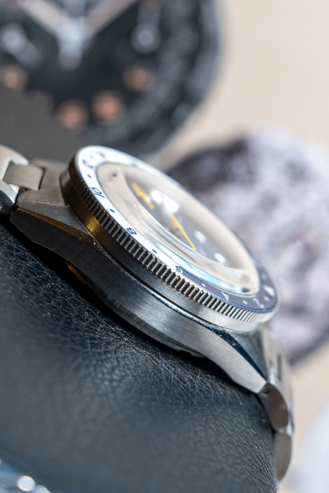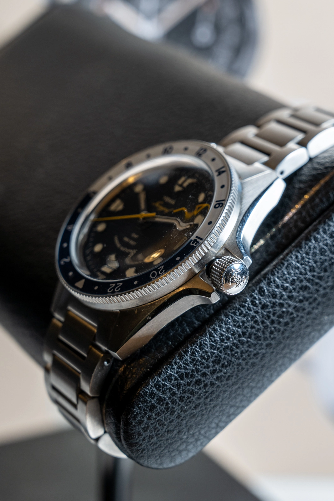 The bi-directional, 120-click rotating, 24-hours graduated bezel is made of scratch-resistant sapphire crystal, offering a high-quality shimmering glossy appearance. Highly visual two-tone day/night indicator. Bezel numerals and day indicator fully treated with Grade A Super-LumiNova BGW9 . Designed for travellers, the GMT complication allows reading of up to 3 different time zones.