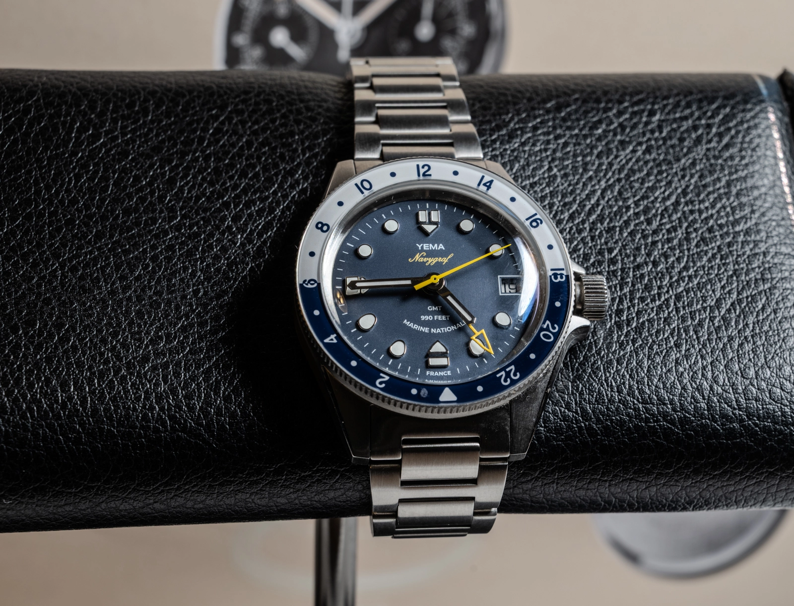 The dial inspires from the 1970s Navygraf II and features raised hour markers in polished steel matching the hands and providing additional depth to the dial. The white hour markers and hands, in contrast with the Navy blue dial, ensure high readabilty in all circumstances. The sweeping hand, GMT hand and Navygraf's logo are gracefully highlighted in yellow. Official French Navy watch with Marine Nationale mention at 6 o'clock.