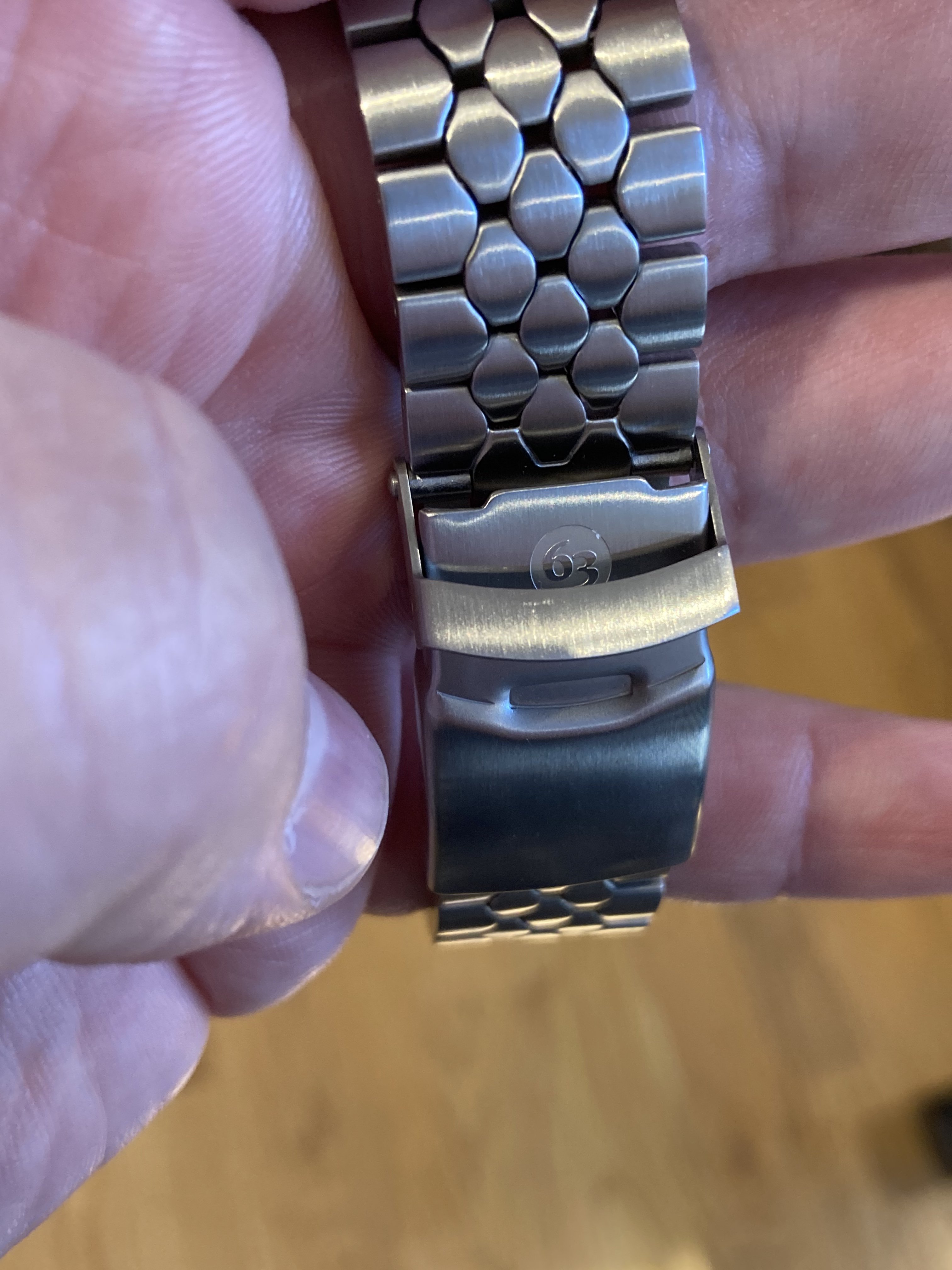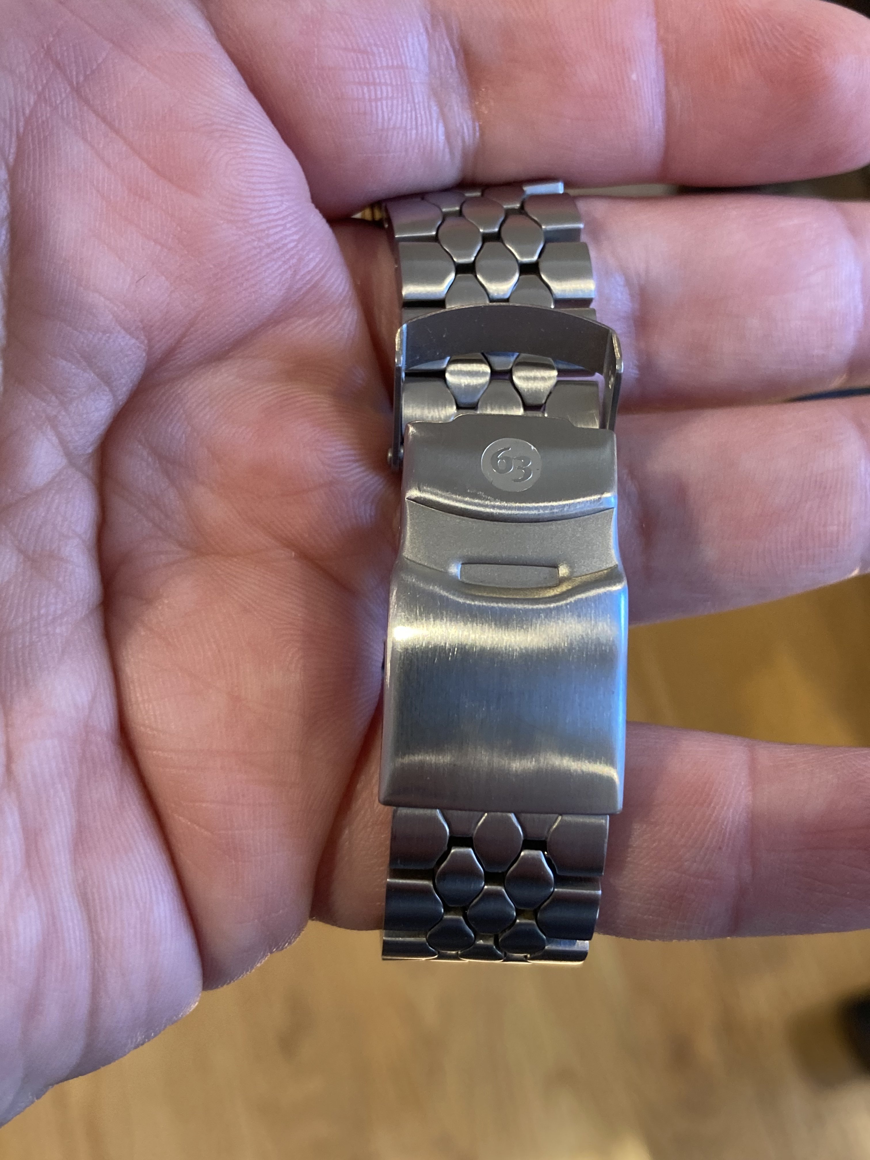 This one has the green-tint lume, classic shovel hand and the exclusive ‘63’ imprint on the bracelet.