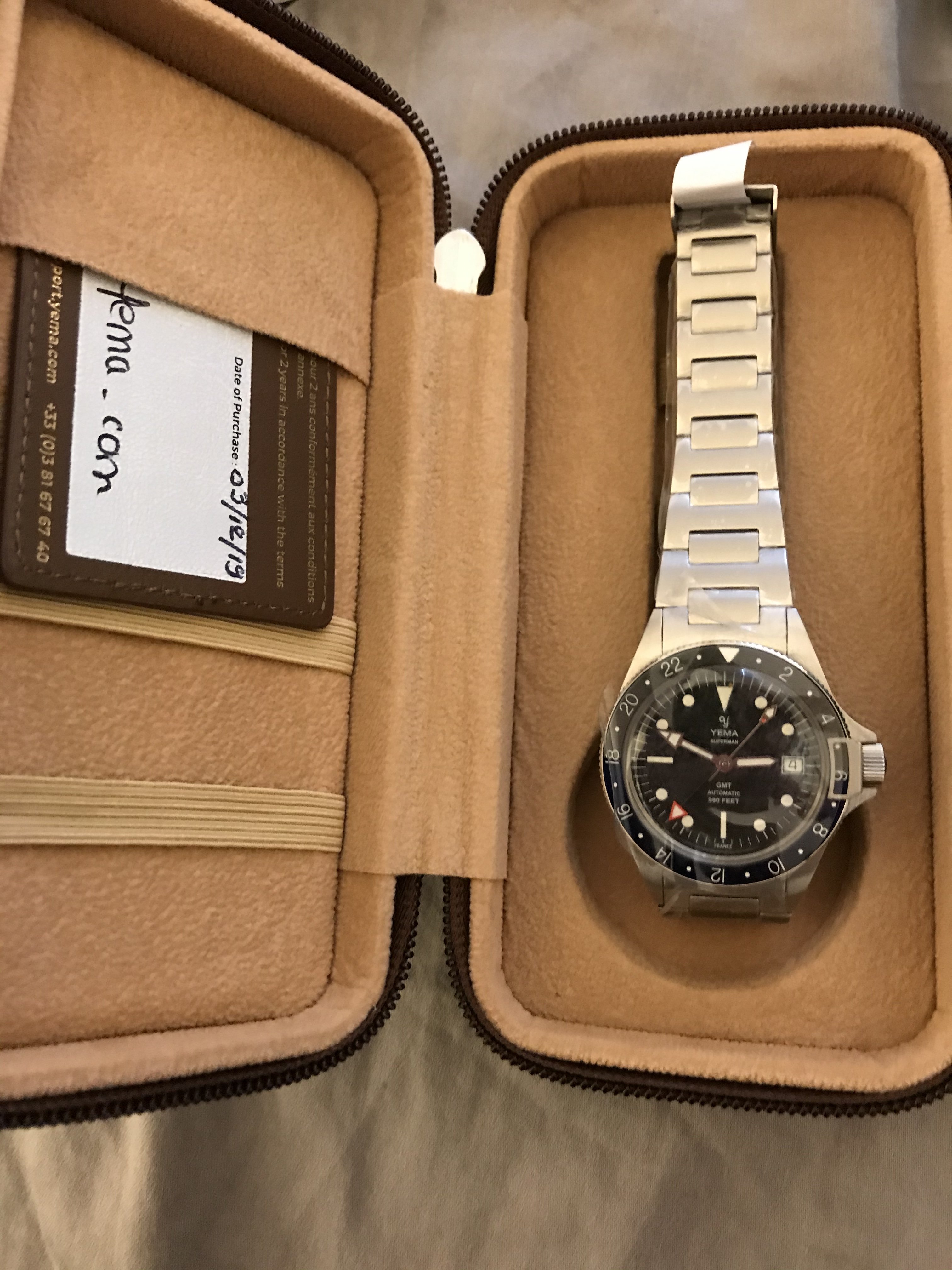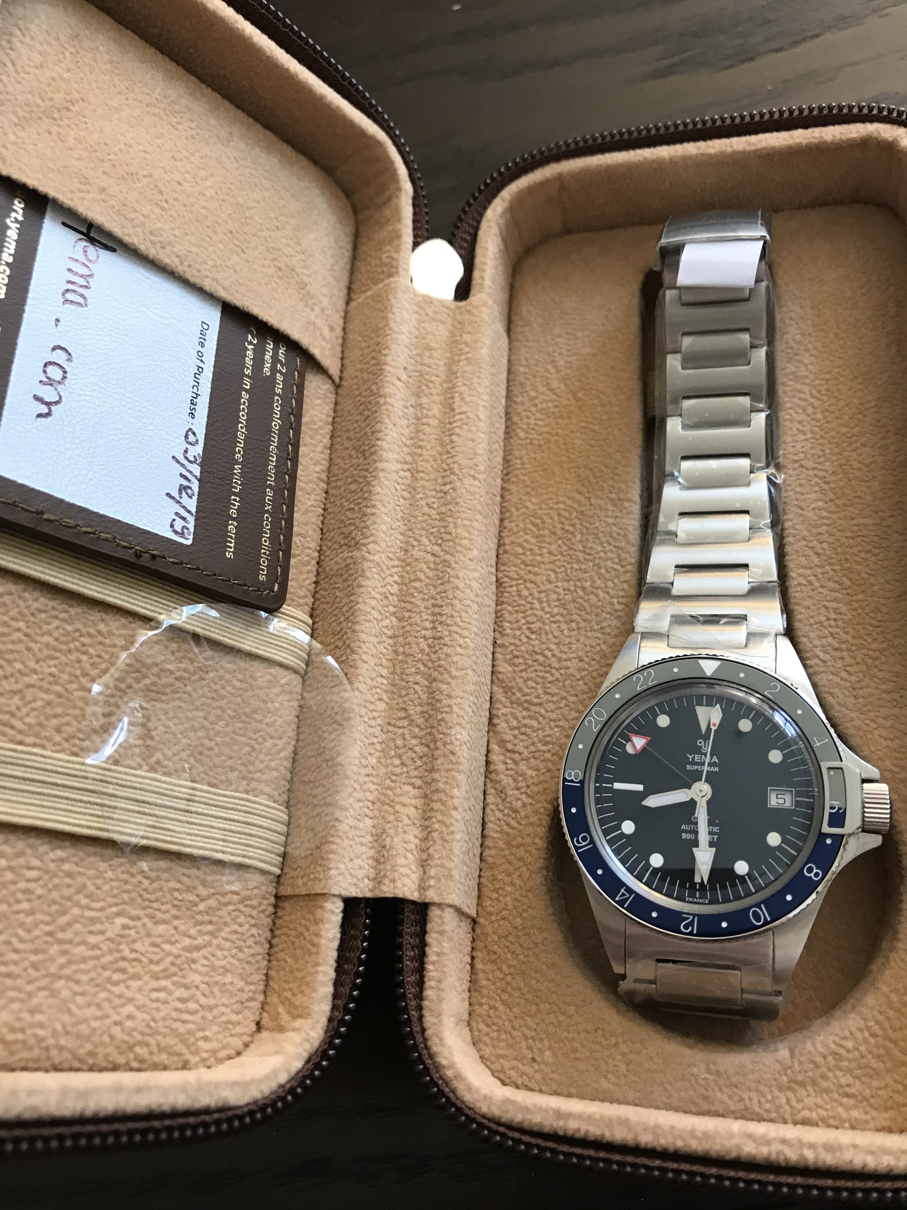 The full set includes the outer cardboard sleeve, cool inner leather travel case, warranty card, Yema booklet (something in French about the history of the brand; the instruction manual is digital) and even my original purchase receipt that was included when it shipped to me.