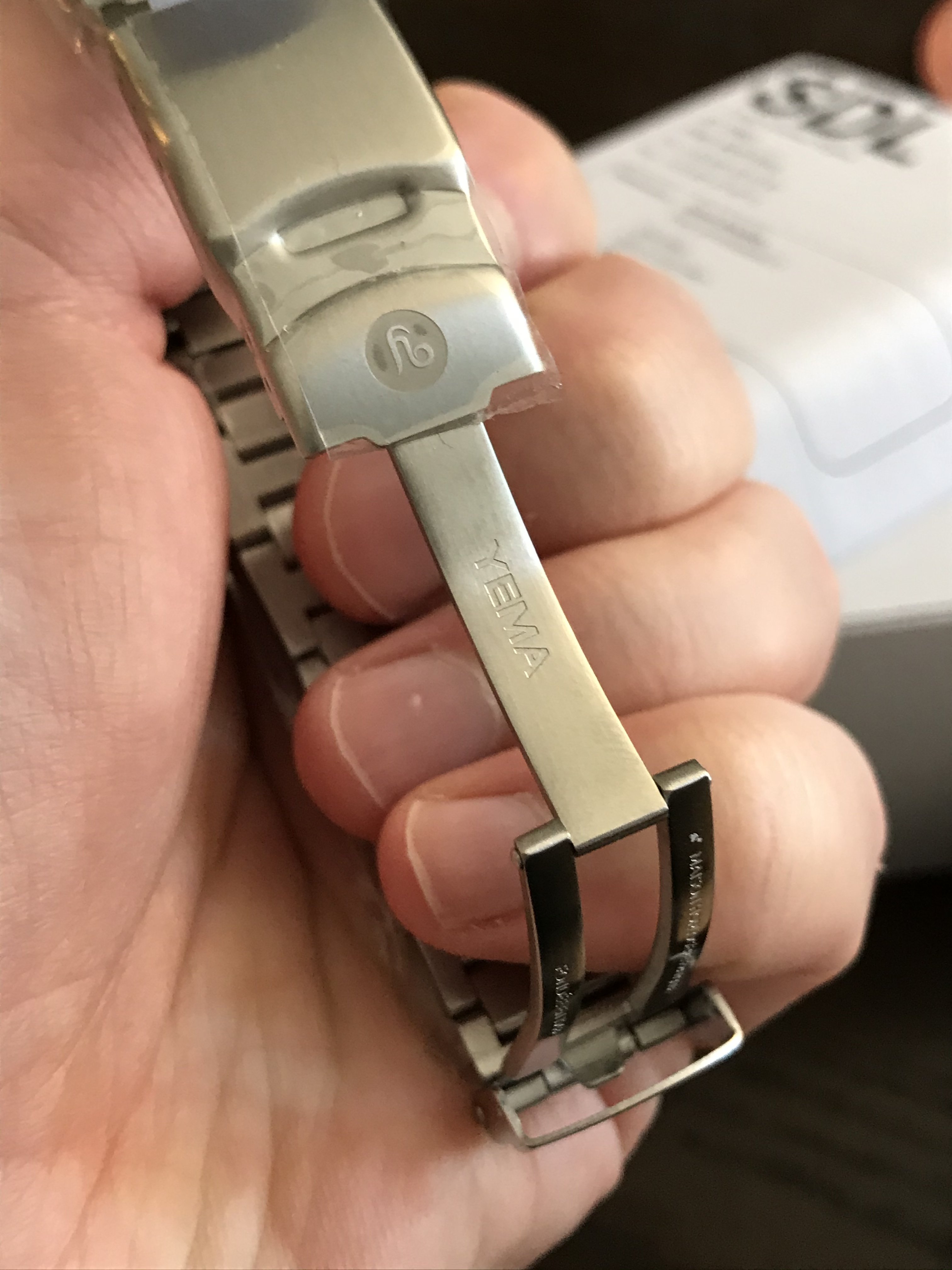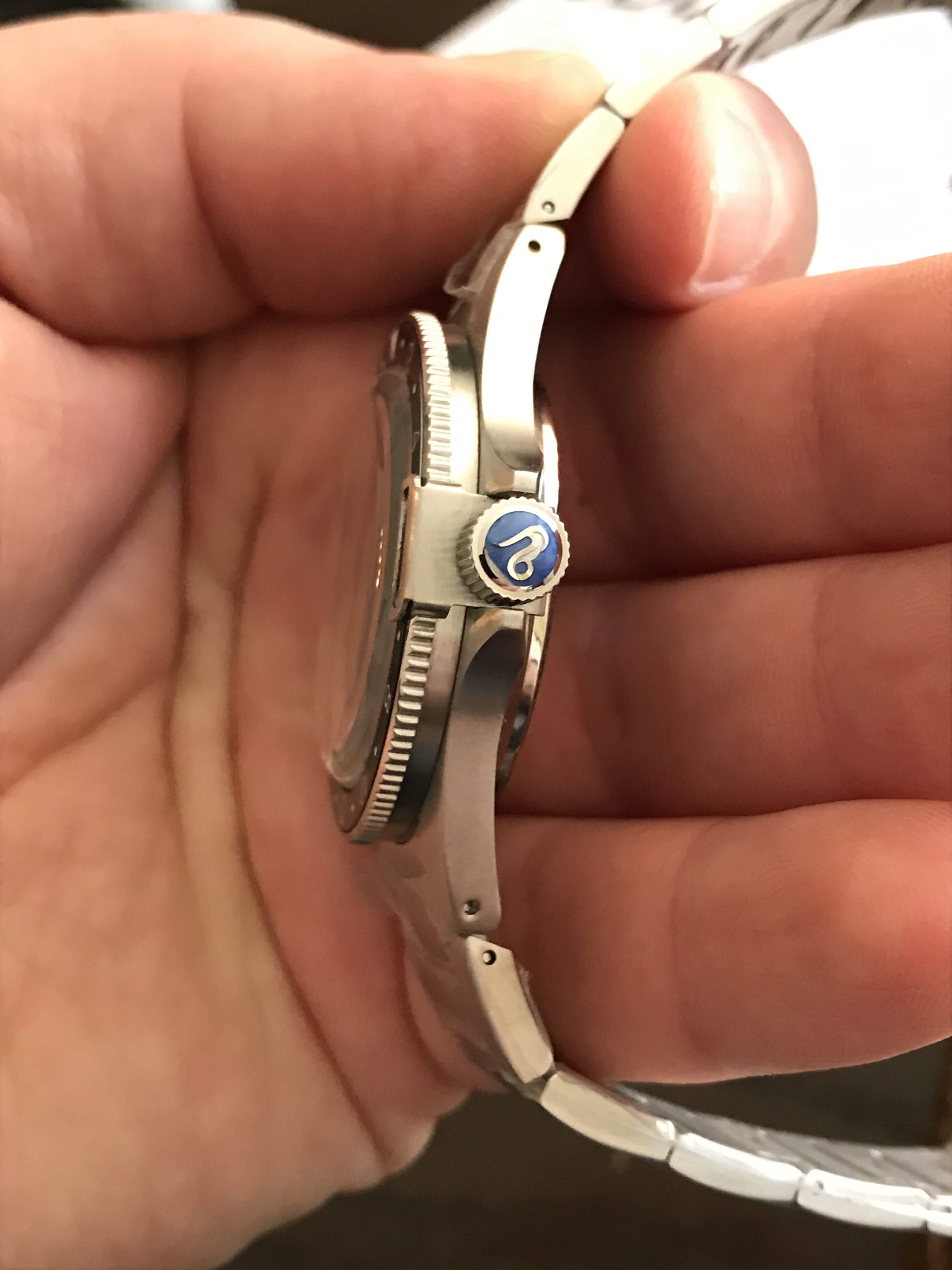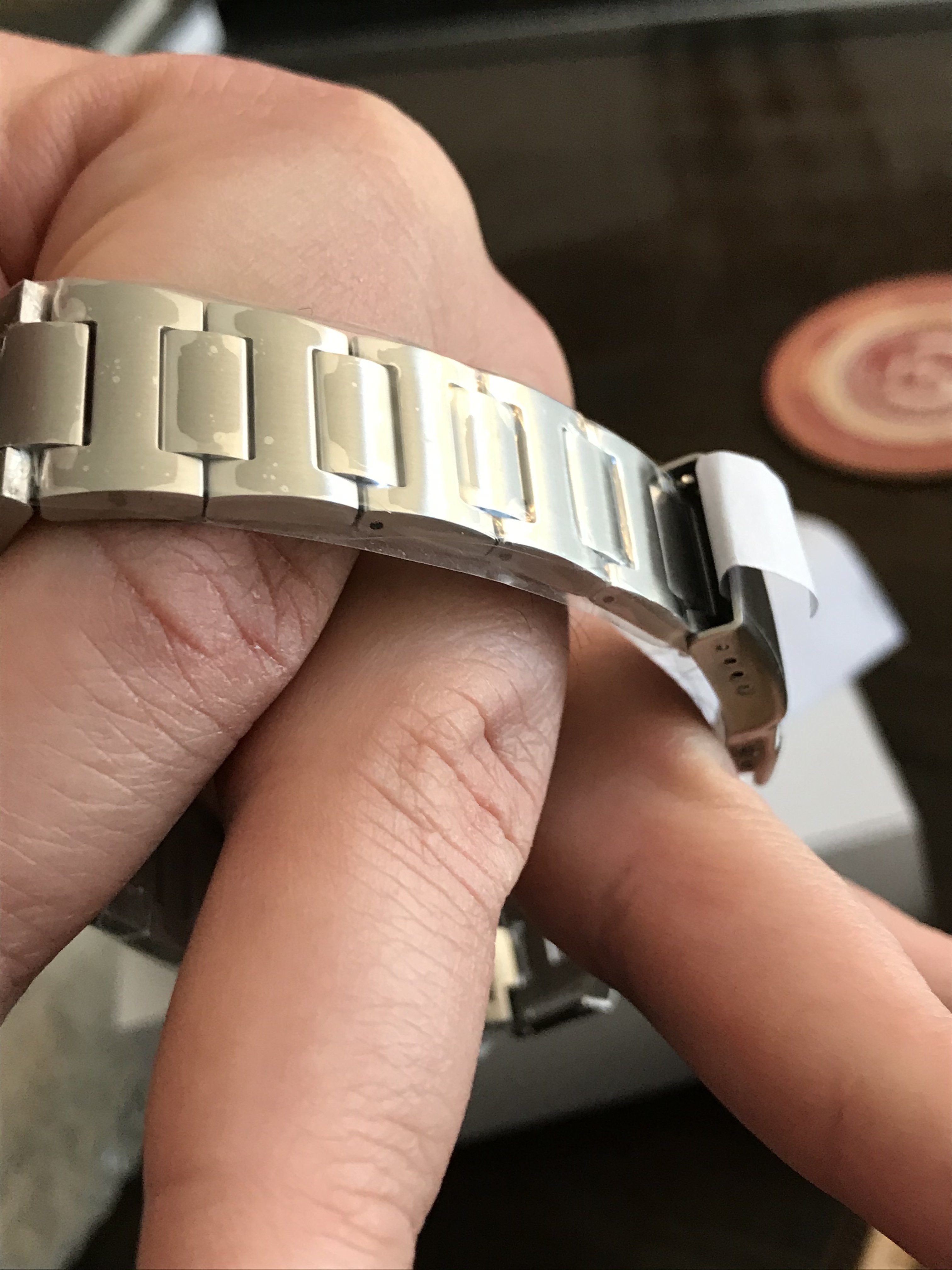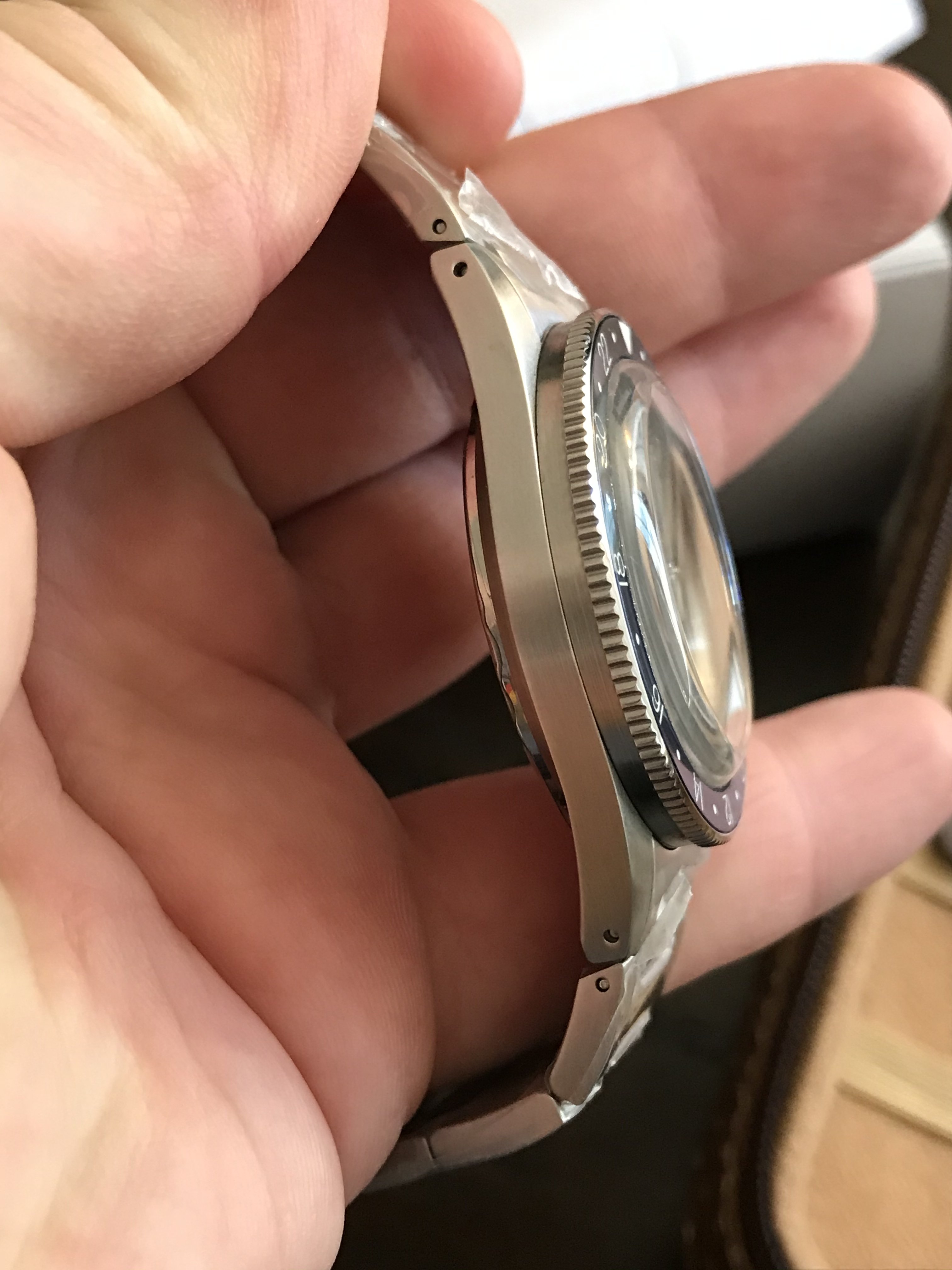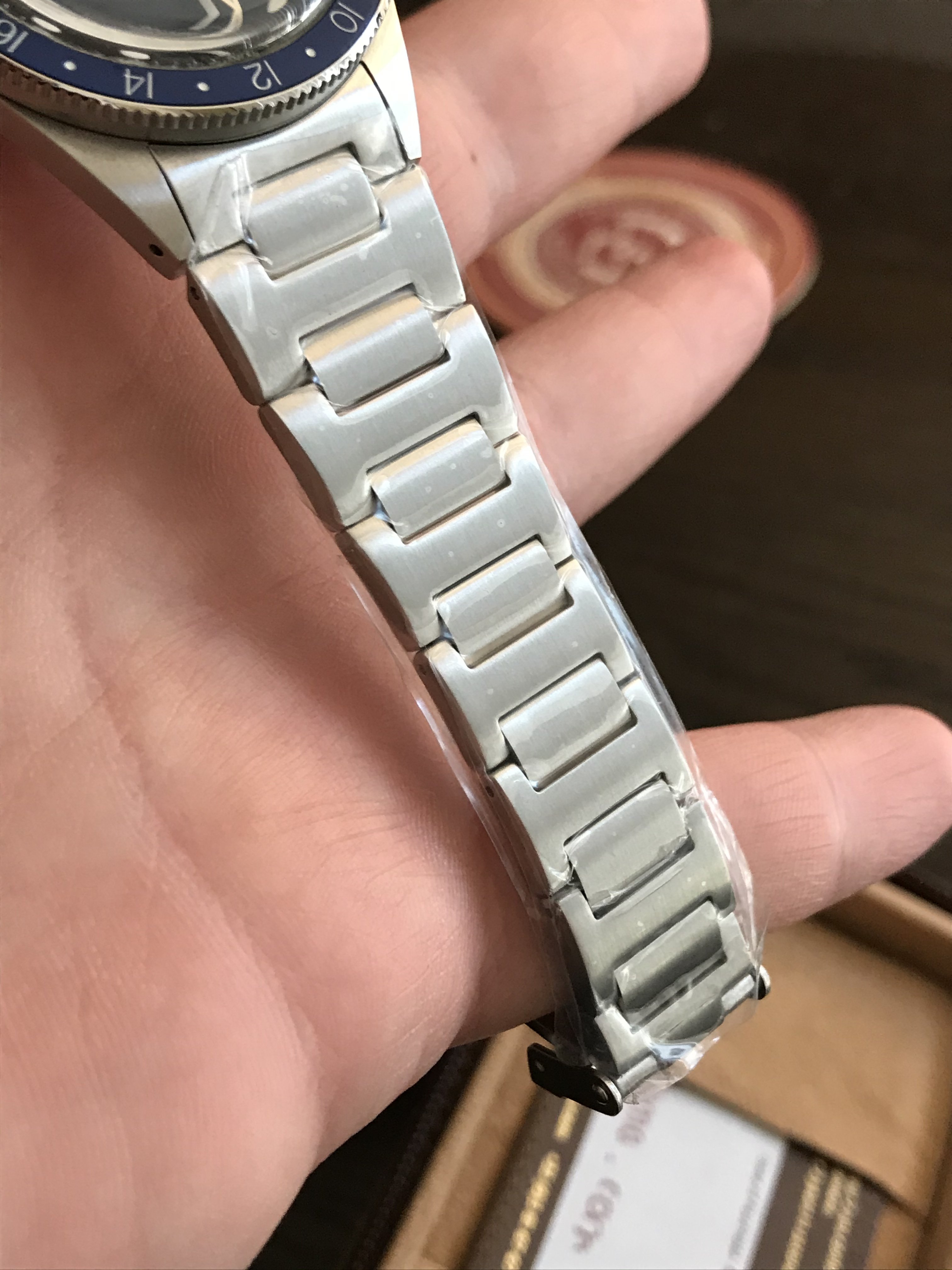 The watch is wonderfully thin, and the case on mine is essentially unmarked. The caseback sticker was left in place, and I never wore it on the bracelet so all the plastic wrap is still intact on that.