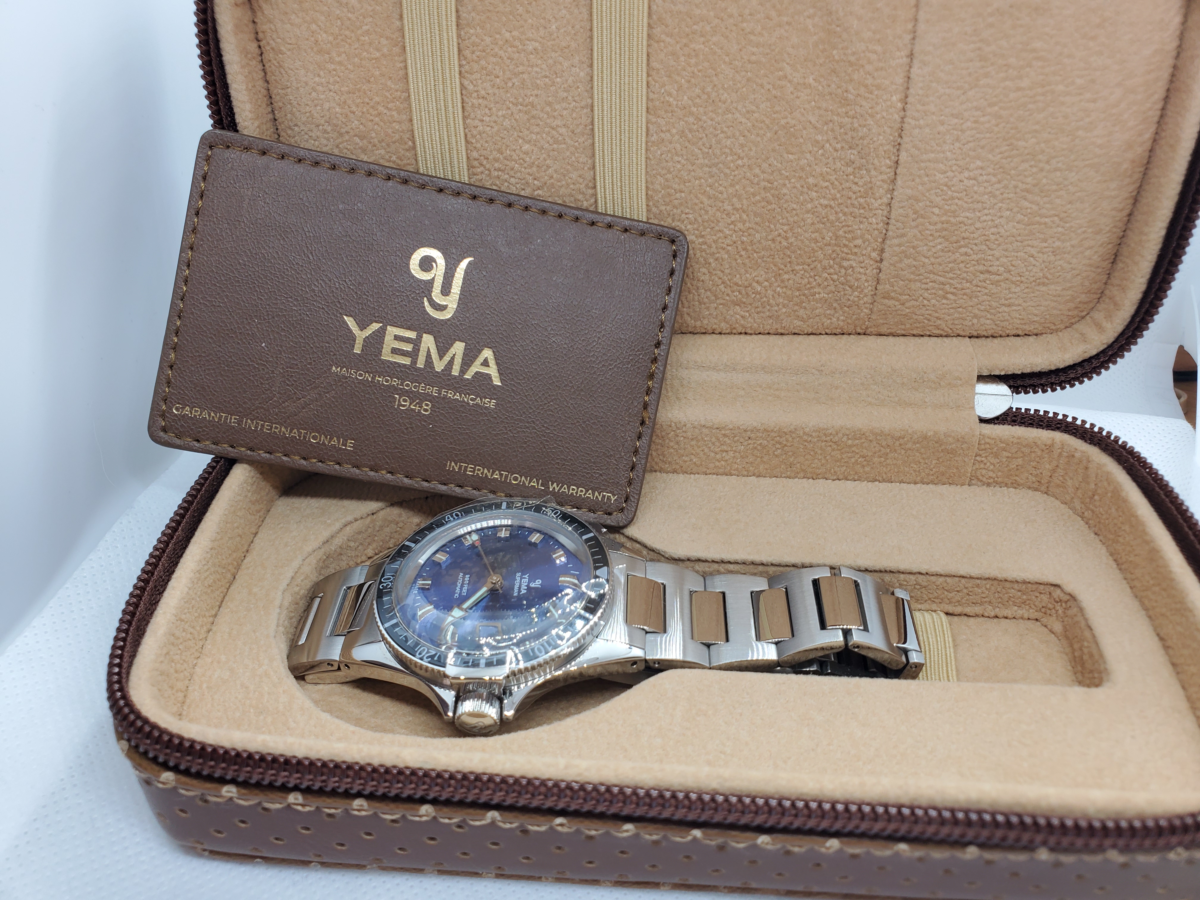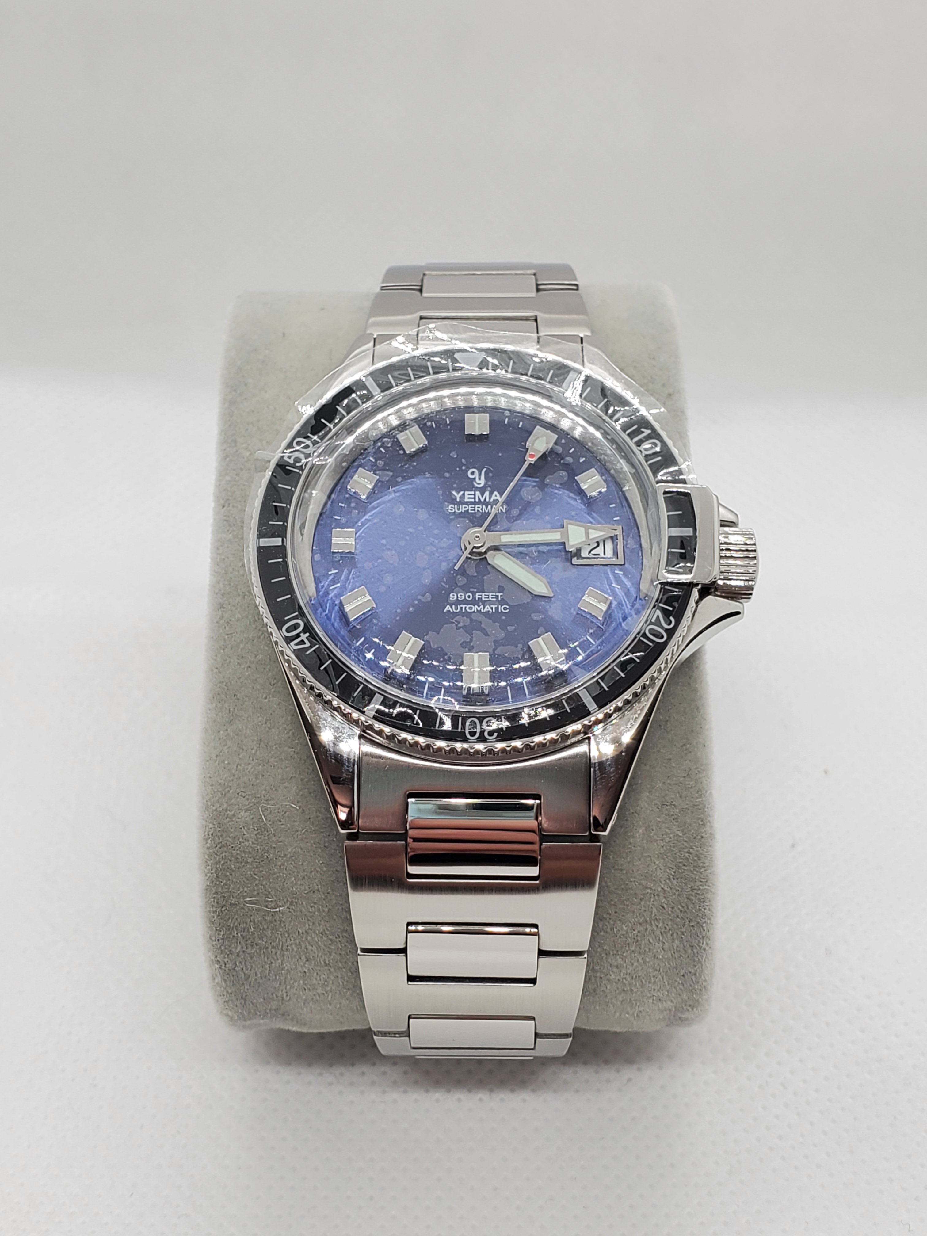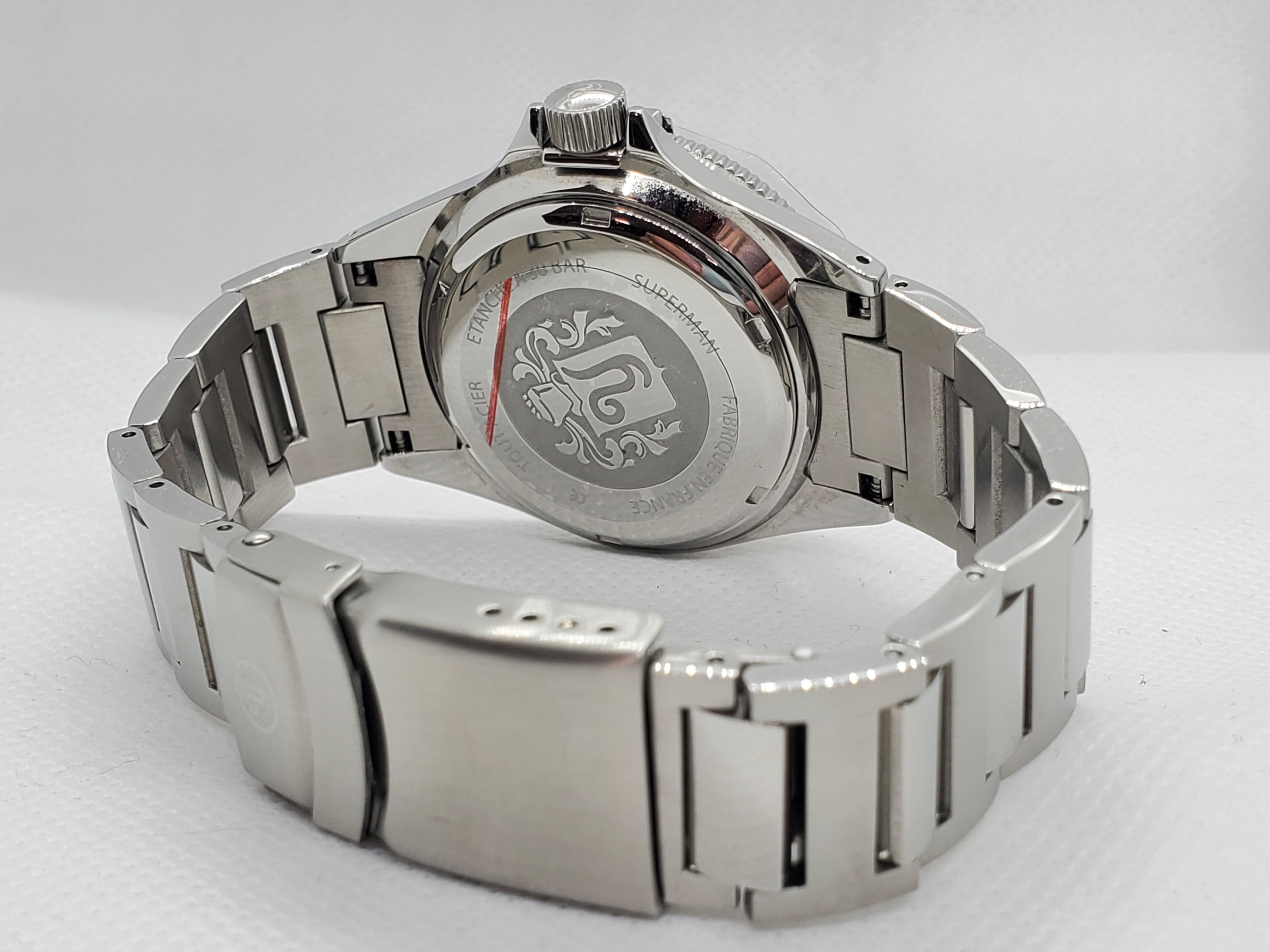 The sapphire, scratch-resistant bezel recalls the ancient glossy bakelite resin bezel. The steel case has been refined and slightly extended to accommodate a Sellita SW200-1 Swiss movement. With its emblematic YEMA bezel-lock mechanism and with a 990 feet / 300 meters water-resistance, the Superman is designed for underwater diving.
