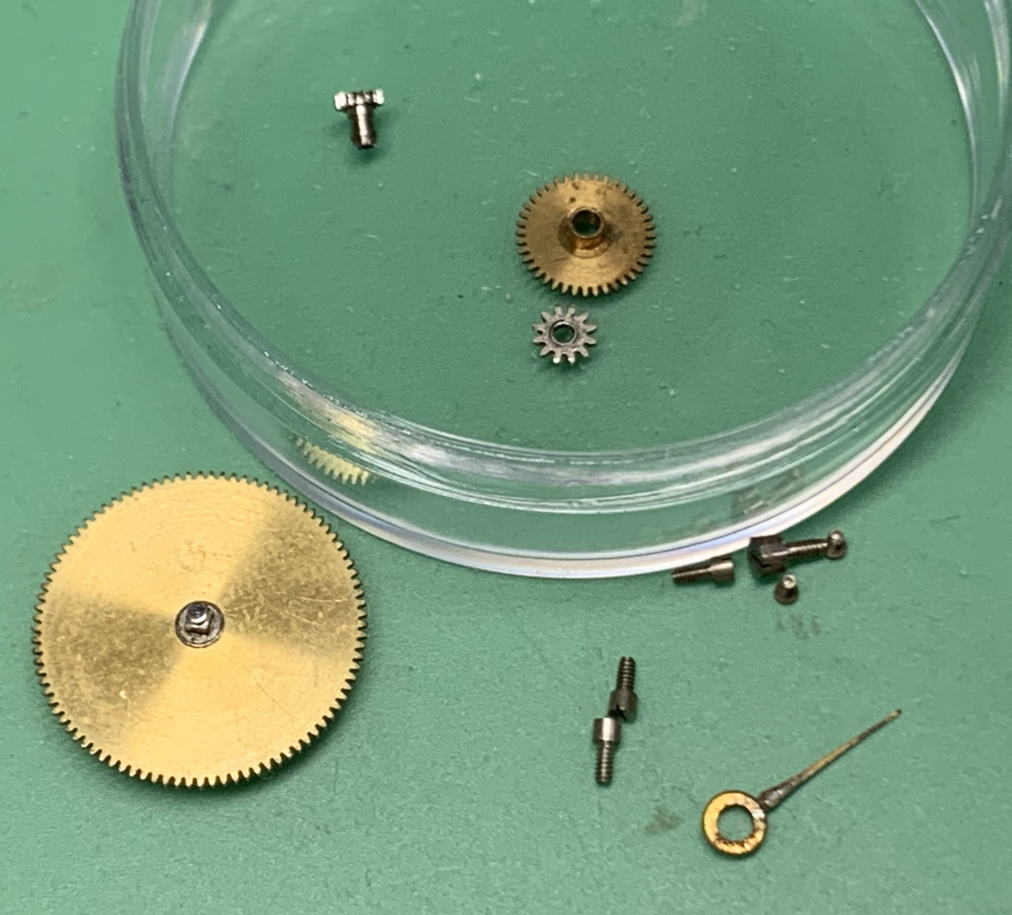Mostly screws. I think these are landeron bridge screws. The motionworks was not installed as there is no center wheel. Perhaps someone else though that barrel might fit.