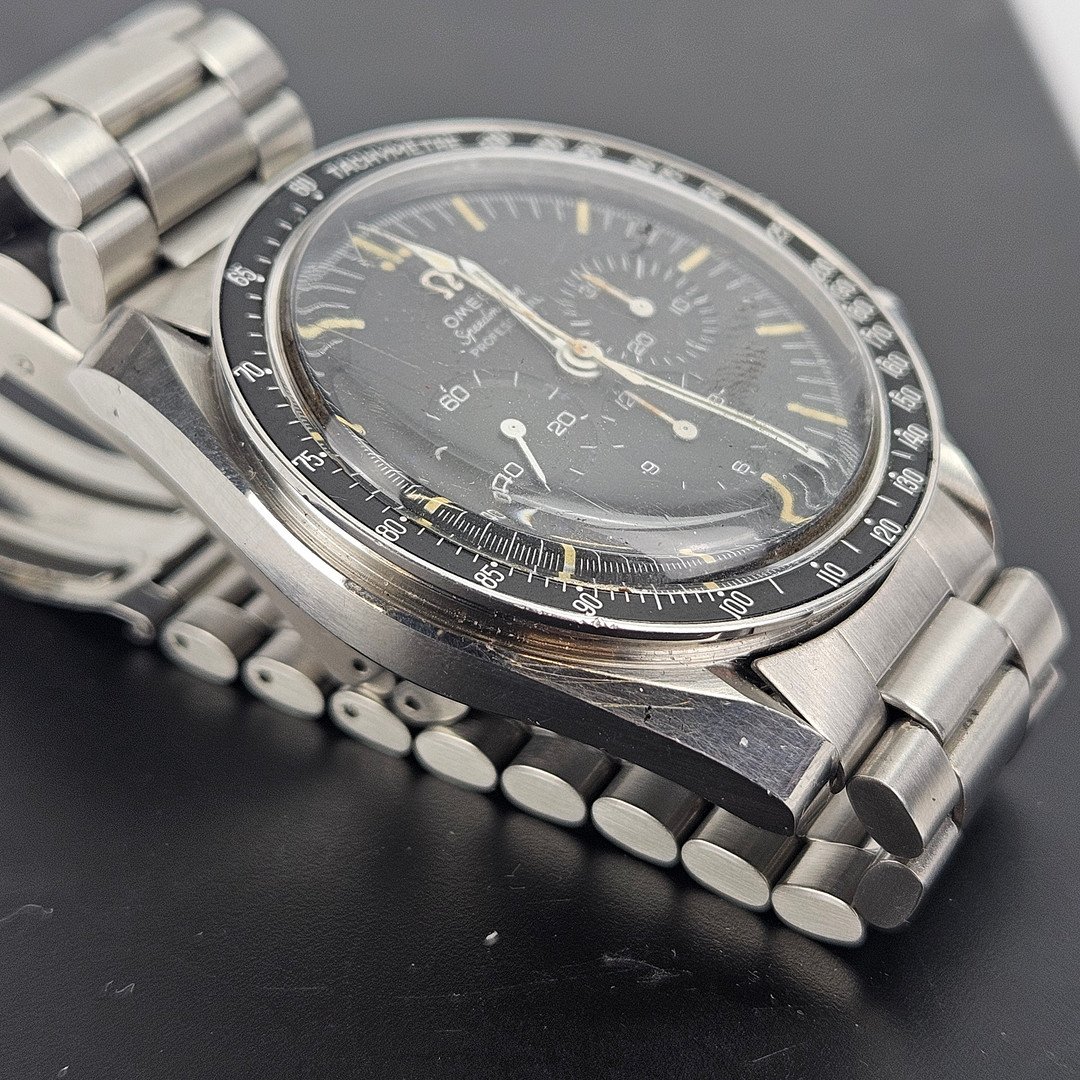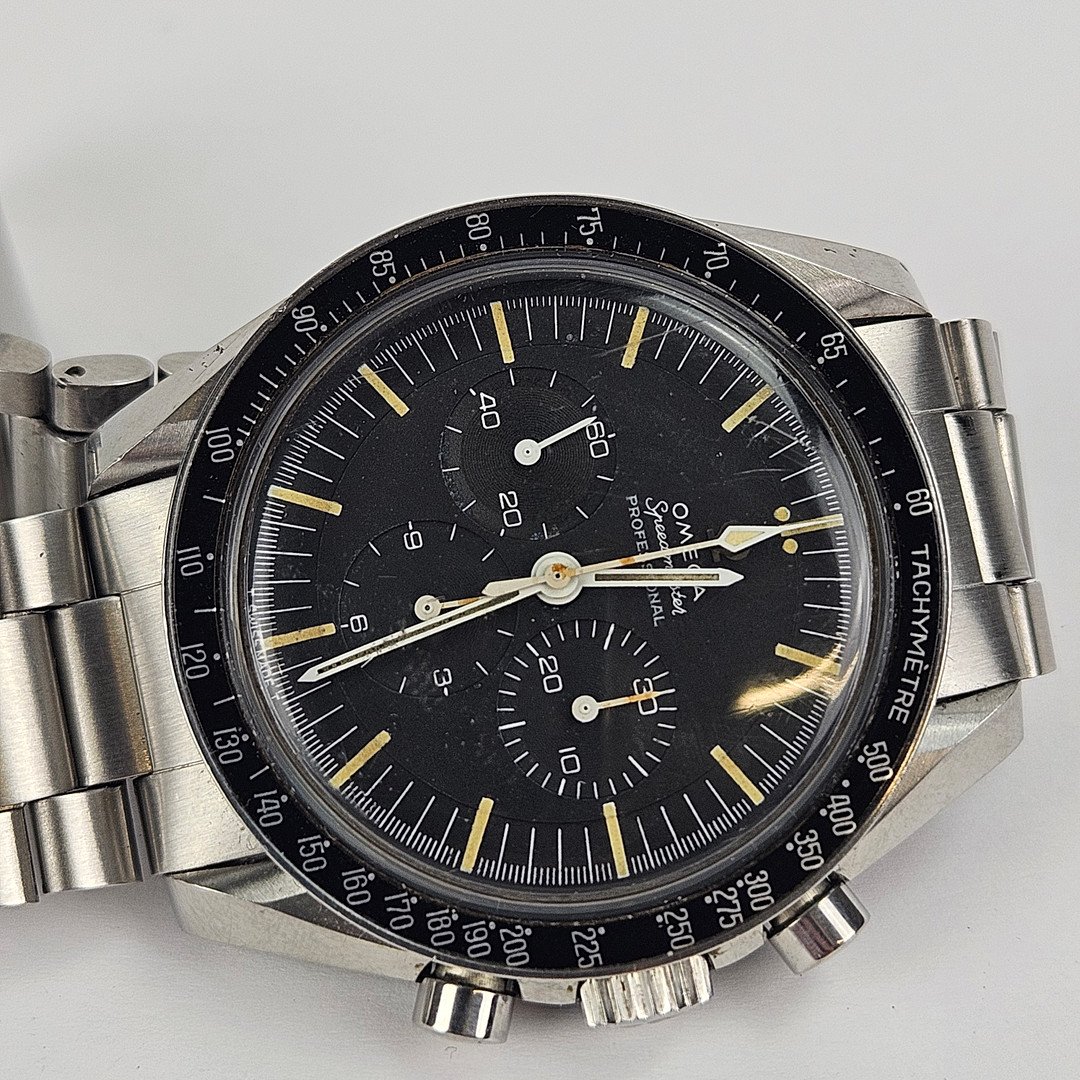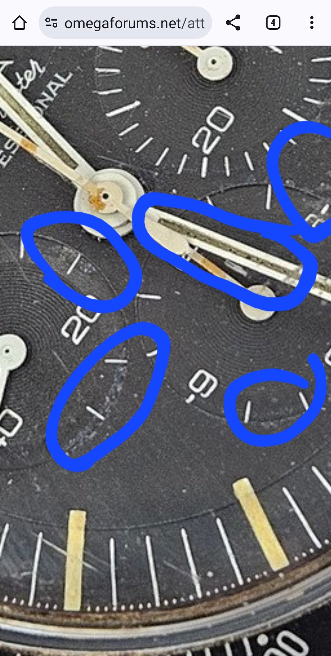 looking at this 105.012 66 coming up for auction ( dibs ! 😀 ) which has very good cosmetics to me, sharp case, good bezel and i think correct fat & low pushers. Lume looks good but the dial is a bit grey maybe ? Looking from the side the damage all appears to be on the crystal although some spots can be seen in the seconds register.