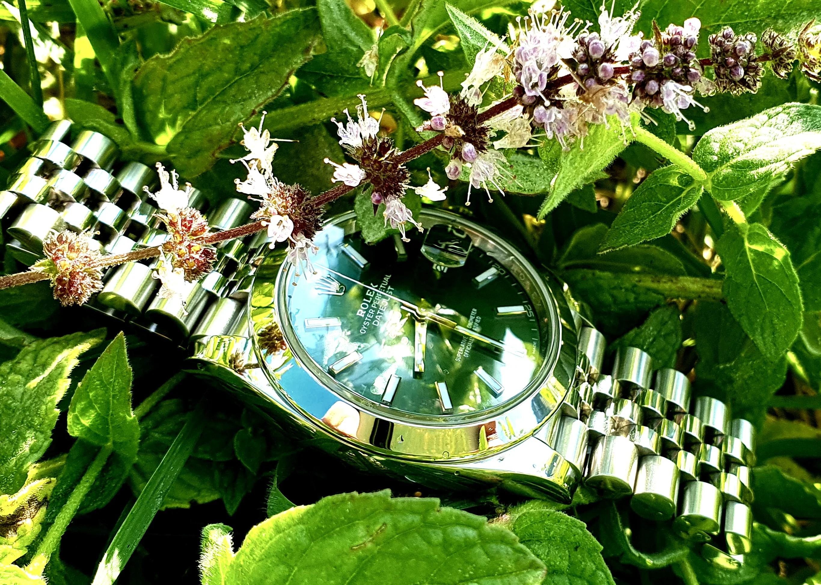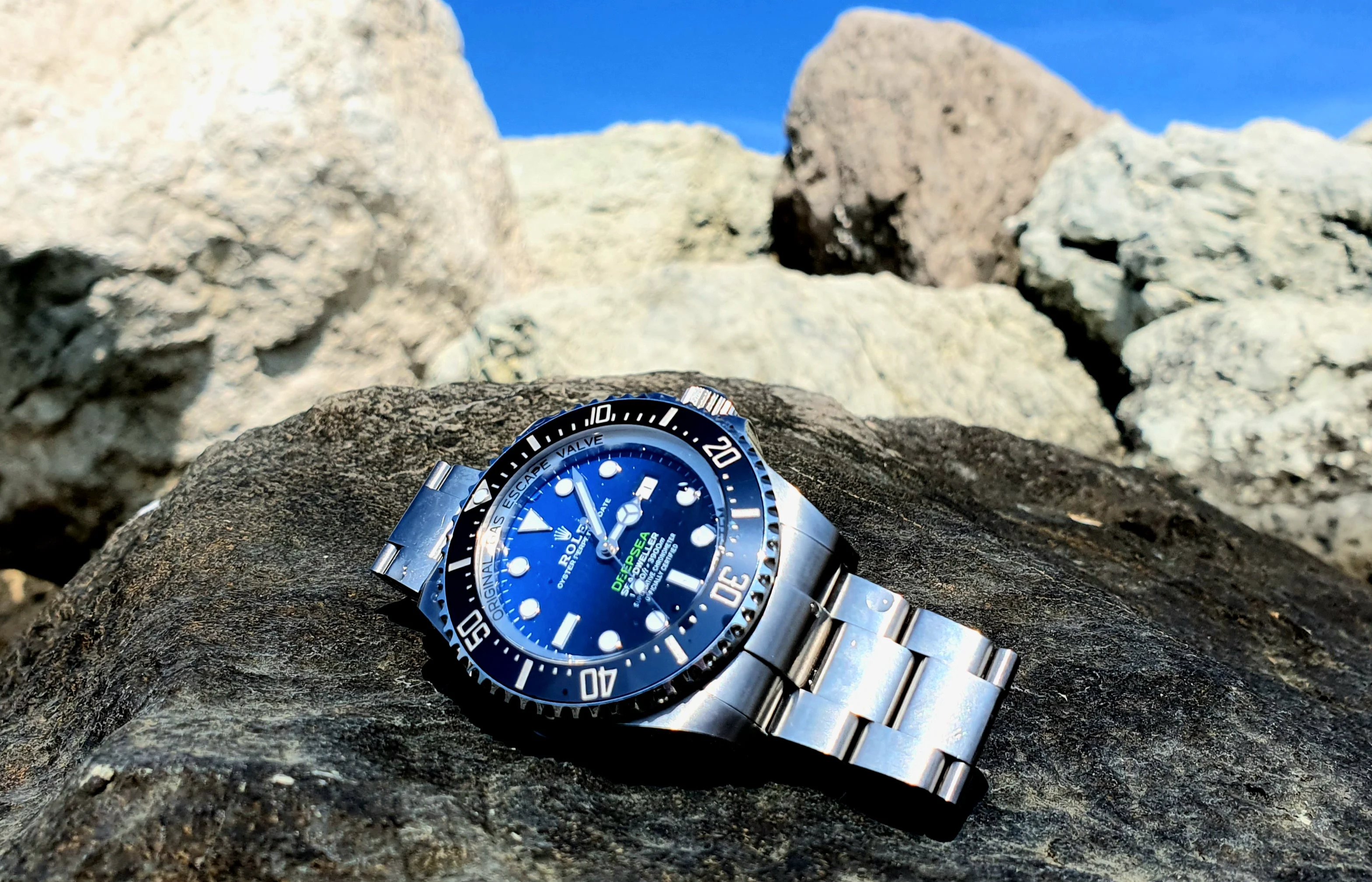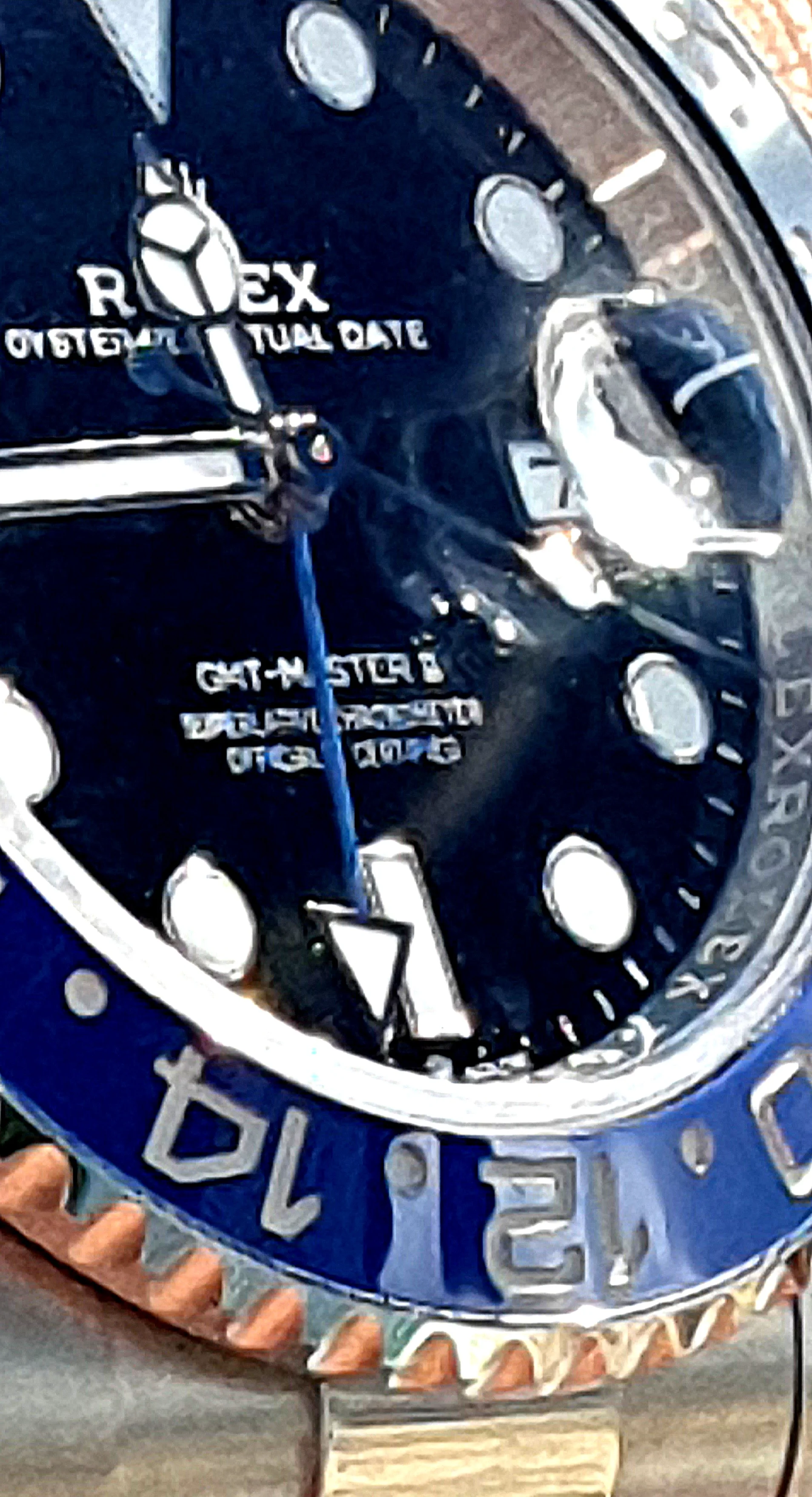 This shot has just the right amount of reflection. It could be better - I could have gotten a better angle so the date shows in the cyclops evenly - but it shows off the dial furniture nicely.