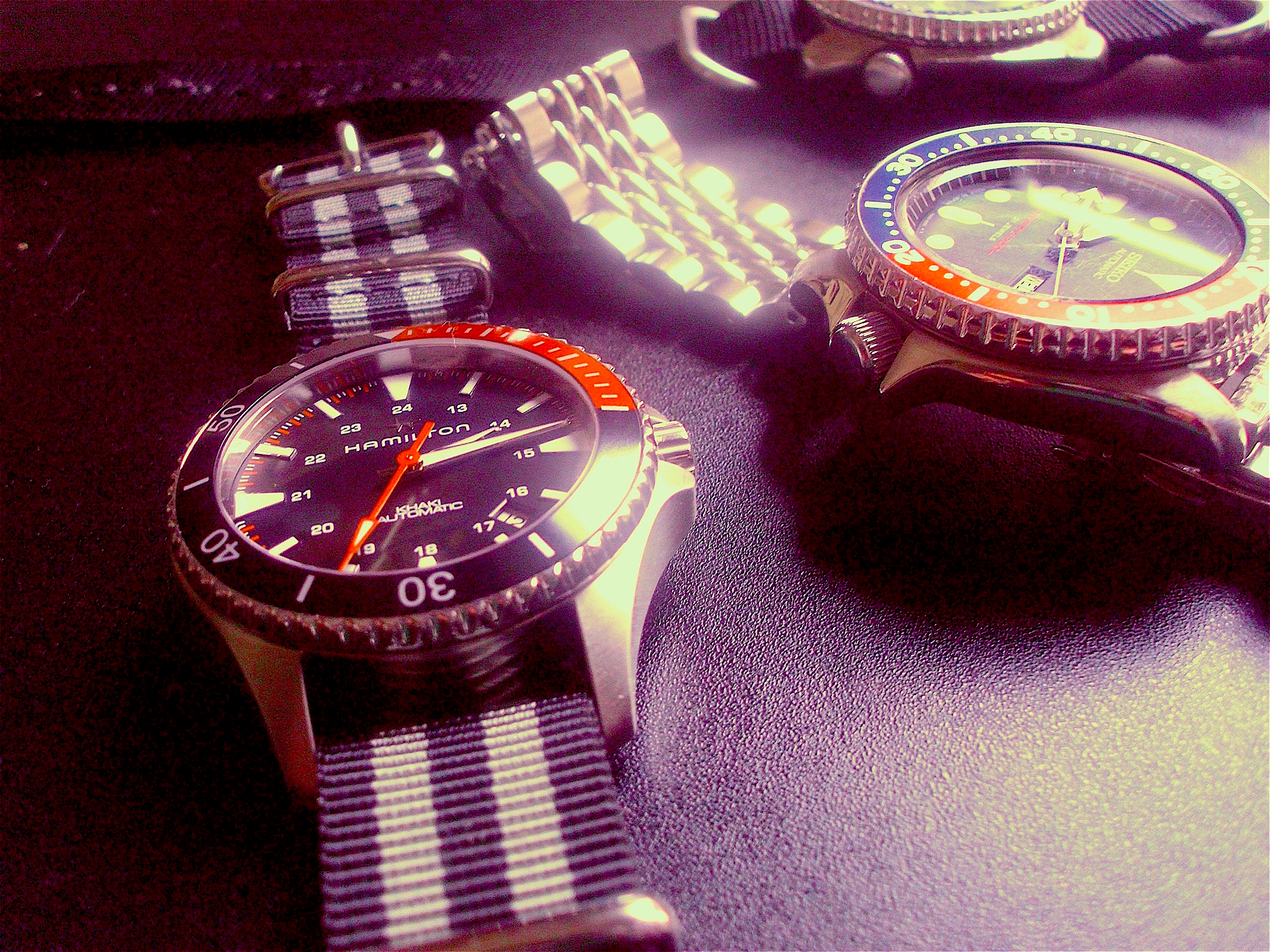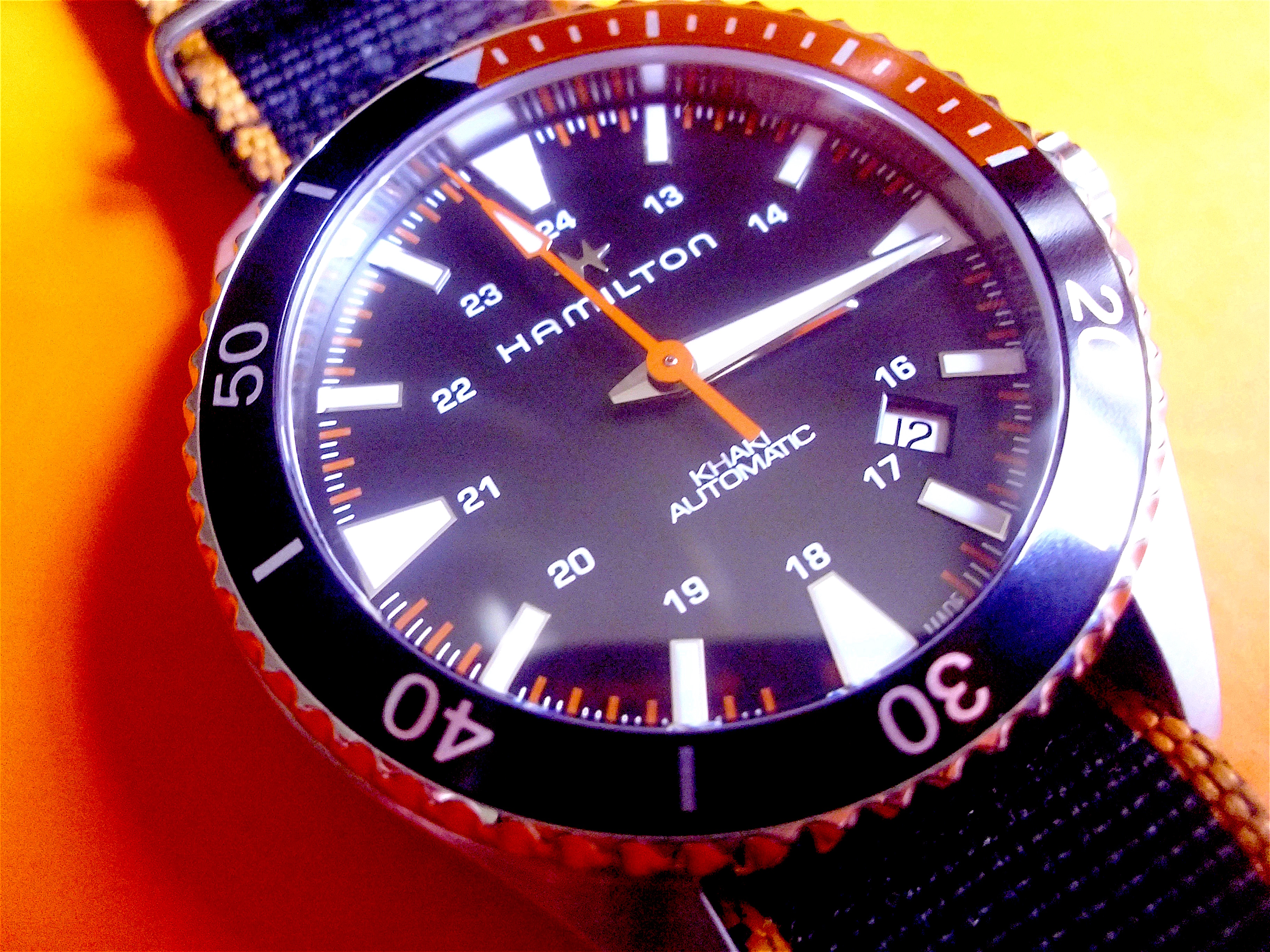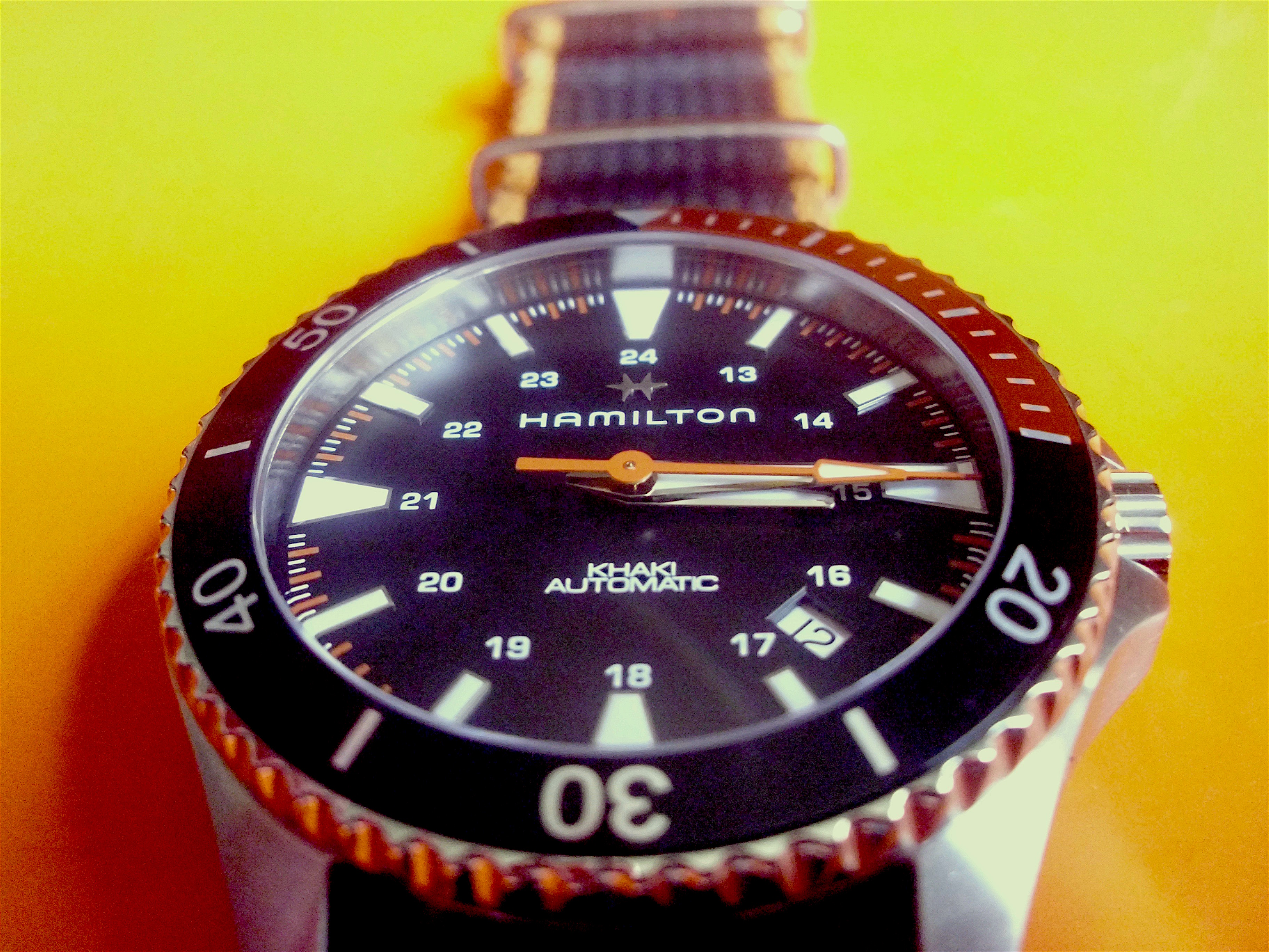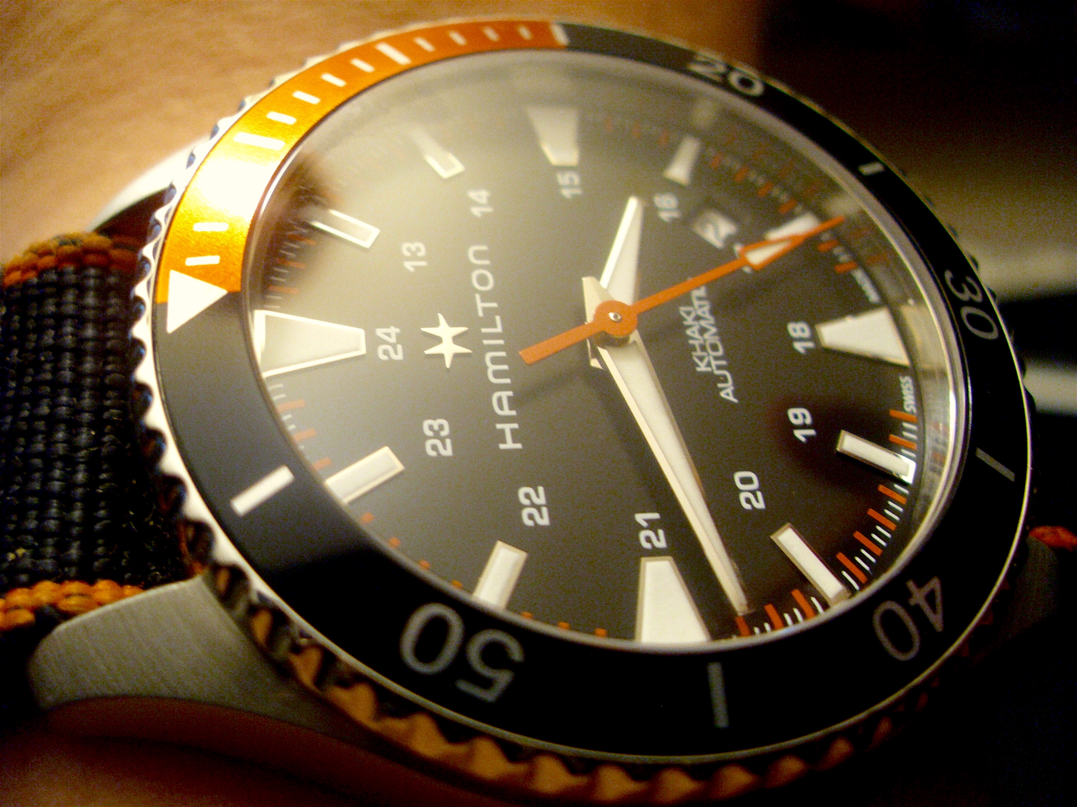Posts 3,430 Likes 17,437 hmmmcamu ·Jul 12, 2017 Hamilton Khaki Navy Scuba Automatic 100m [330ft.] Ref.# 82305931 40mm case 20mm lugs. Orange and Black bezel 80hr. power reserve H10 movement by Hamilton Edited: Jul 14, 2017