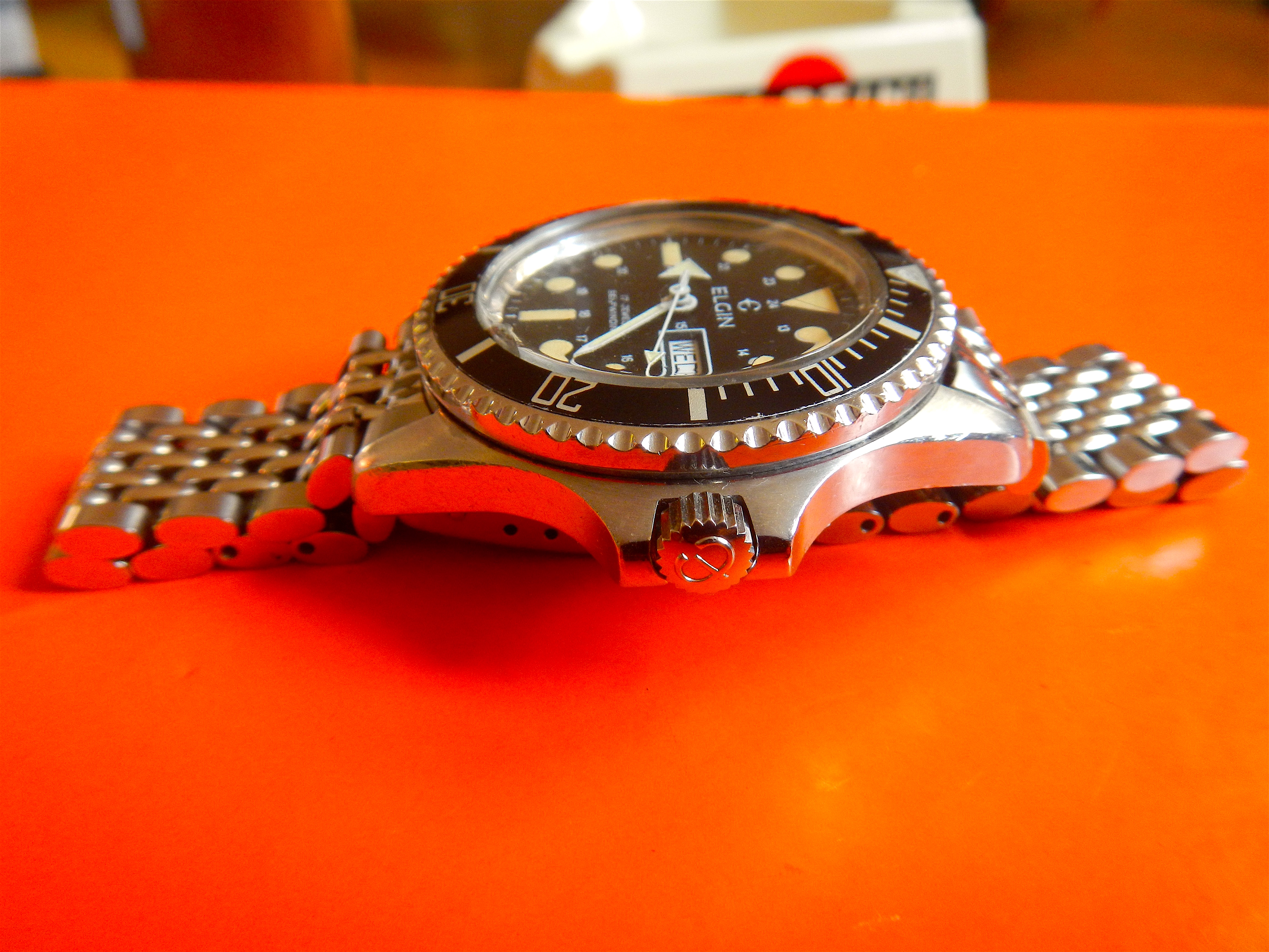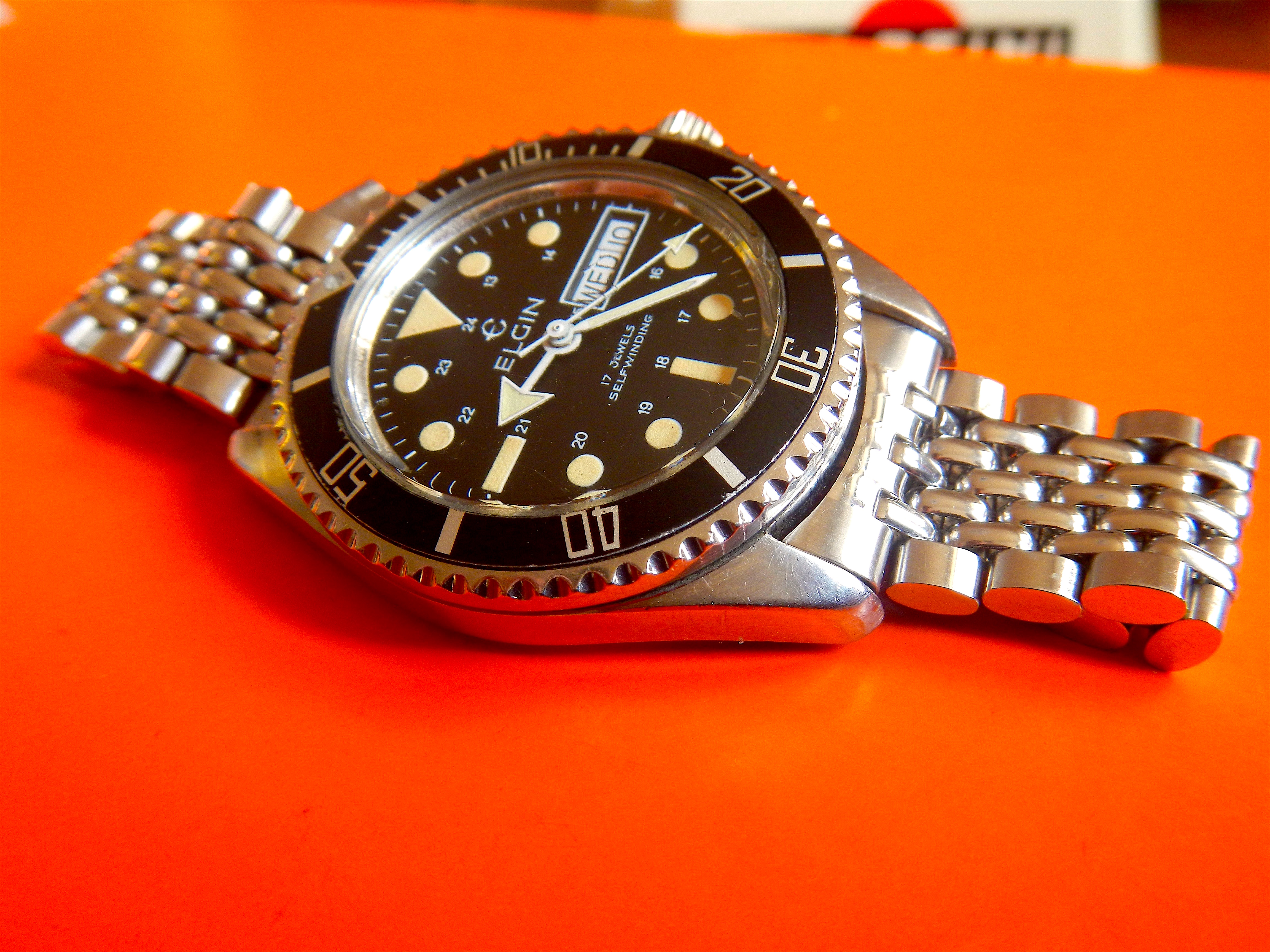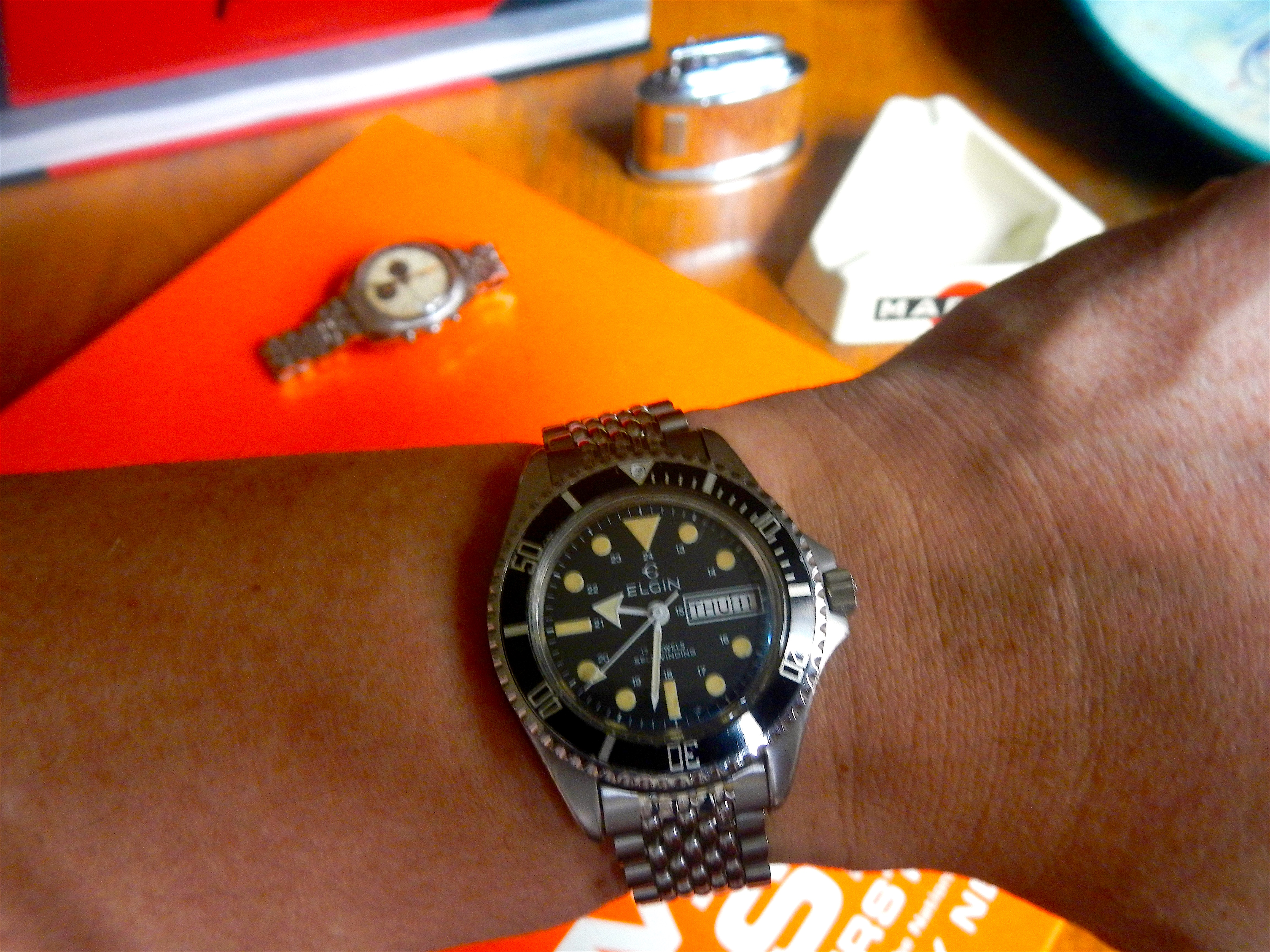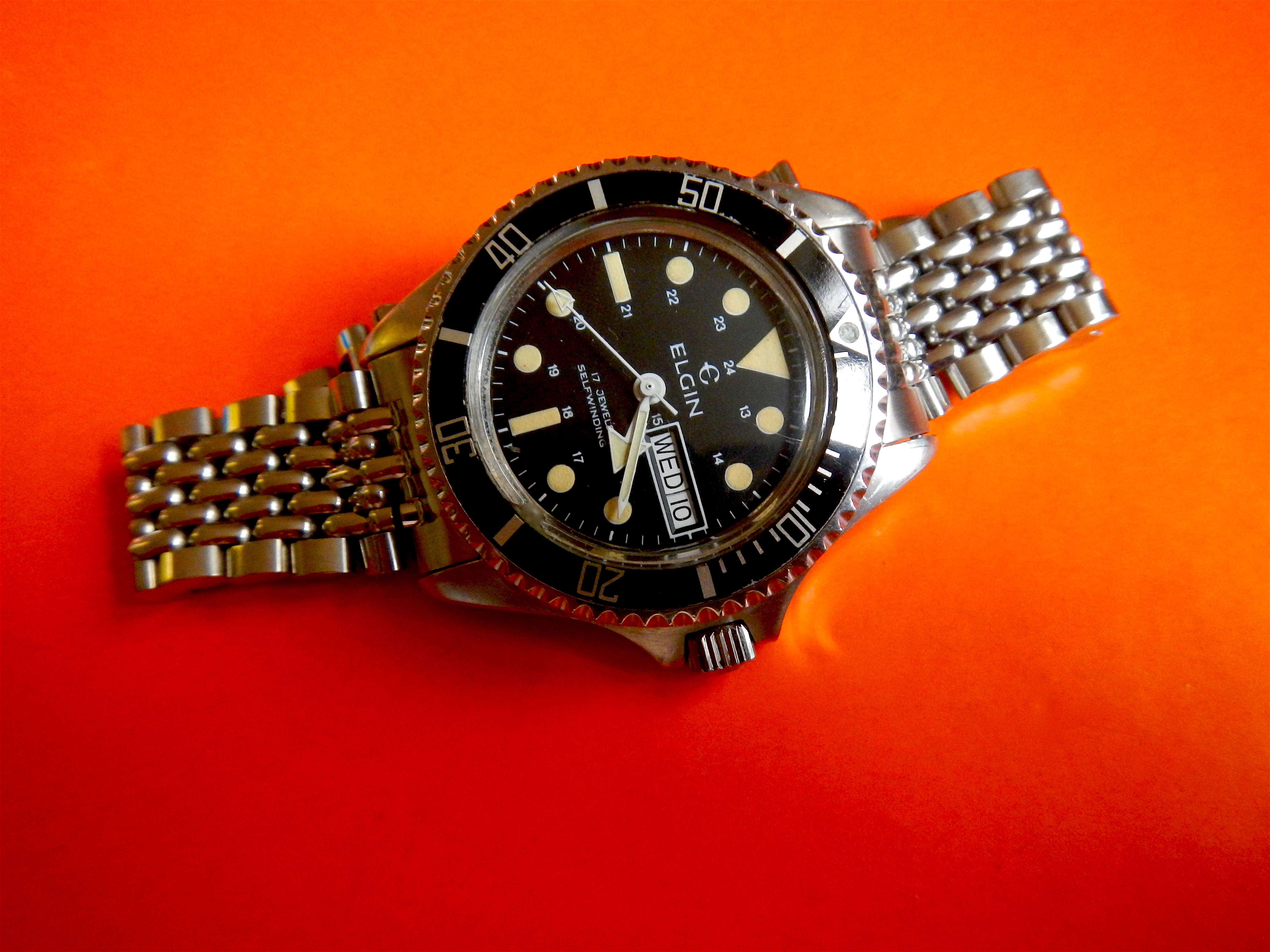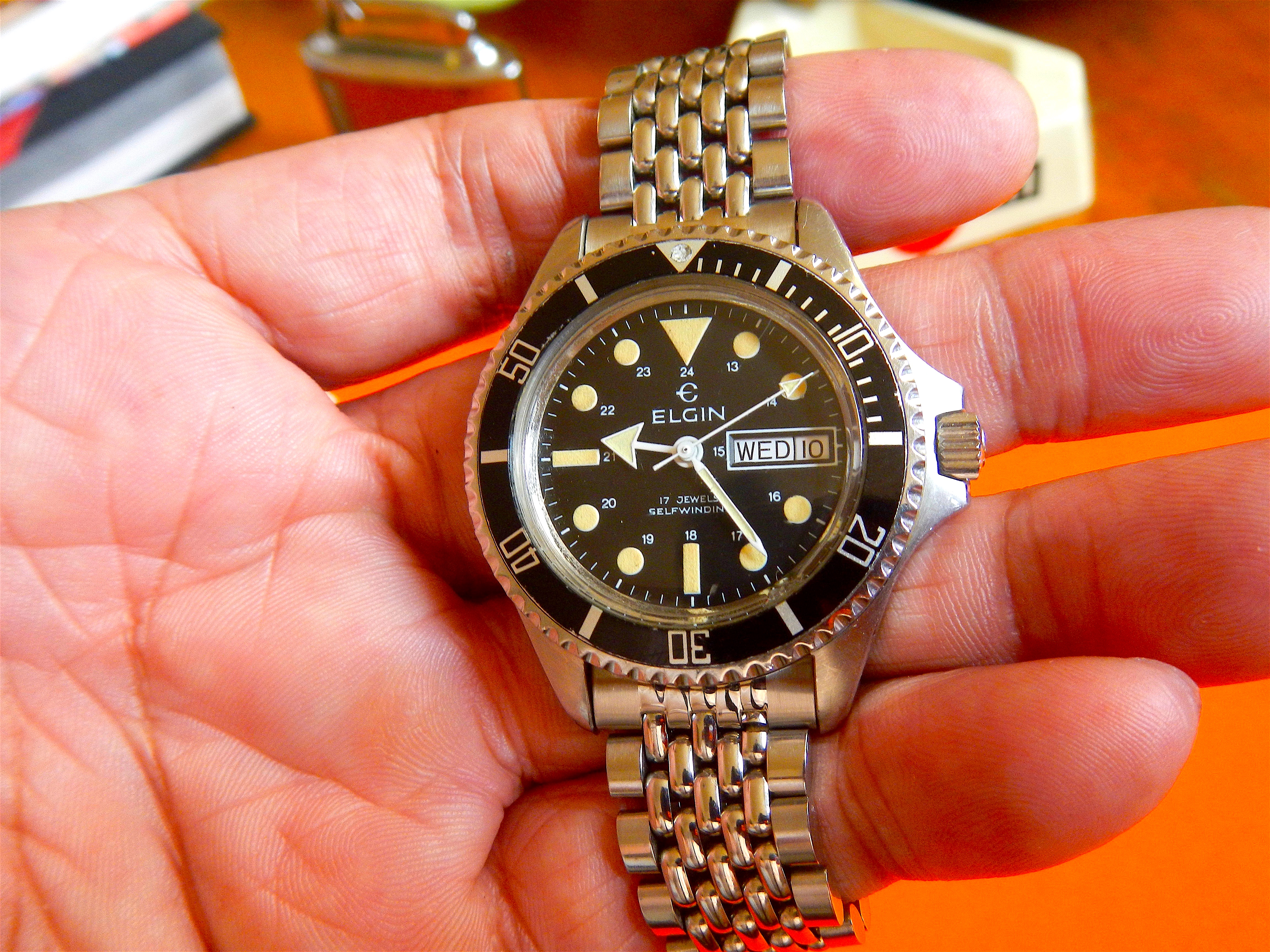 Posts 3,432 Likes 17,459 hmmmcamu 路Oct 11, 2018 Vintage Elgin 20 ATM DH113-2879 Day-Date Milsub diver 660ft. ETA 2879 [day/date] manual and autowind screw down crown, 60 click unidirectional dive bezel circa 1970's Edited: Feb 11, 2019