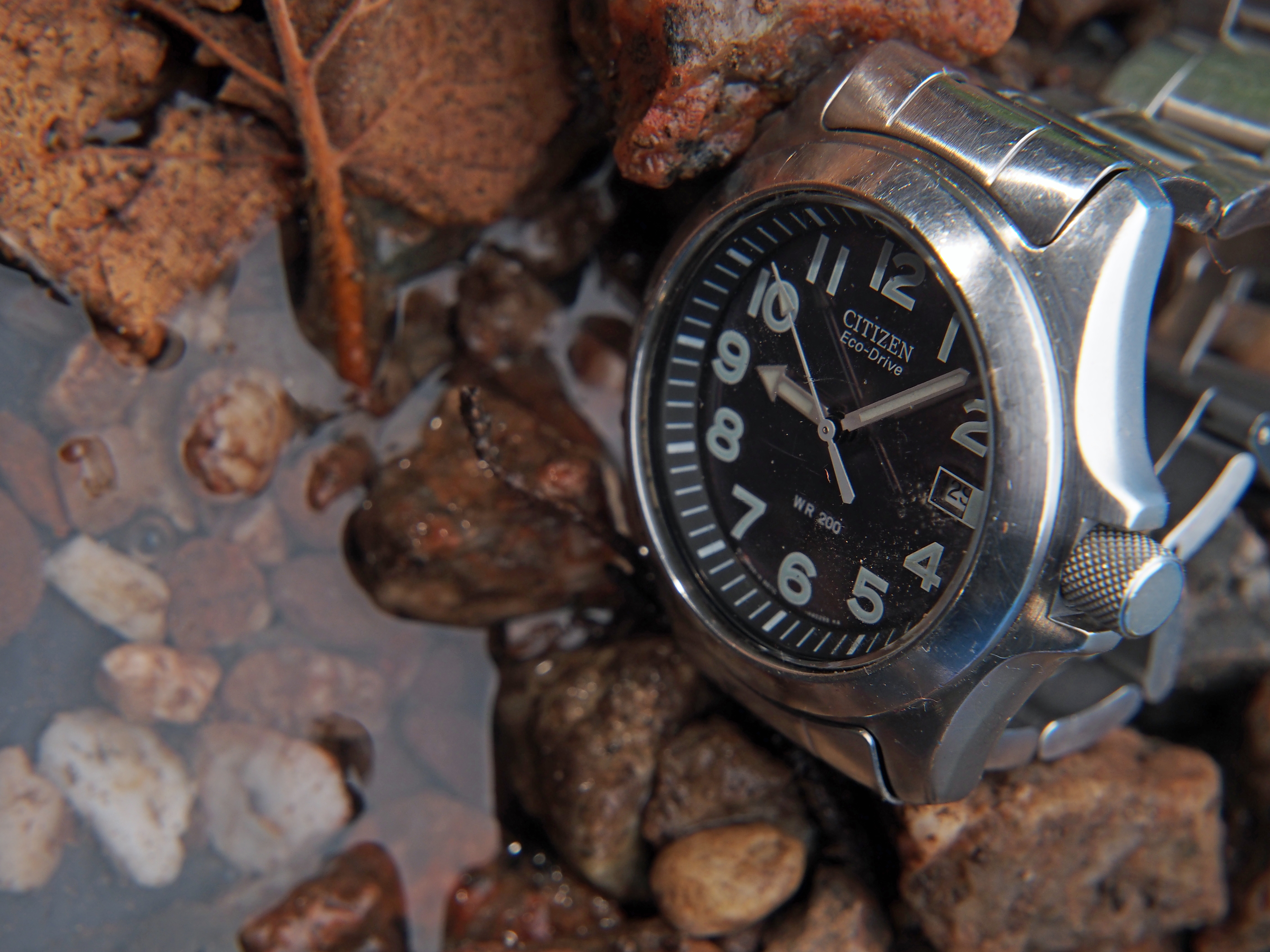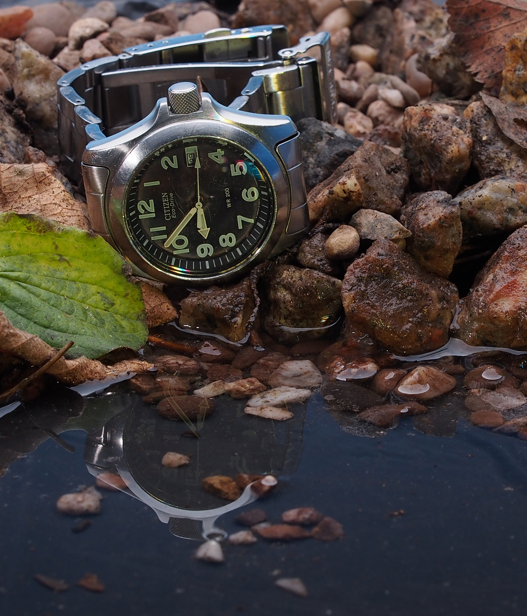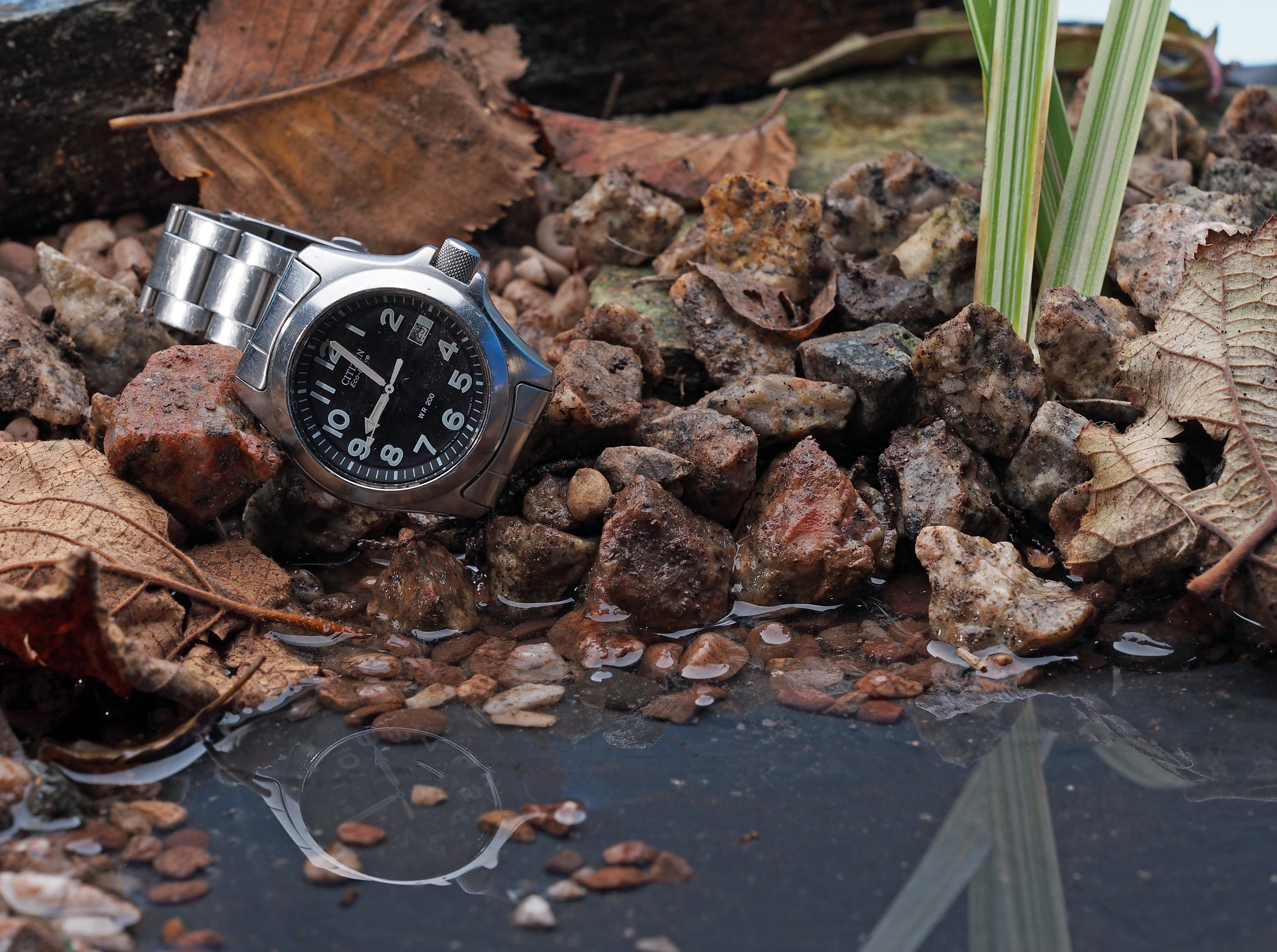 Shallow baking tray covered with a black bin bag to hold the water, gravel and stones from the path outside, plus a few fallen leaves.