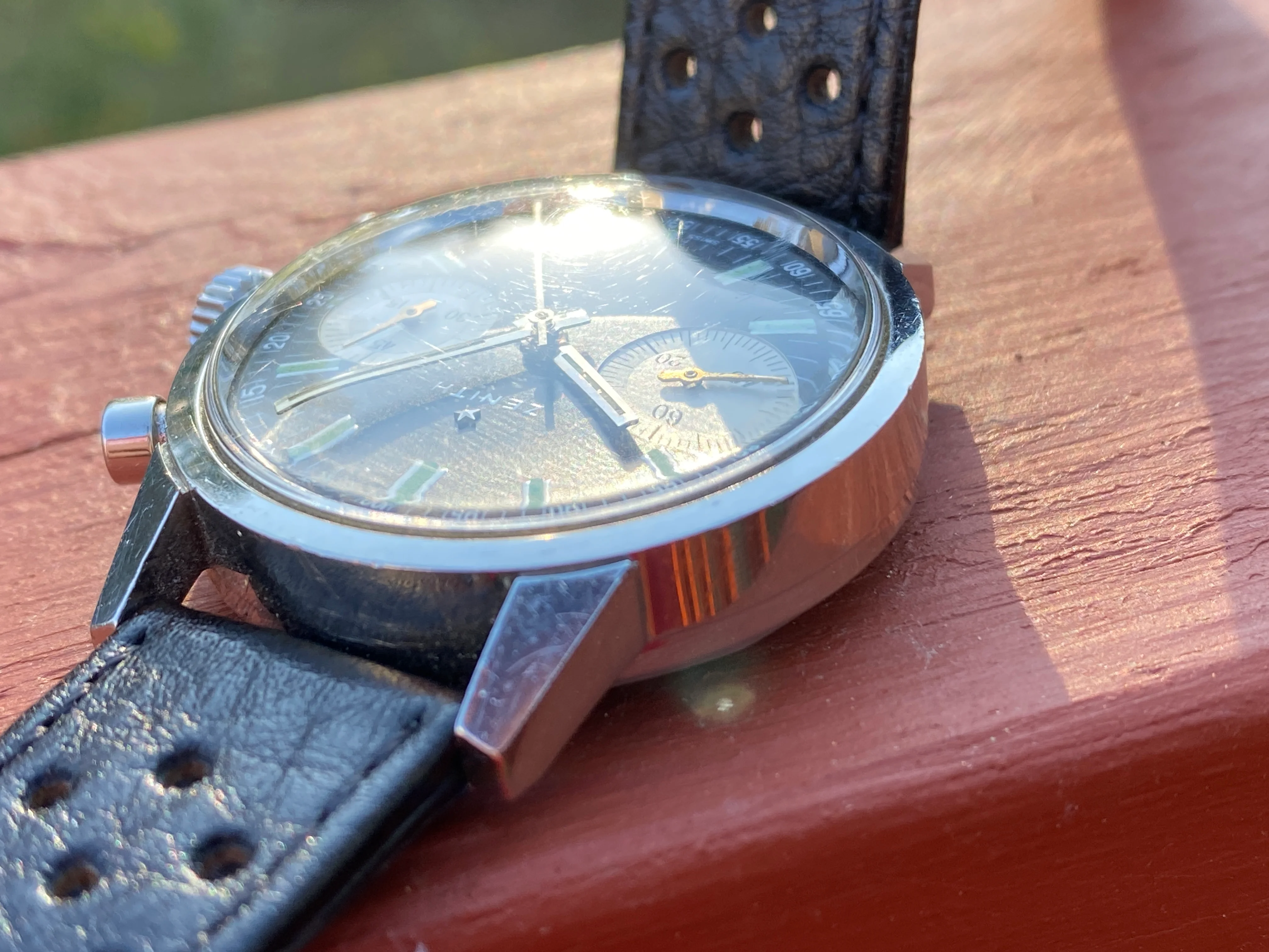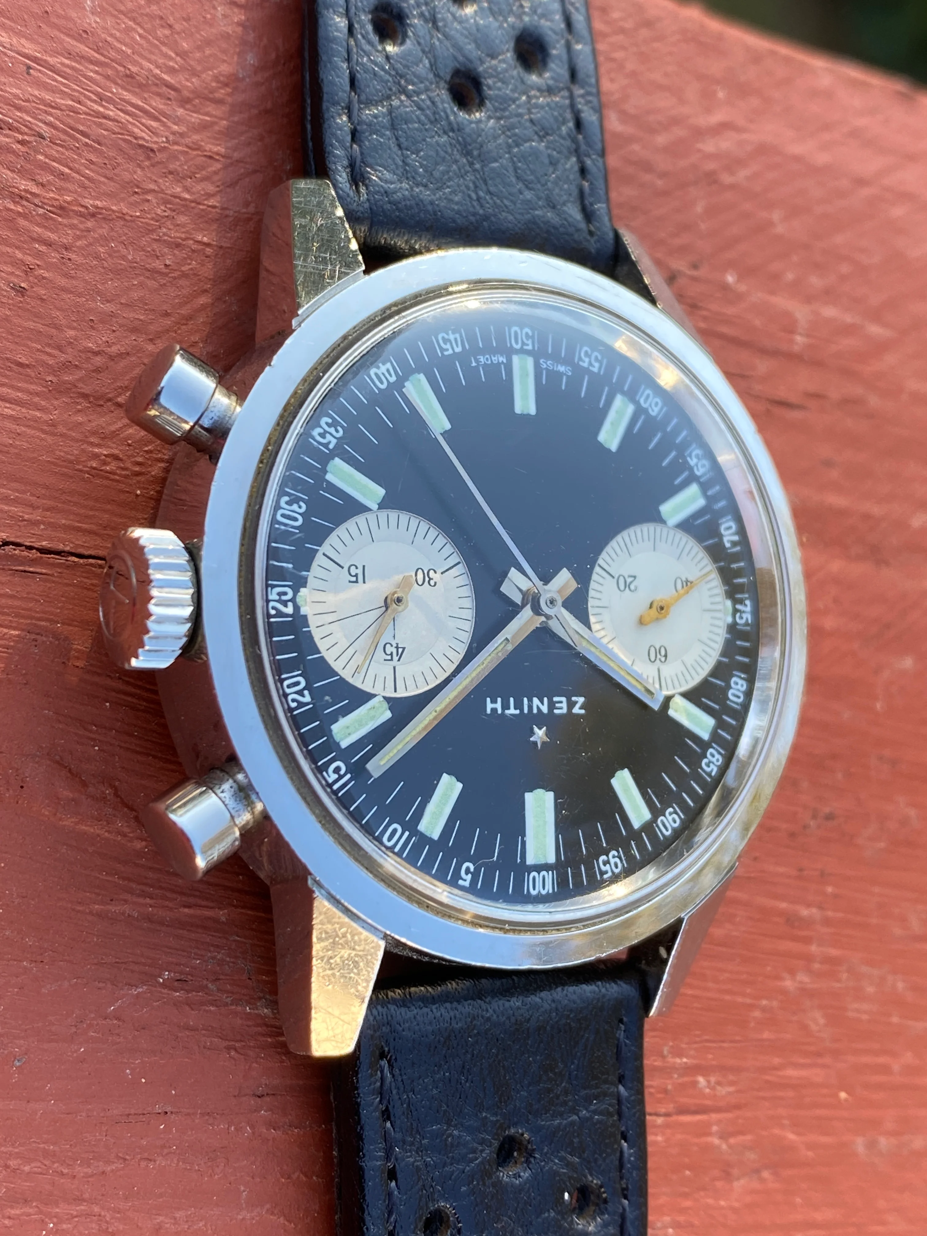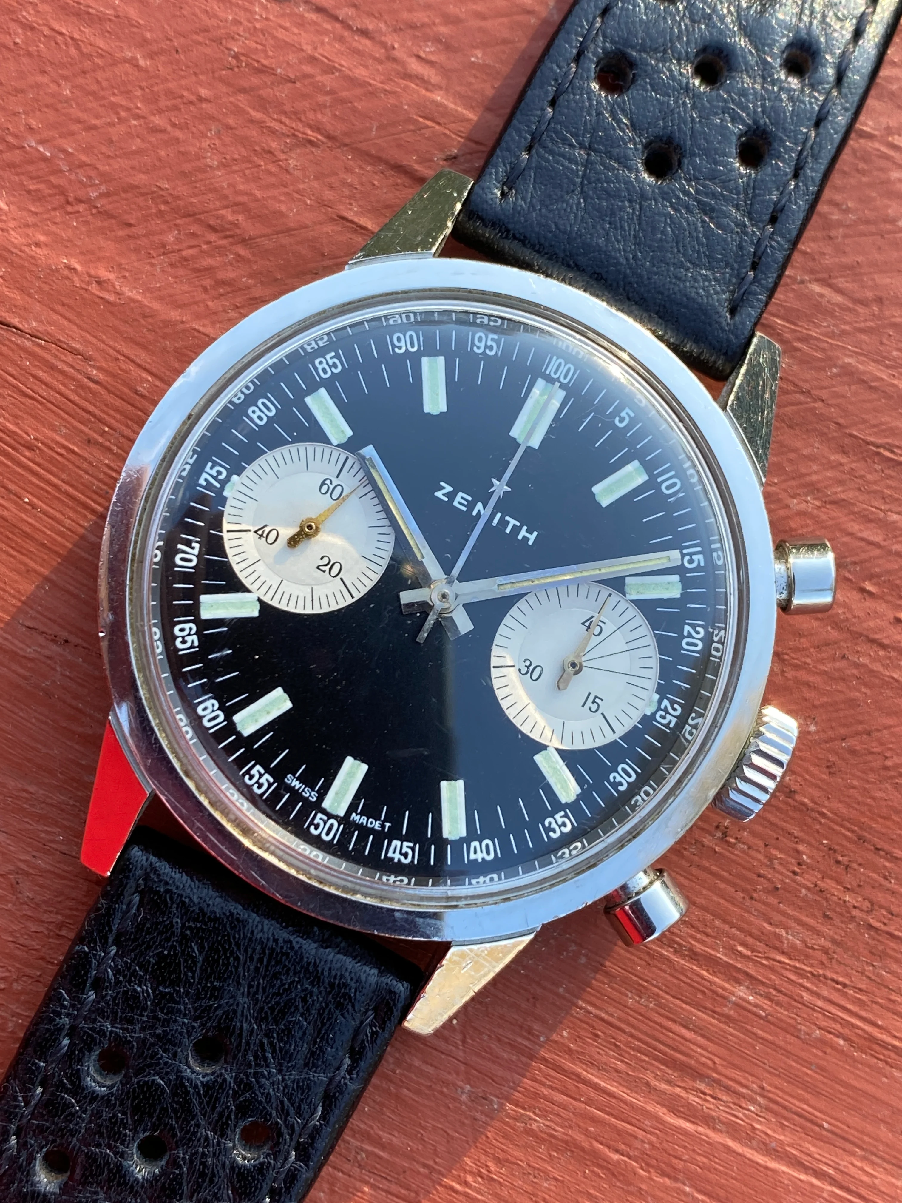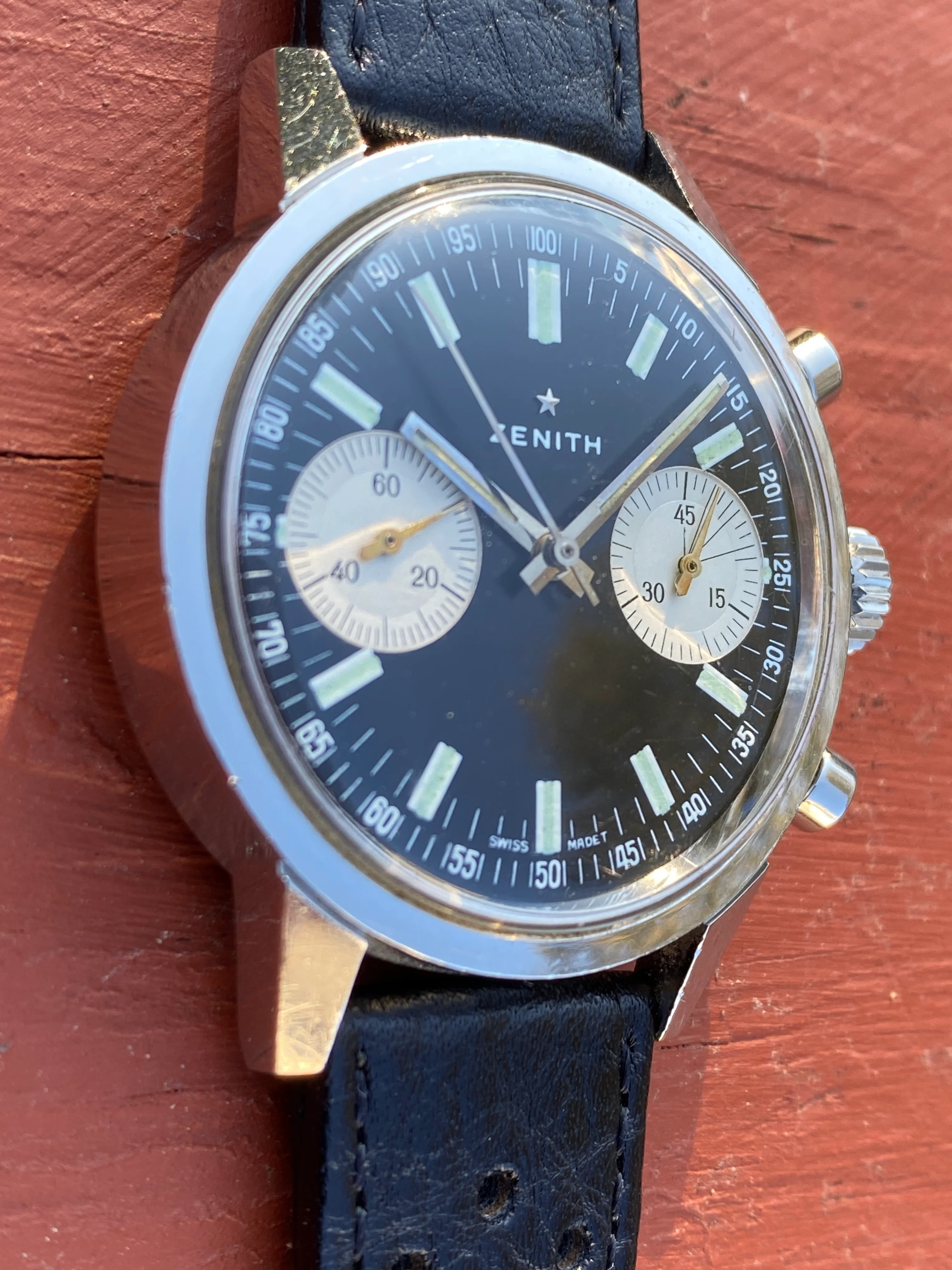 Service history for this watch is unknown, but as one might expect, it winds and keeps time very well. The 45-minute register chronograph functions very precisely and the sweep central hand resets to 12.