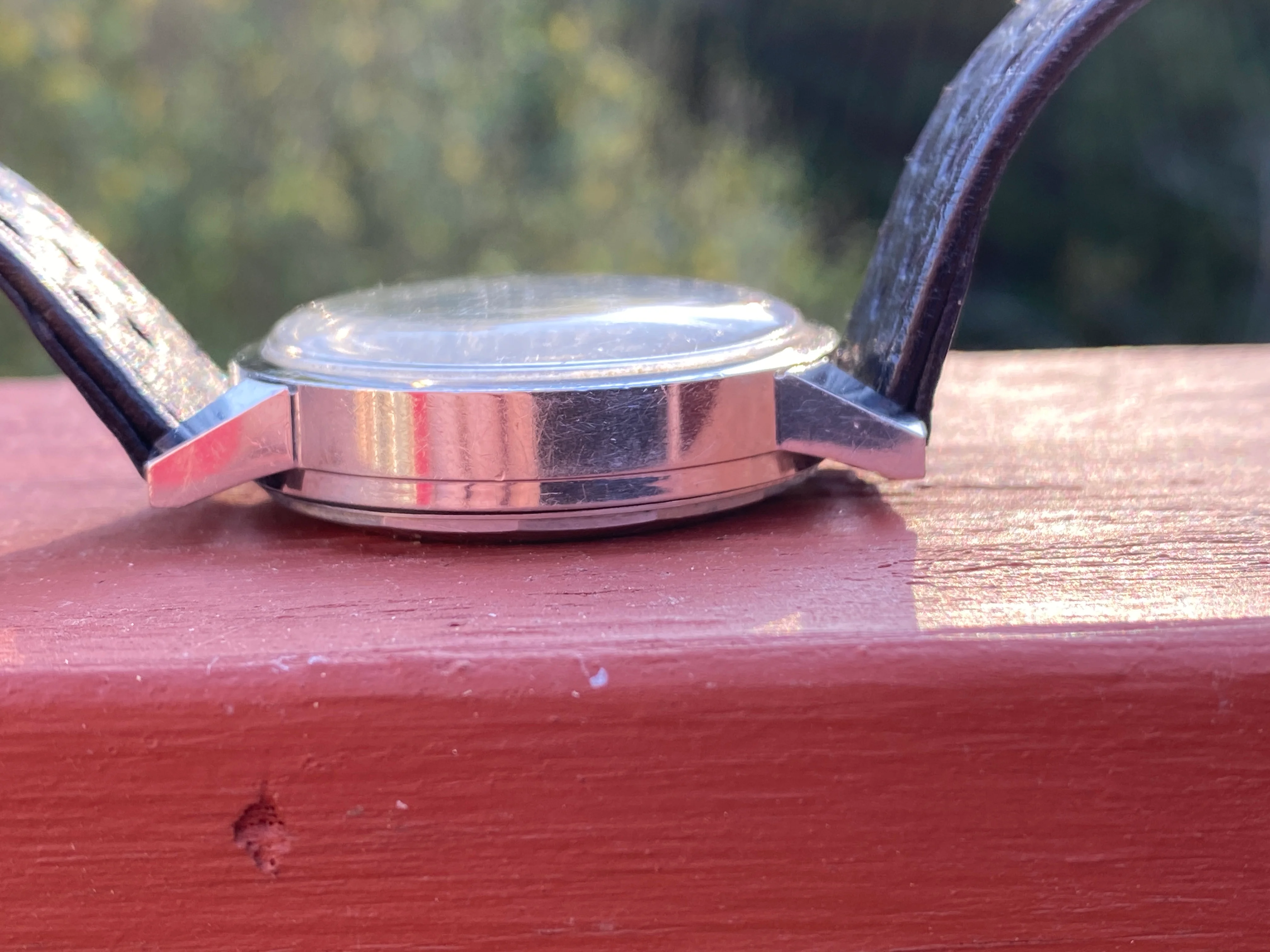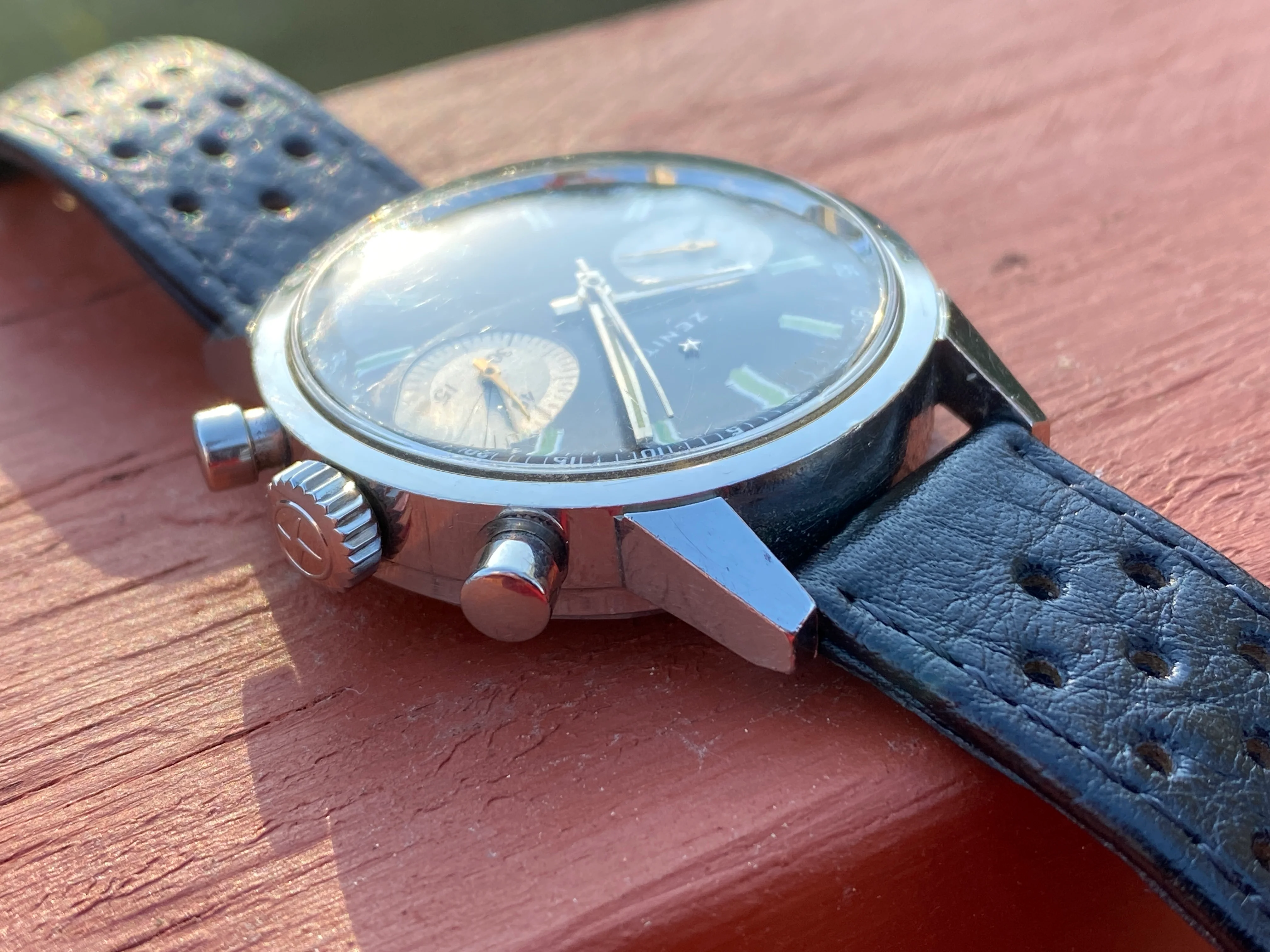 The case measures 37mm across without the (original) crown, 12mm thick, and 44m from each 18mm lug. The case is unpolished, the crystal is original. The domed plexiglass is unpolished and this shows minor scratches. Photos accentuate blemishes on the steel case: In daily use, it comes off as a very good condition piece.