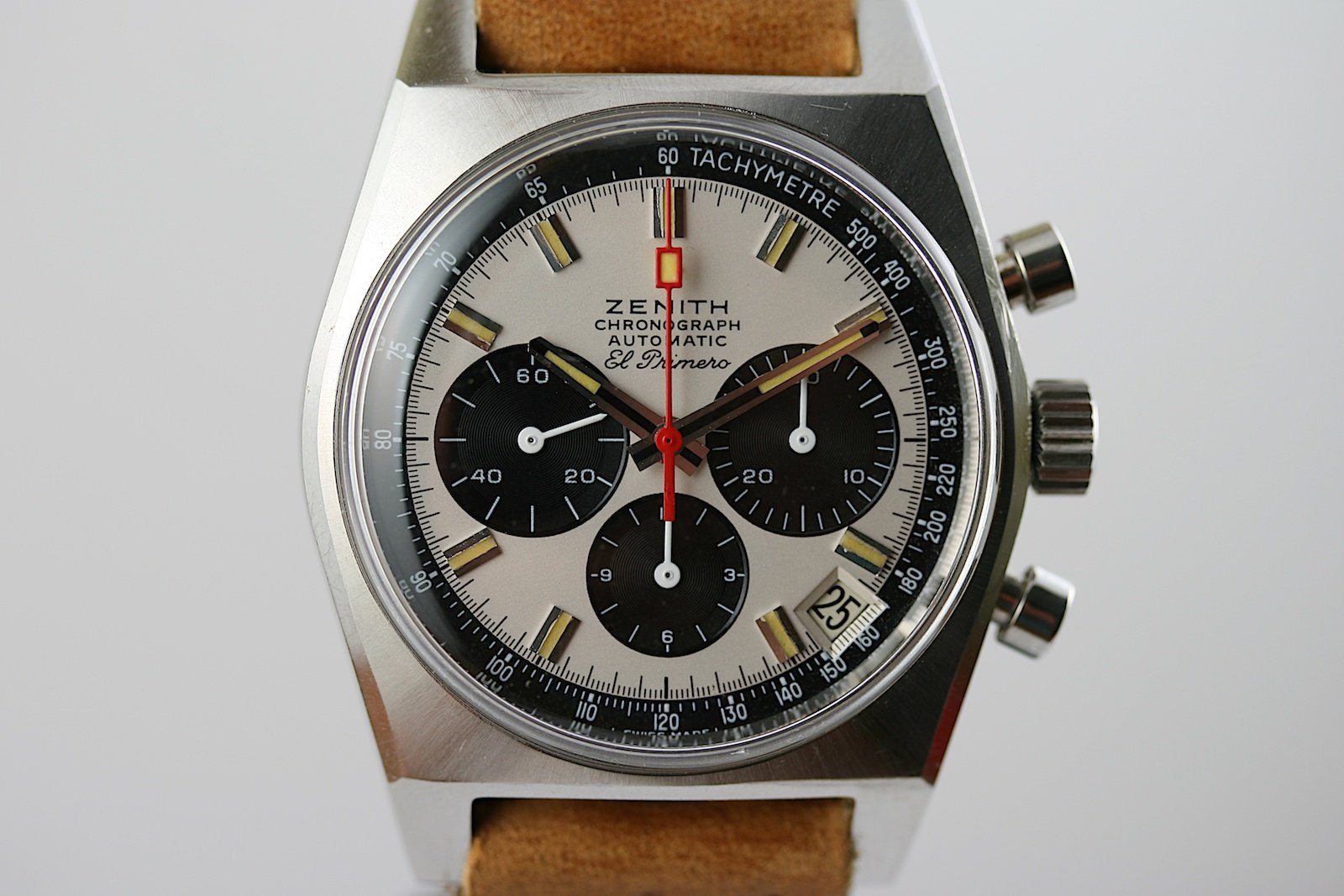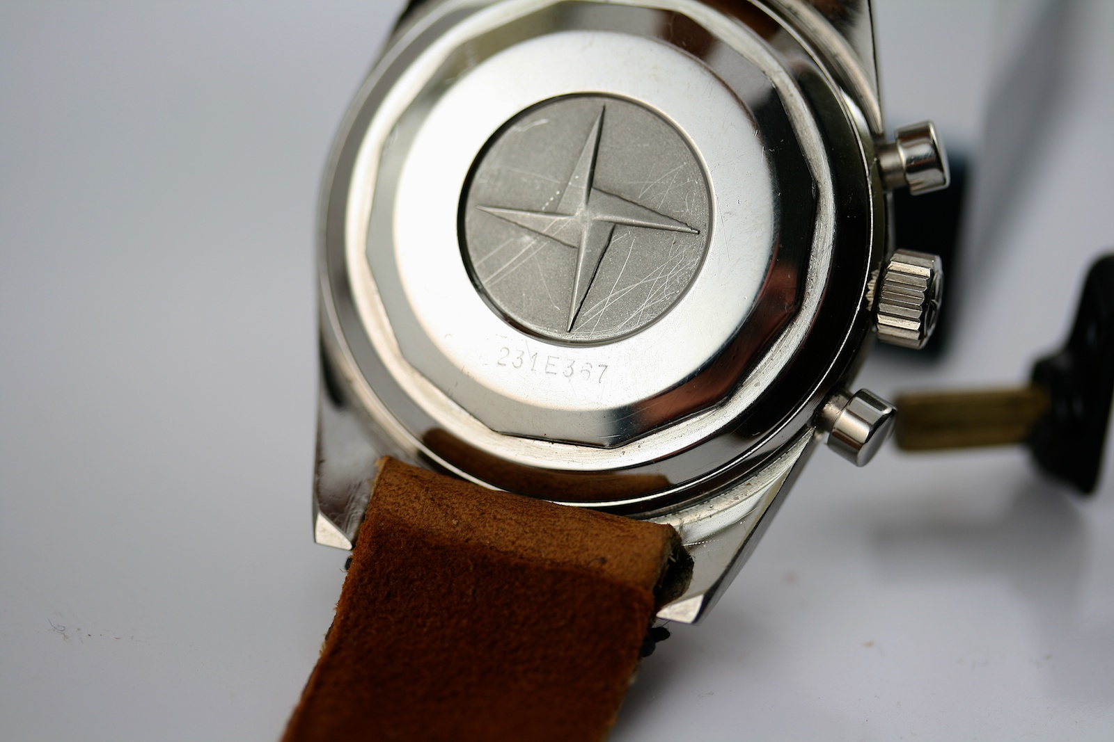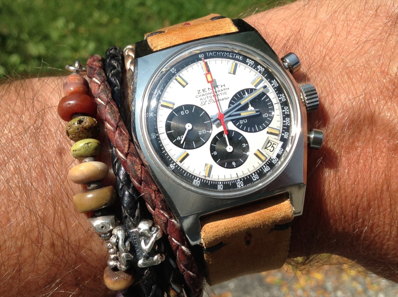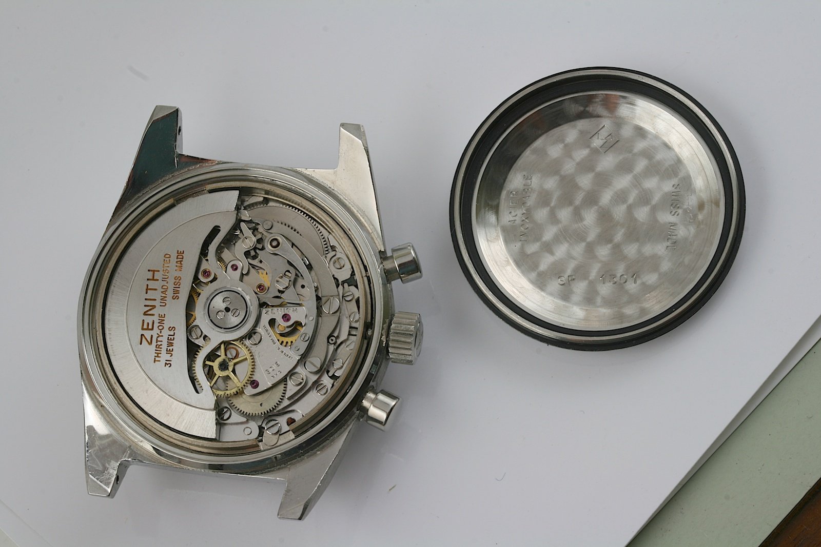 Relumed L Swiss L dial and handset. Watch was gone over by my watchmaker and it is running beautifully, no need for service. This was checked a few months ago, when the reluming was done. As you will notice, it has a star crown on it, but the size is not correct for the reference. I have the service crown that came on the watch when I bought it (see 6th photo) and am happy to switch it back over. Offered on either: one of my straps or a black perforated strap and zenith service buckle for $3500, shipped in the CONUS..Worldwide shipping is not a problem, details can be discussed.