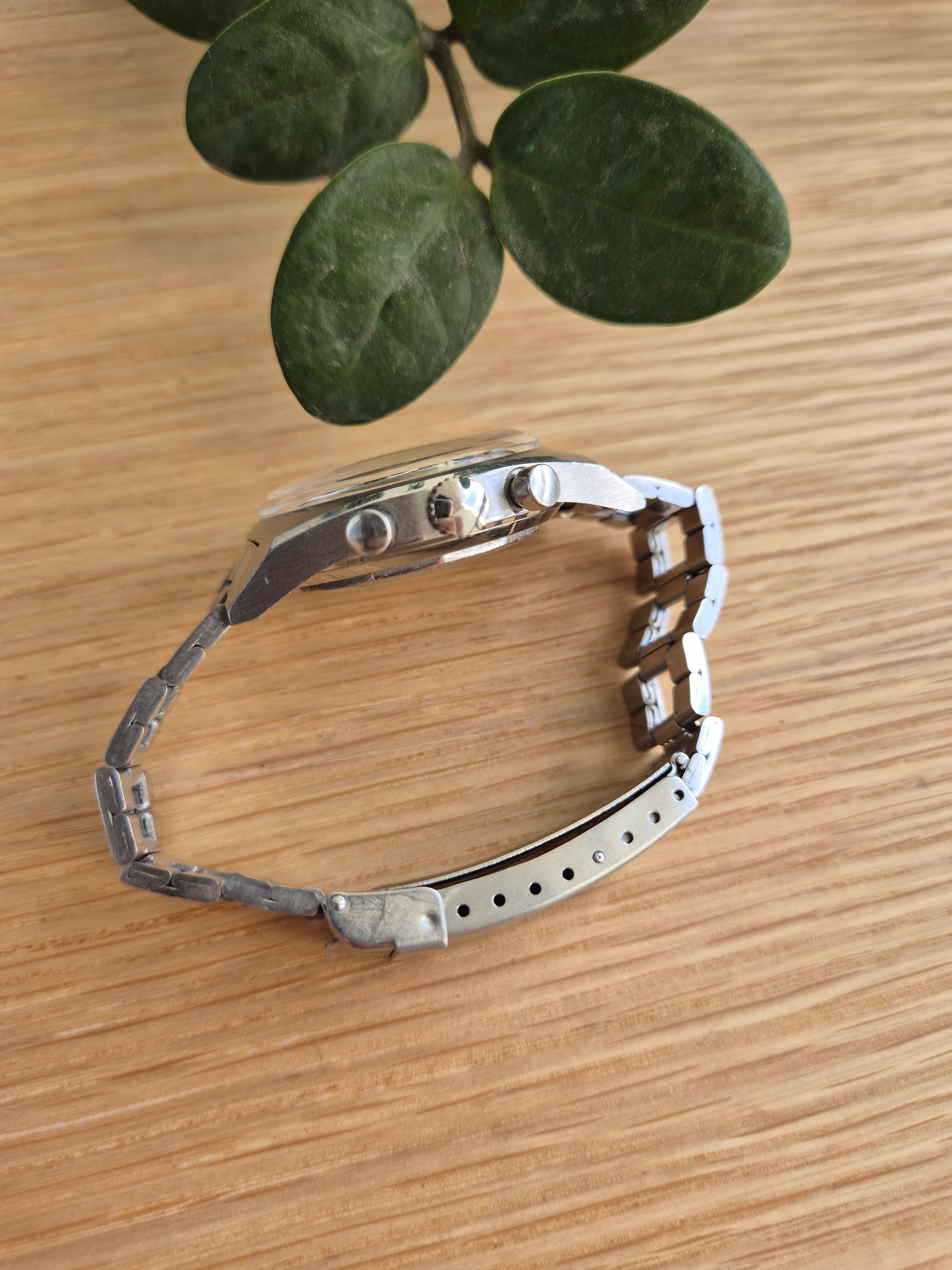 It comes on its original Gay Freres ladder bracelet from 1970 with correct endlinks. The bracelet easily fits my 7 inch wrist and there is still an additional link fitted inside the buckle that could be used for extra length. Bracelet has some stretch but is still fine.