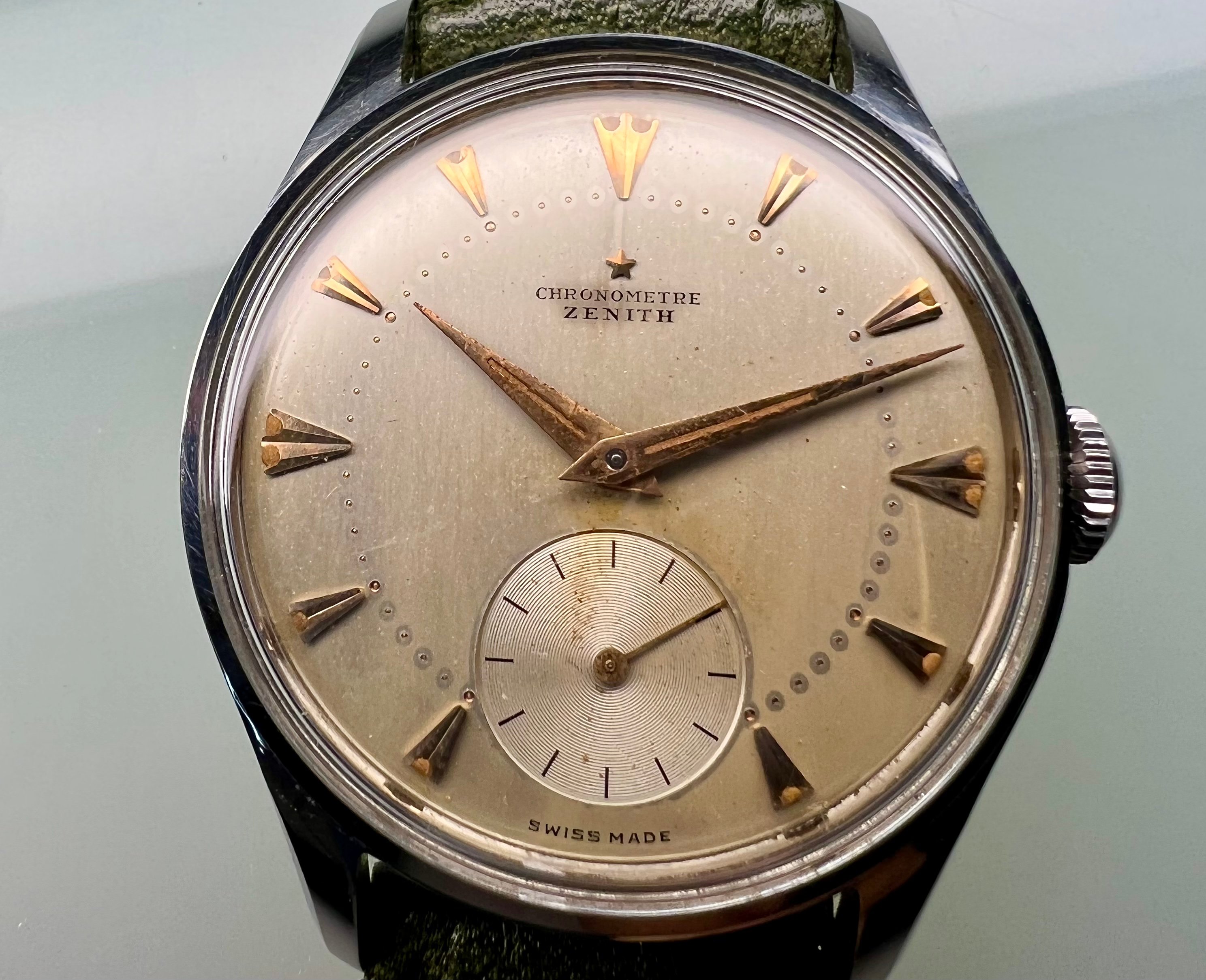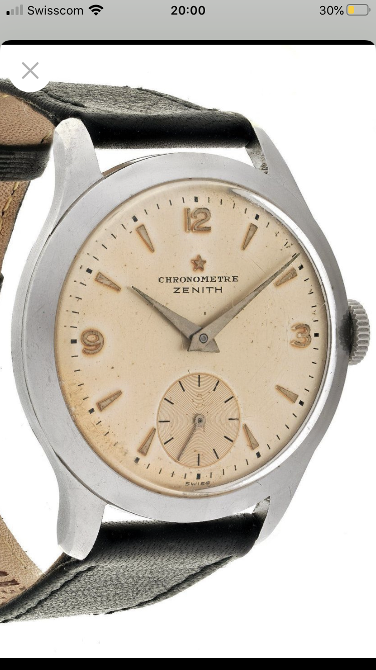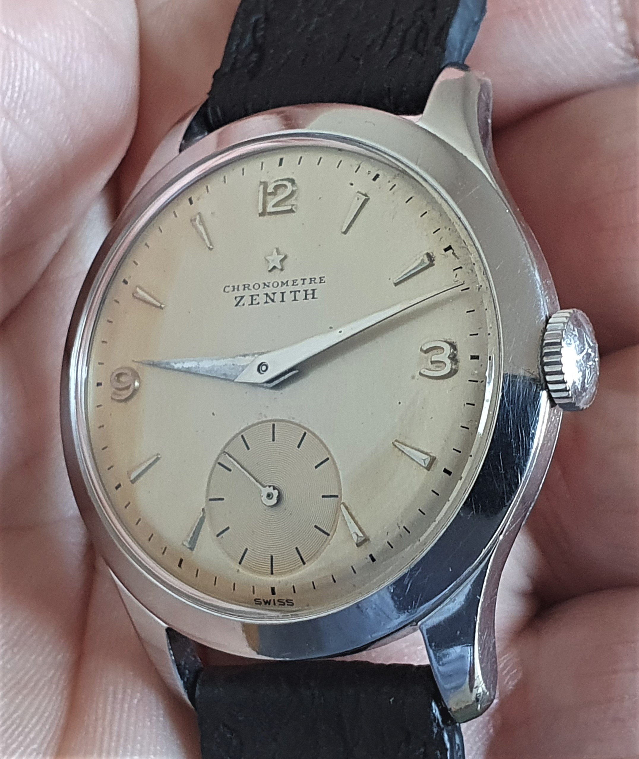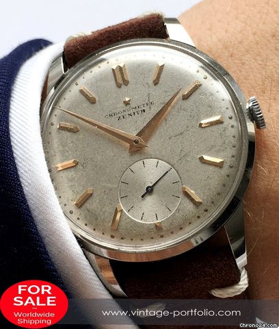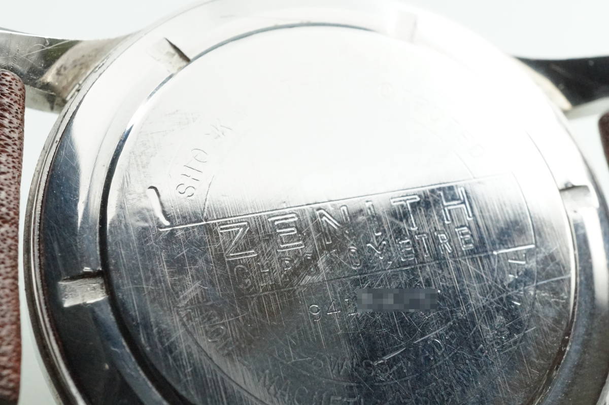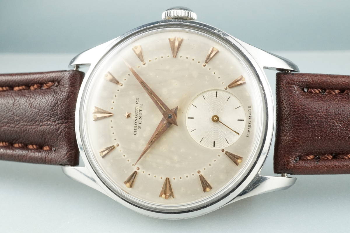One of the earliest ZENITH Chronometer, Cal. 135, SN: 3869940, Case No: 8884007, 35mm stainless steel, made circa 1949, aka “first series”. Powered by by manual winding gold-plated 13’’’/30mm Zenith movement Cal. 135 with “Cotes de Genève” finish and a bimetallic, split, screwed balance. Very good unpolished condition, everything original, gorgeous patinated dial, clean and practically untouched movement. The crown is unsigned, but most likely original. Accompanied by its original Zenith book-style box.