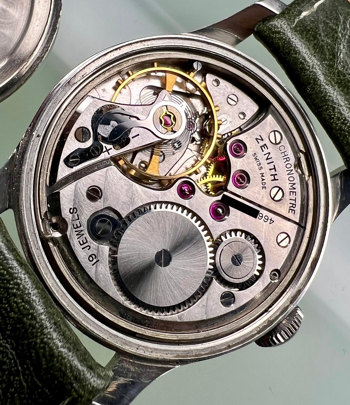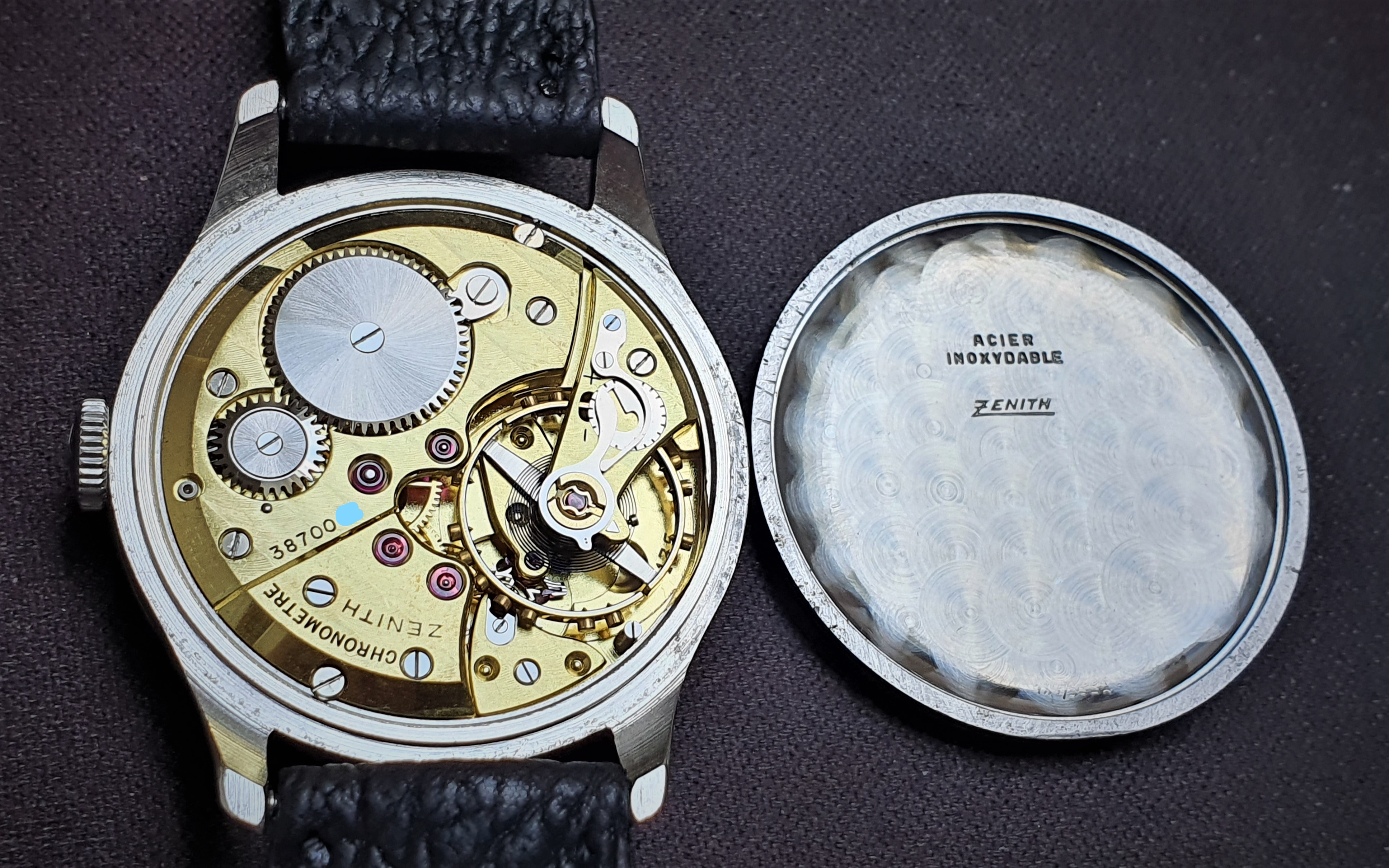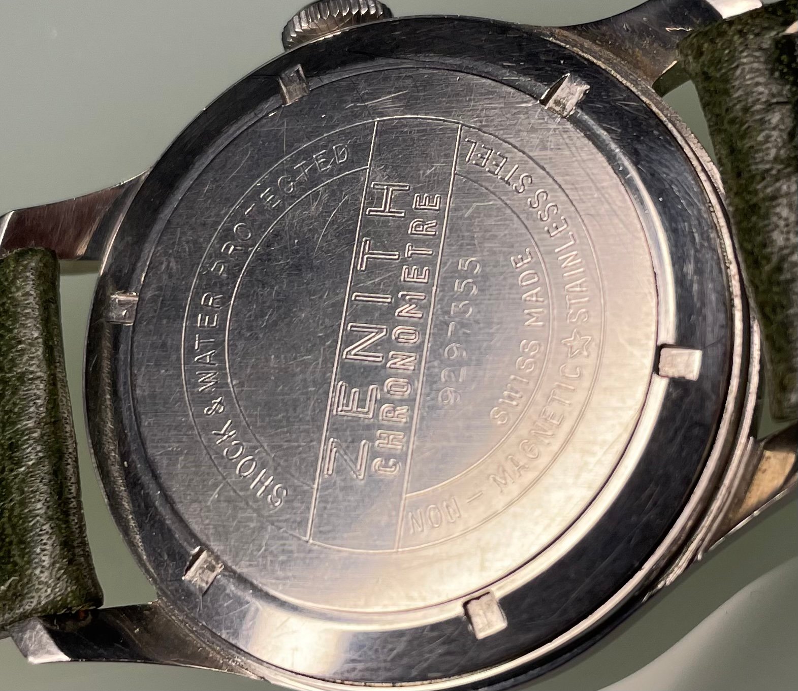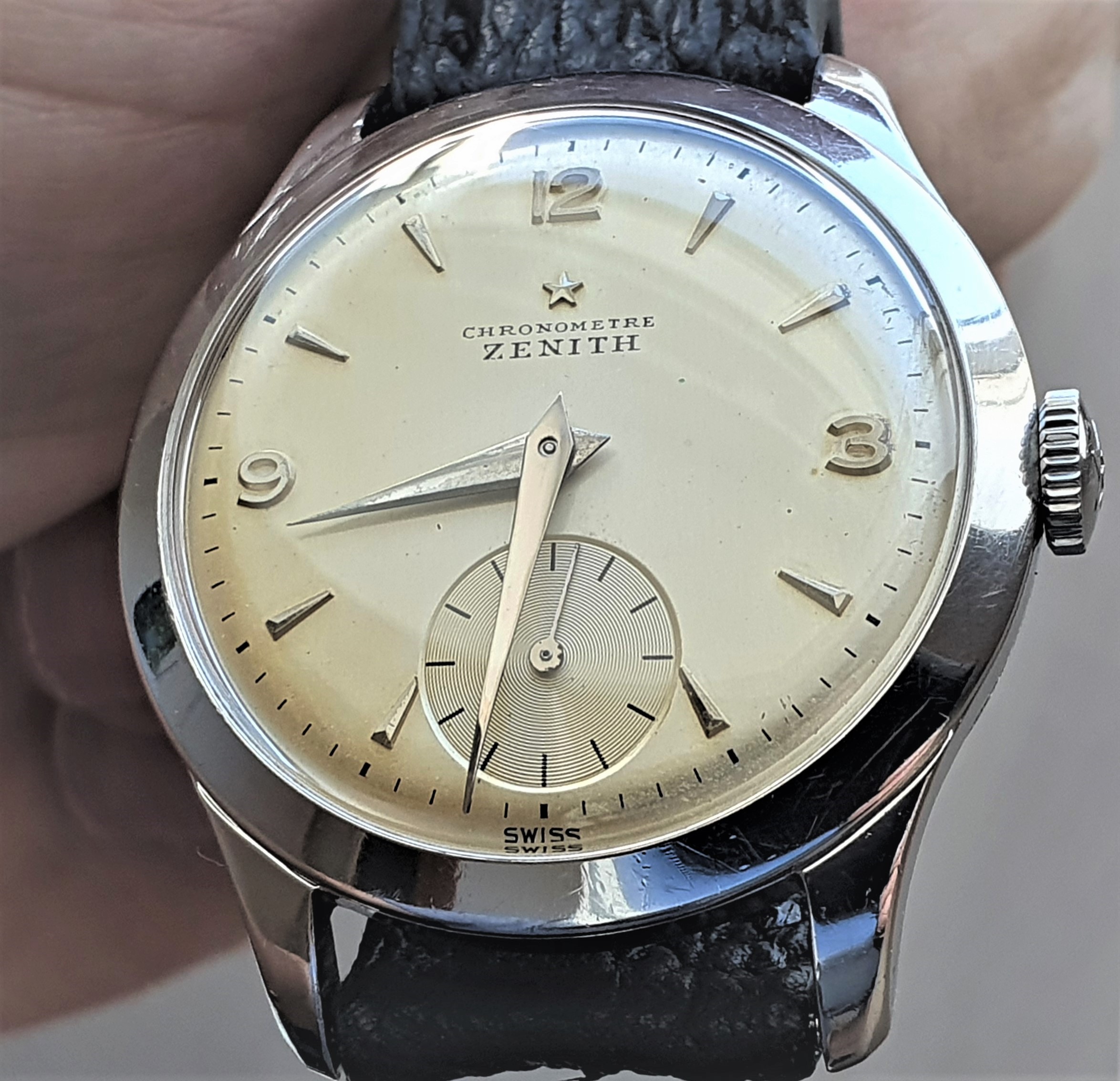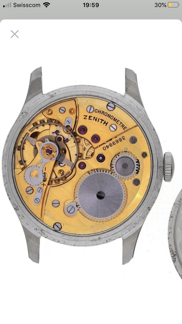 One of the earliest ZENITH Chronometer, Cal. 135, SN: 3869940, Case No: 8884007, 35mm stainless steel, made circa 1949, aka “first series”. Powered by by manual winding gold-plated 13’’’/30mm Zenith movement Cal. 135 with “Cotes de Genève” finish and a bimetallic, split, screwed balance. Very good unpolished condition, everything original, gorgeous patinated dial, clean and practically untouched movement. The crown is unsigned, but most likely original. Accompanied by its original Zenith book-style box.