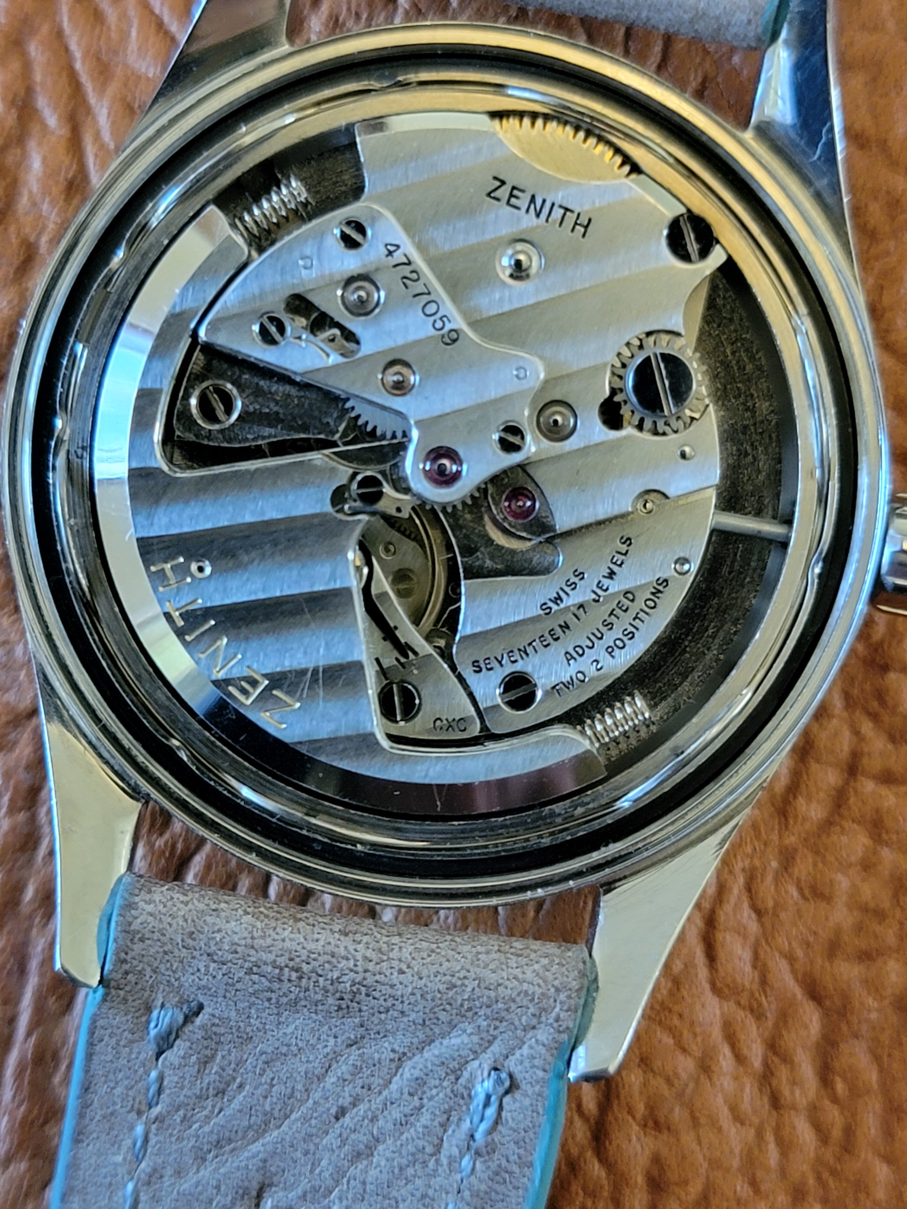 Not much to say. Everything looks nice and correct. The only negative is the slight burn on the dial at about 10:25 on the dial, which would have come from the hands not moving from that position for years. (The service receipt says "Longines." For some reason the watchmaker wrote the wrong watch, although he did in fact service this Zenith.)