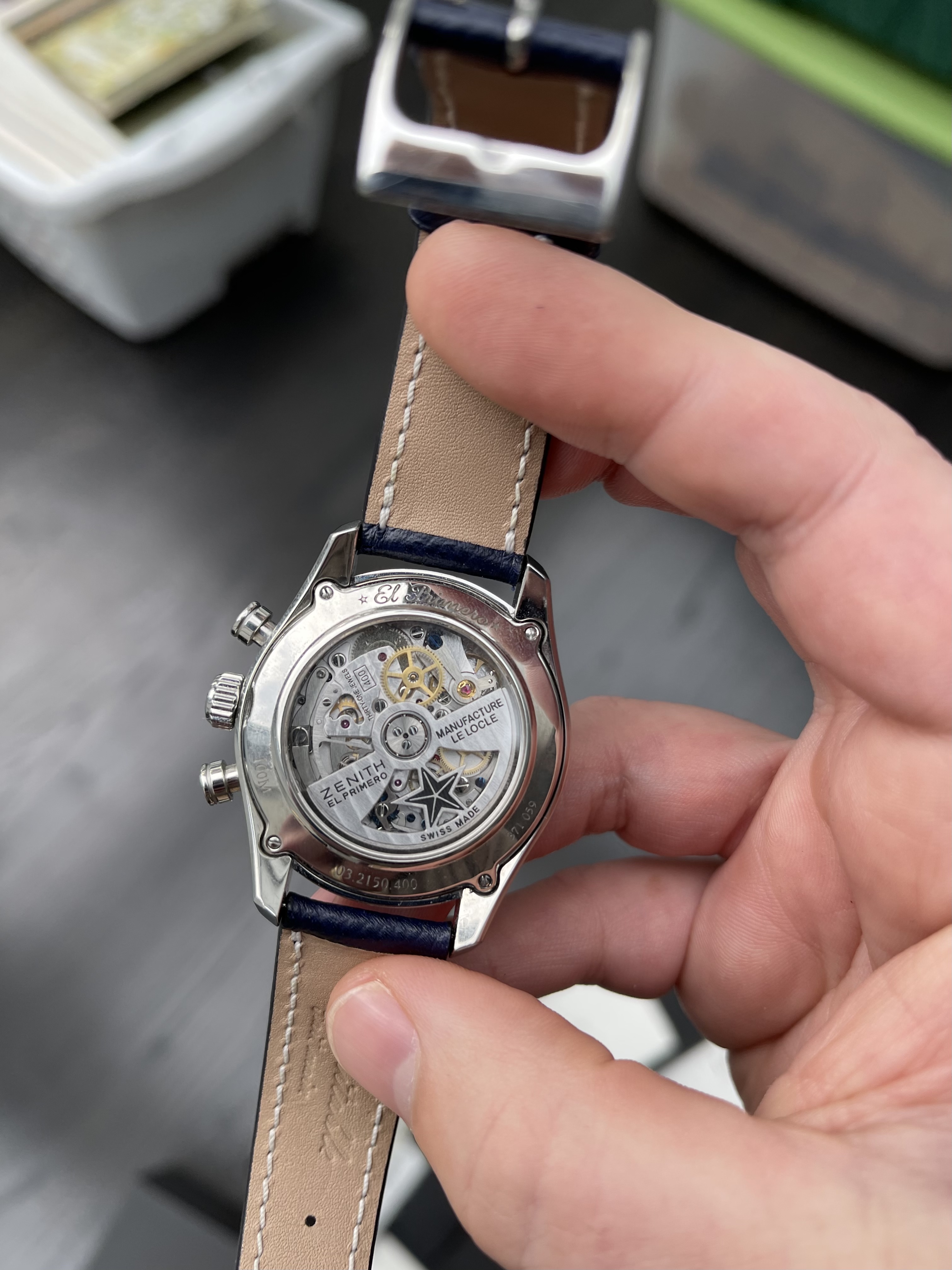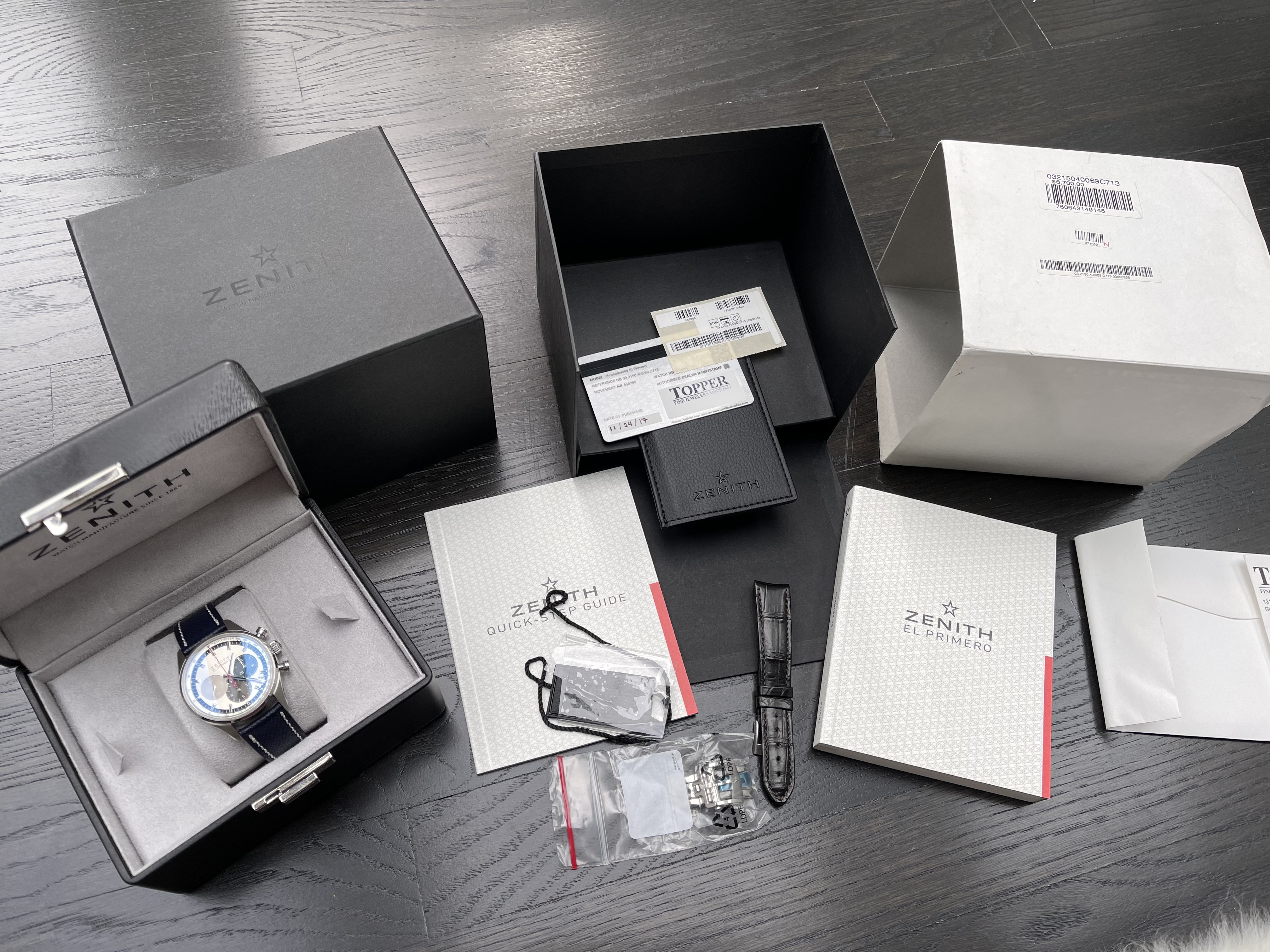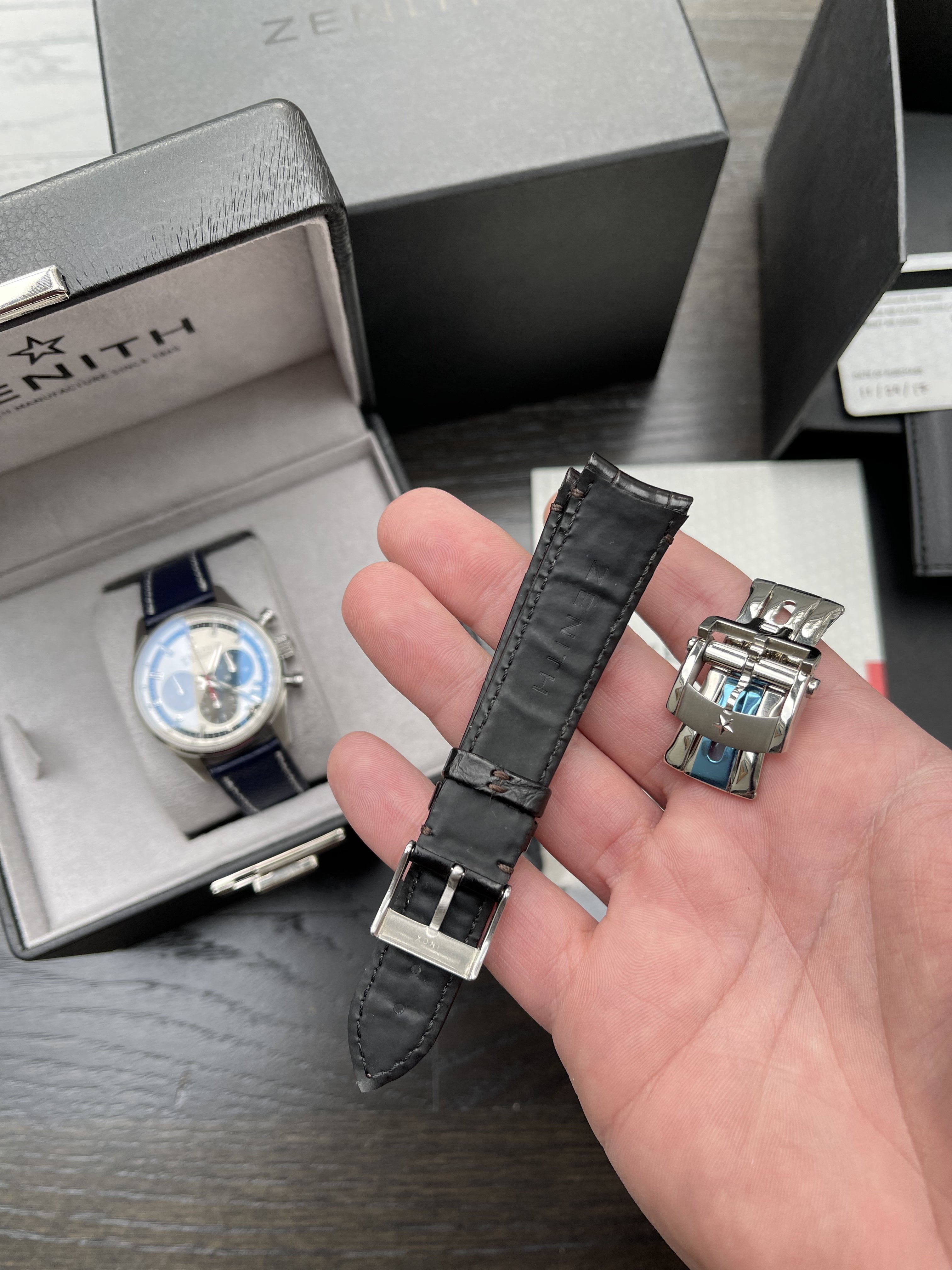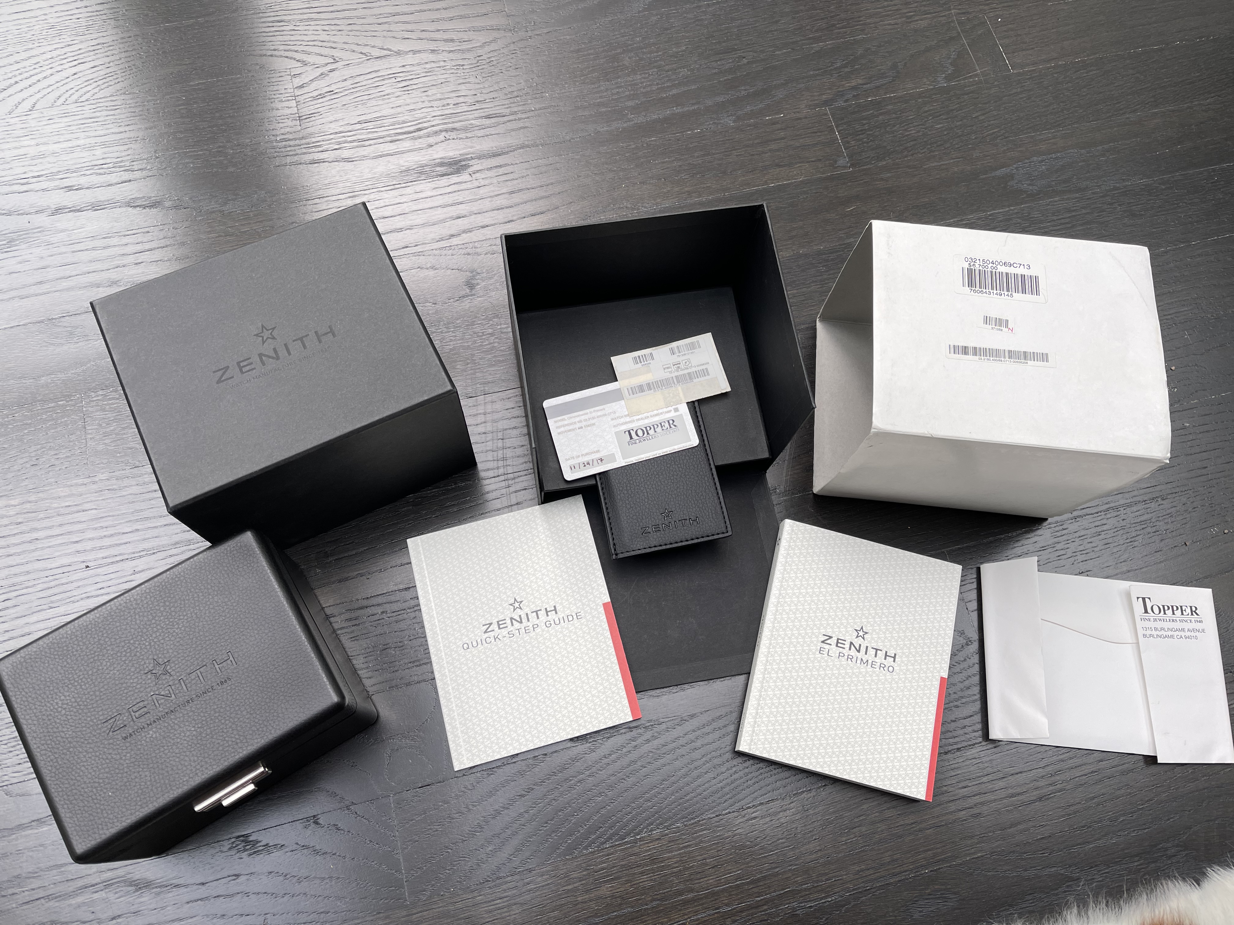 Accessories Included: This is a fully complete set that includes the watch, unworn deployment clasp, original Zenith leather strap, box, papers, hangtag, warranty card, etc. Everything you see here is included.