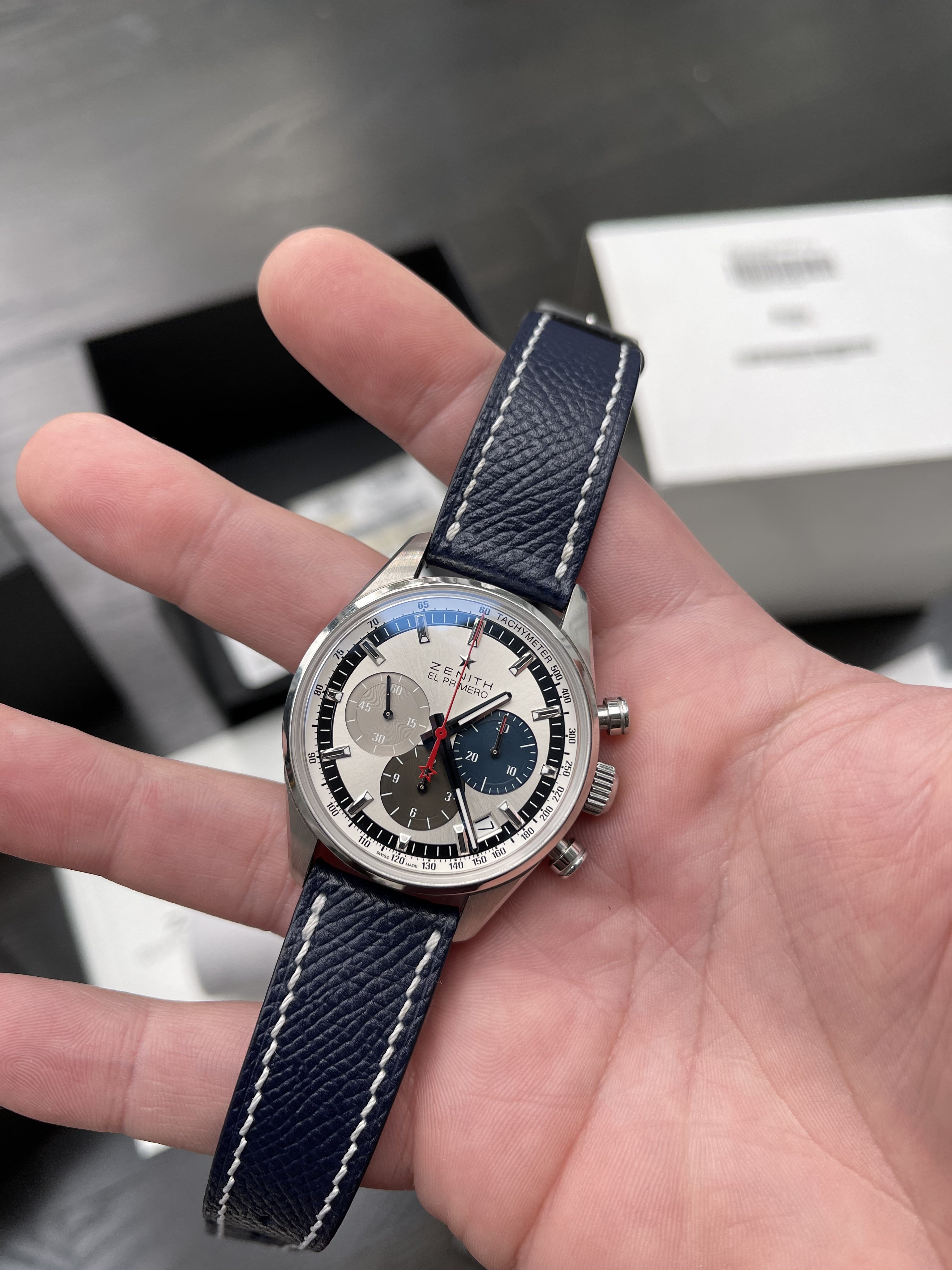 Up for sale today is a beautiful watch that really needs no introduction. The Zenith Chronomaster El Primero ref. 03.2150.400. This is the 38mm size with the updated dial layout where subdials overlap properly.