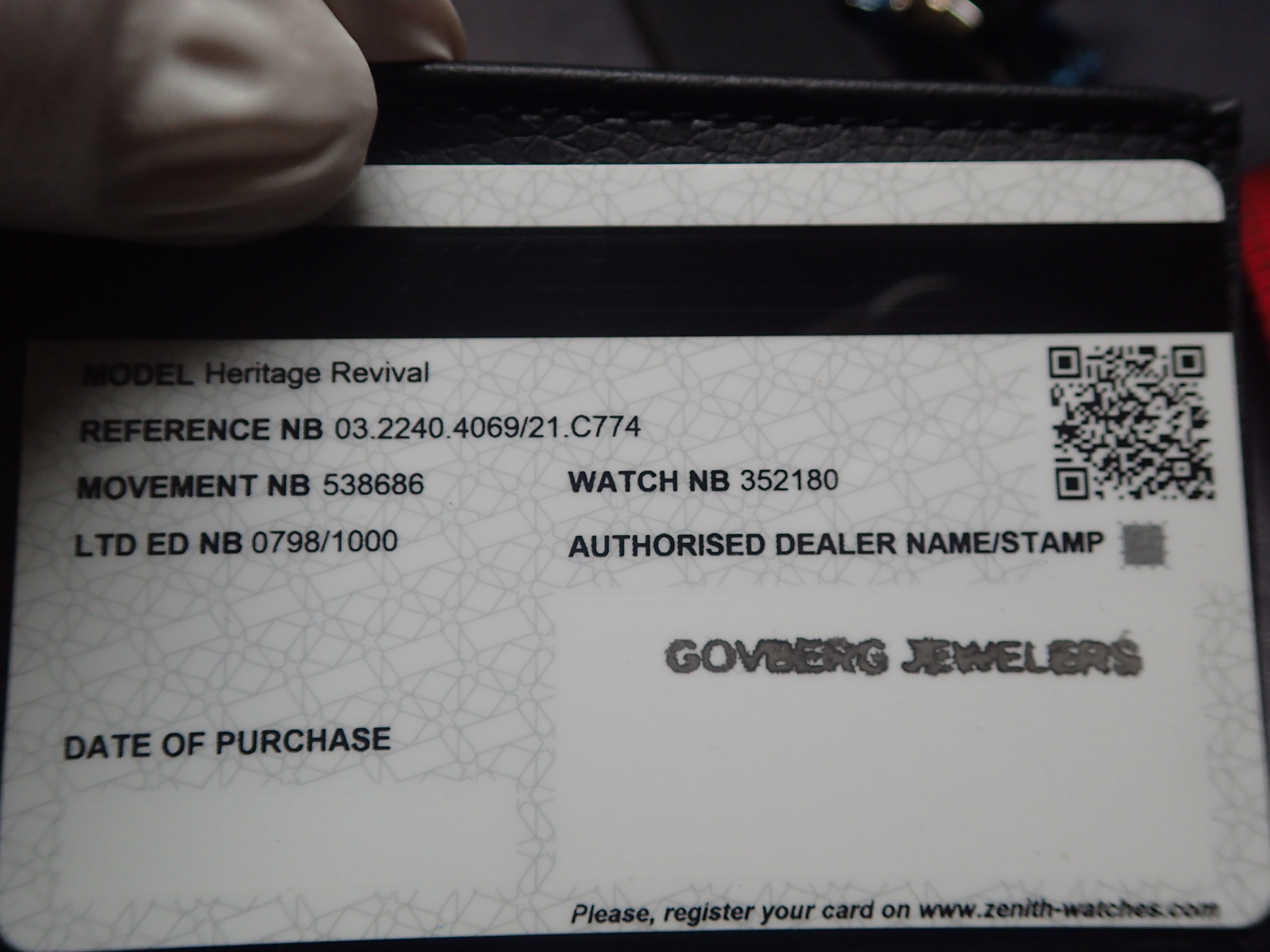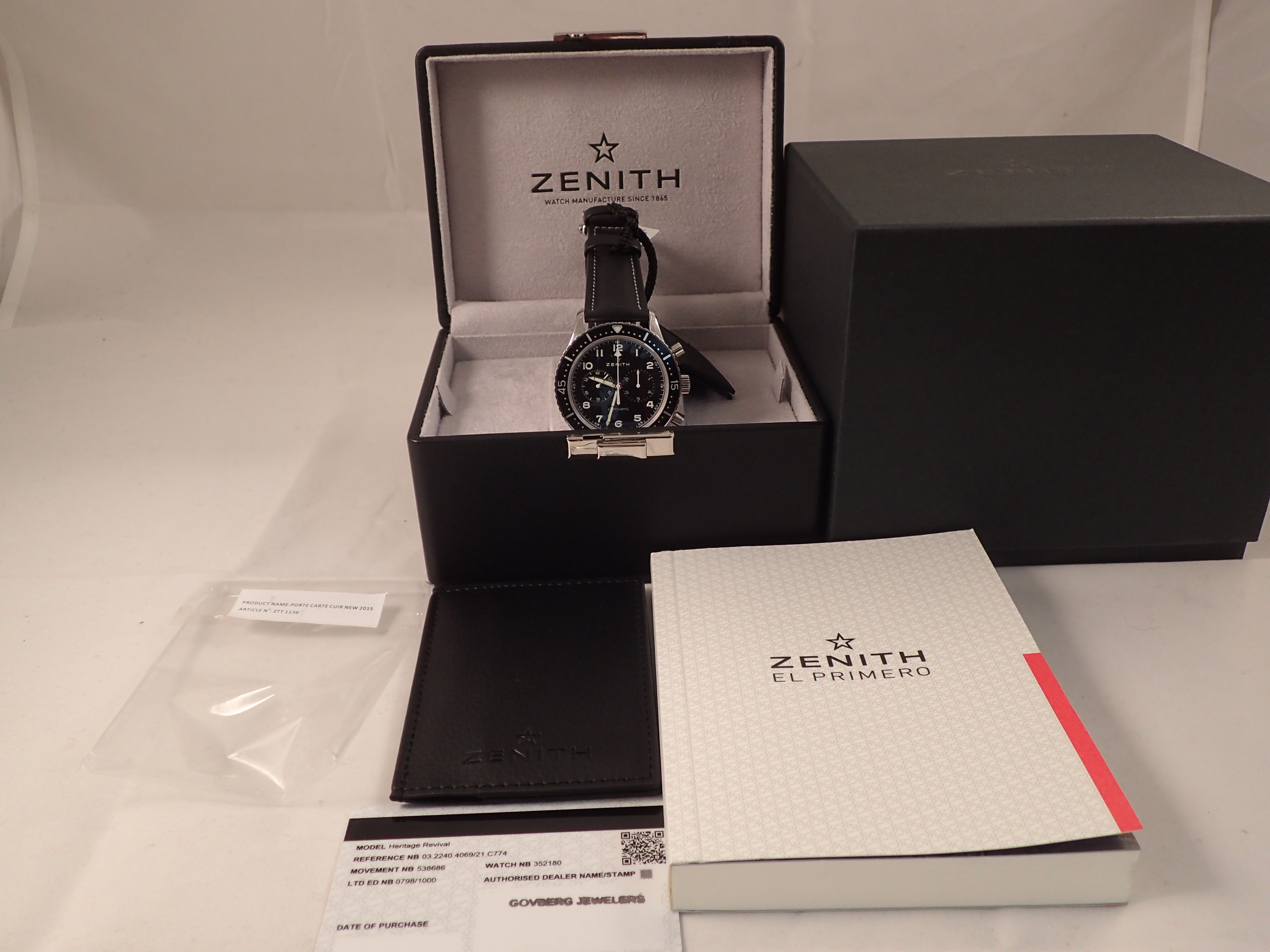It comes with double outer boxes, inner box, manual, hang tag, undated warranty card stamped “Govberg Jewelers” - the full kit. The original strap with deployant buckle has never been worn.