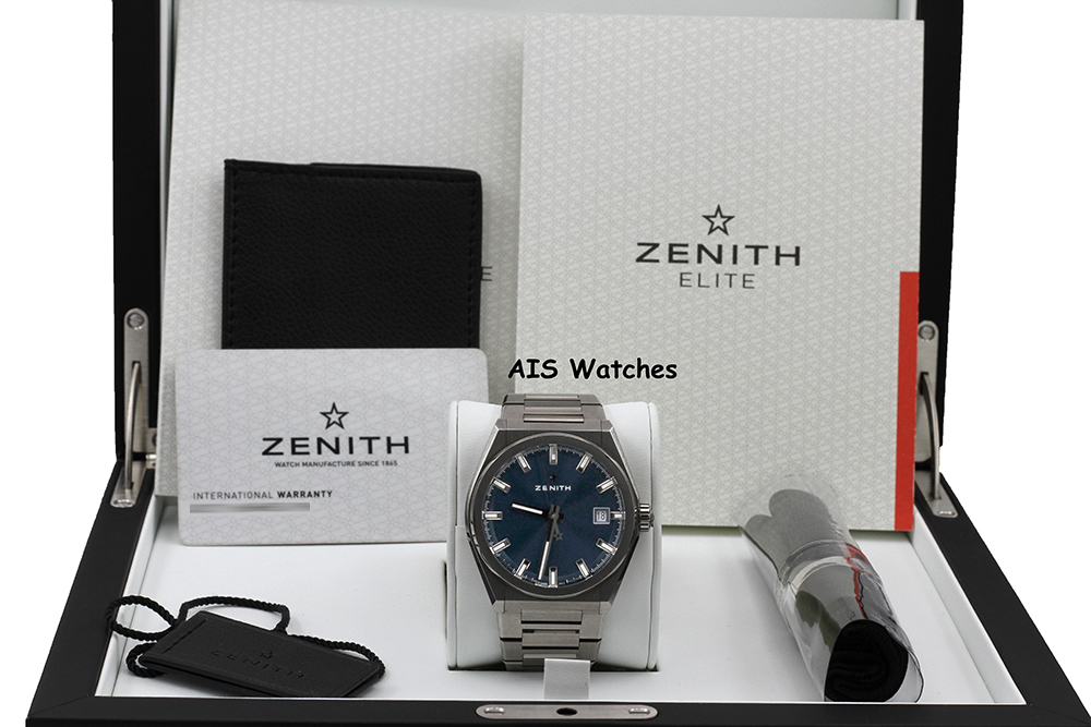 Up for sale is a Zenith Defy Classic 95.9000.670/51.M9000 Blue Dial 41MM Titanium Bracelet Box & Papers. The timepiece is in excellent condition.