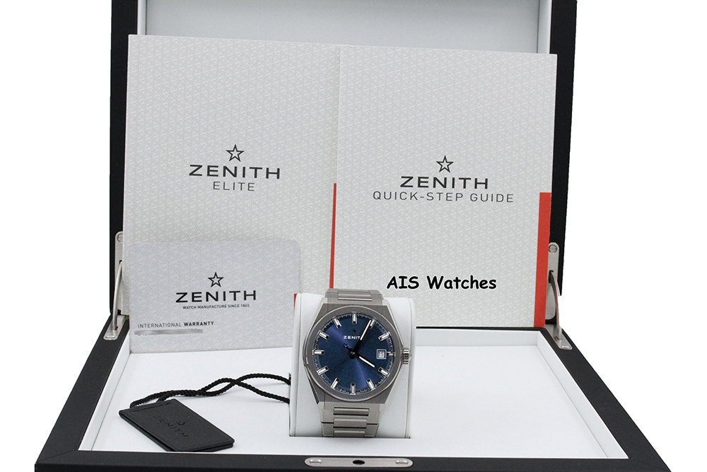 Up for sale is a Zenith Defy Classic 95.9000.670/51.M9000 Blue Dial 41MM Titanium Bracelet Box & Papers. The timepiece is in excellent condition.