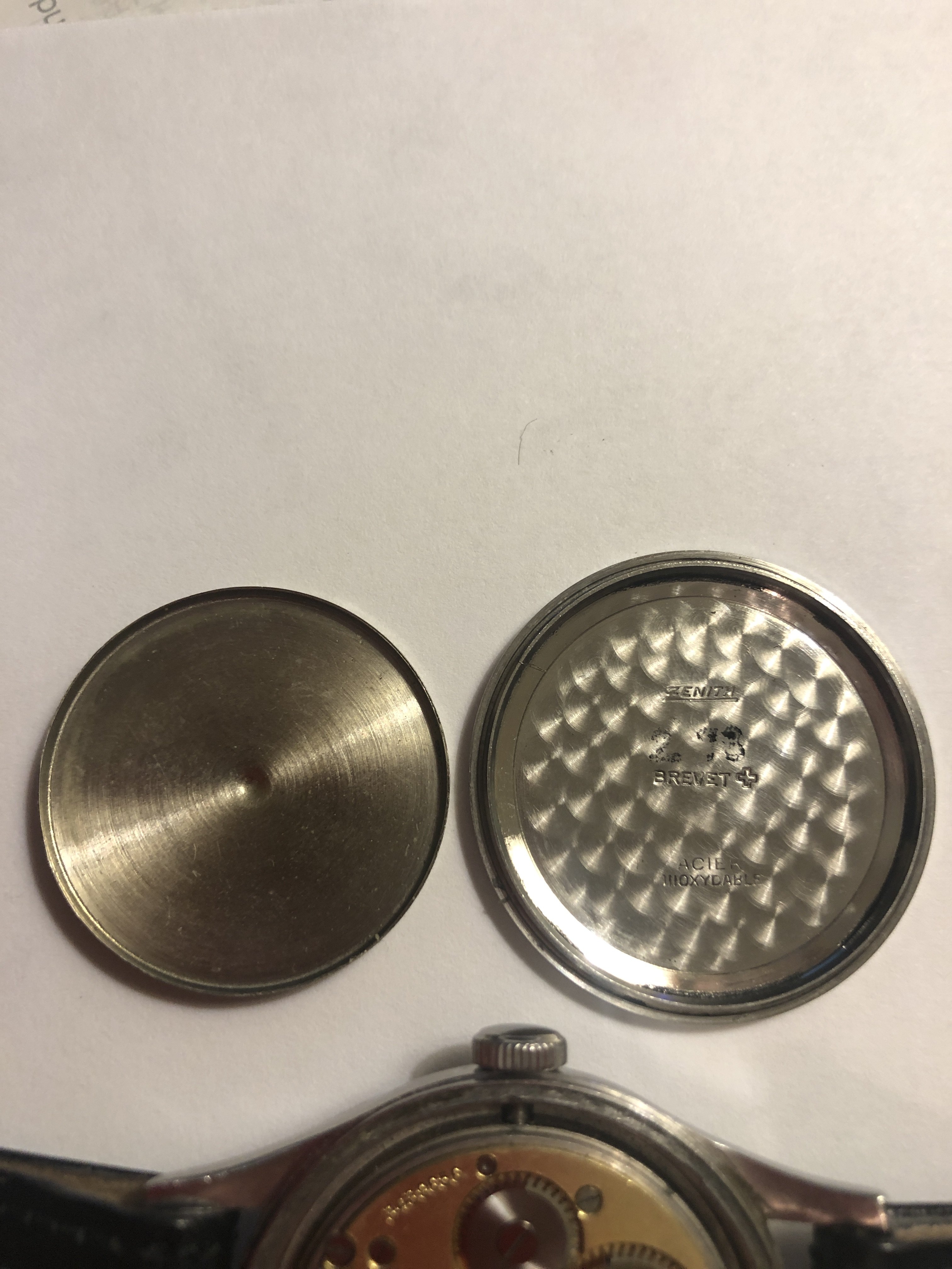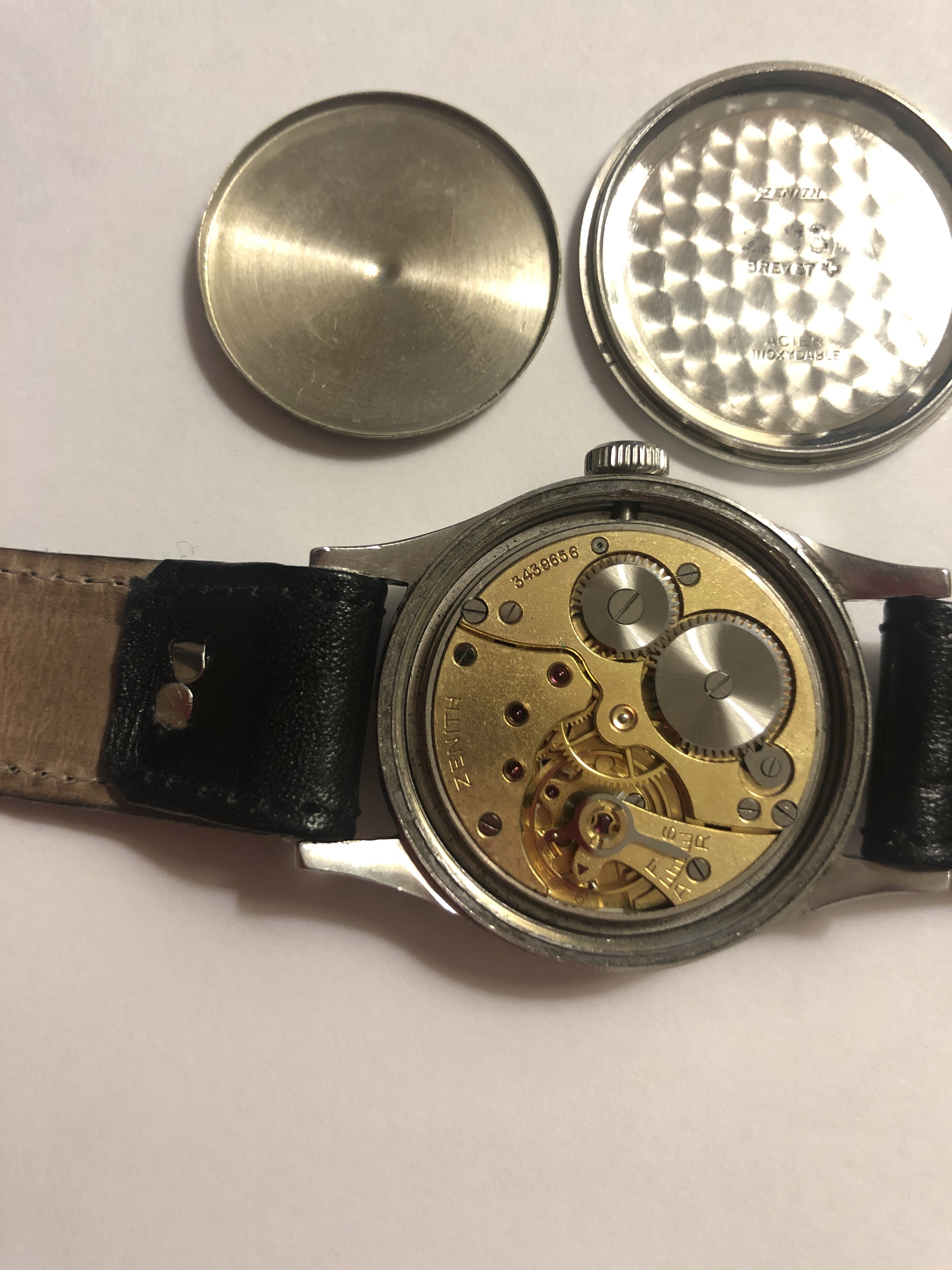 The screw-on caseback carries the watch serial number on the exterior. That serial number and its application in an arc is consistent with other known examples. The inside carries the Zenith logo, the Brevet marking as well as acier inoxydable.