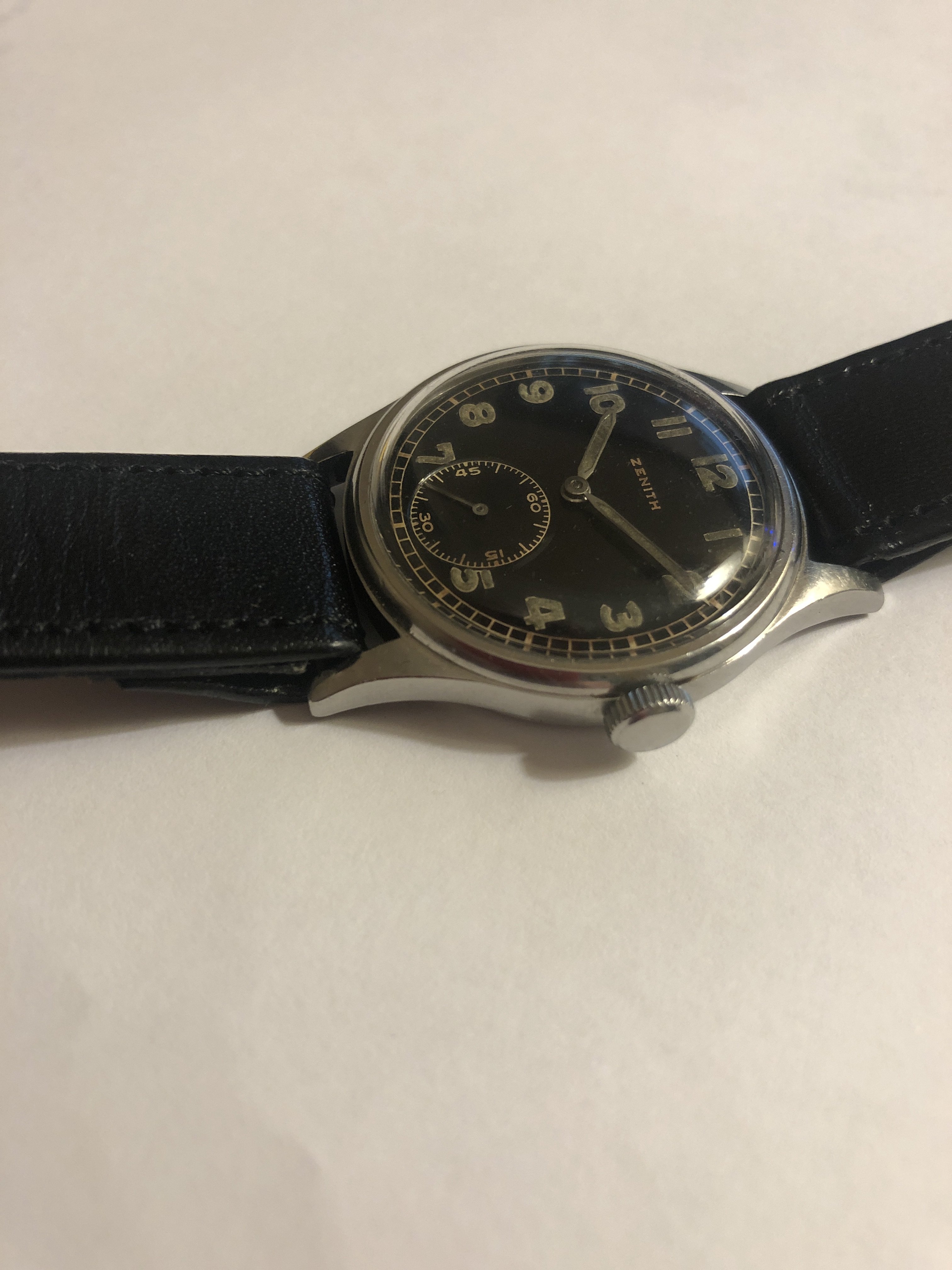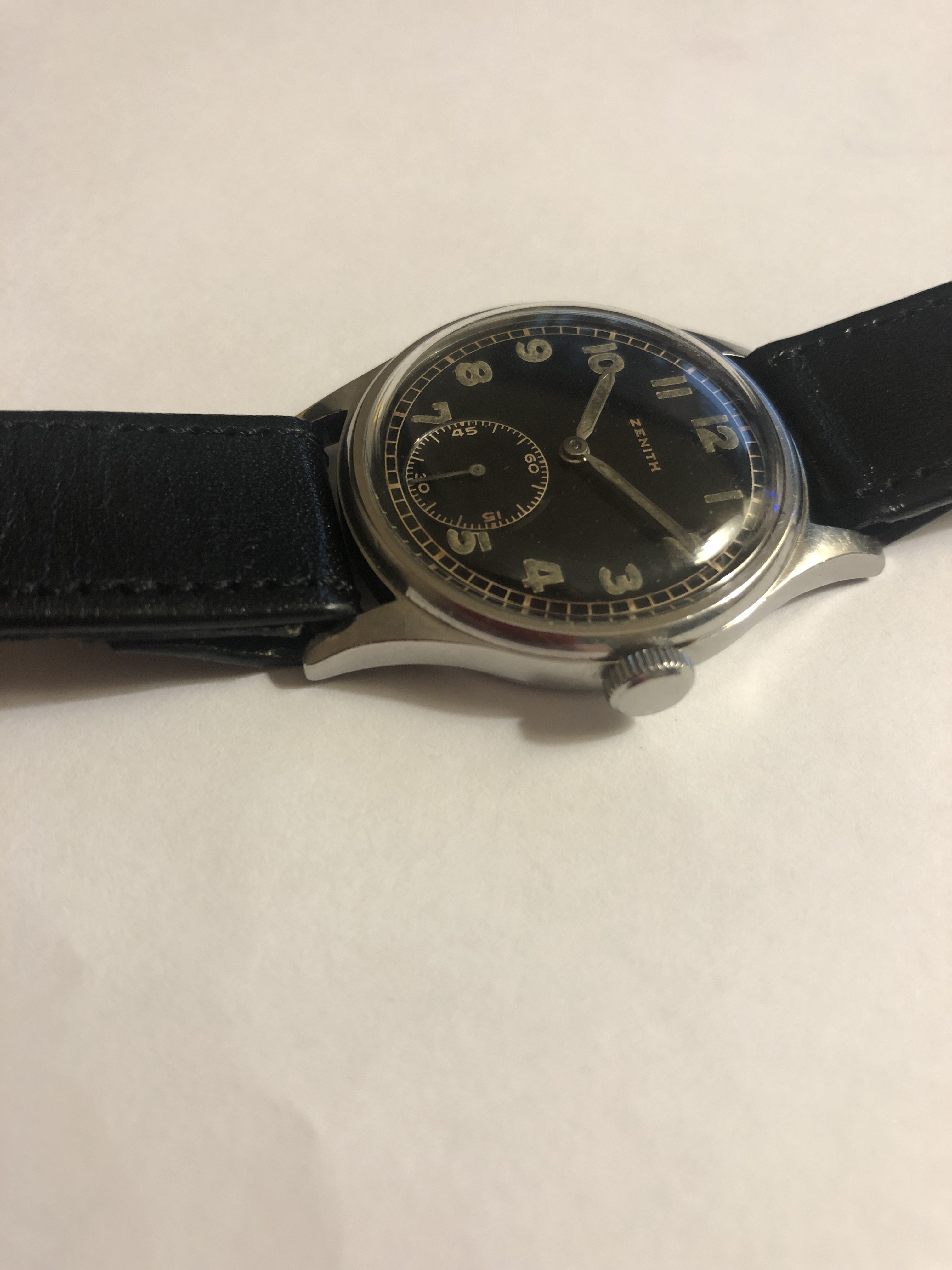 A nice example of a Dienstuhr Heer, Wermacht issued wristwatch. Serial number D. 8379654 H. places this in the early if not the first production run of Zenith DH watches.