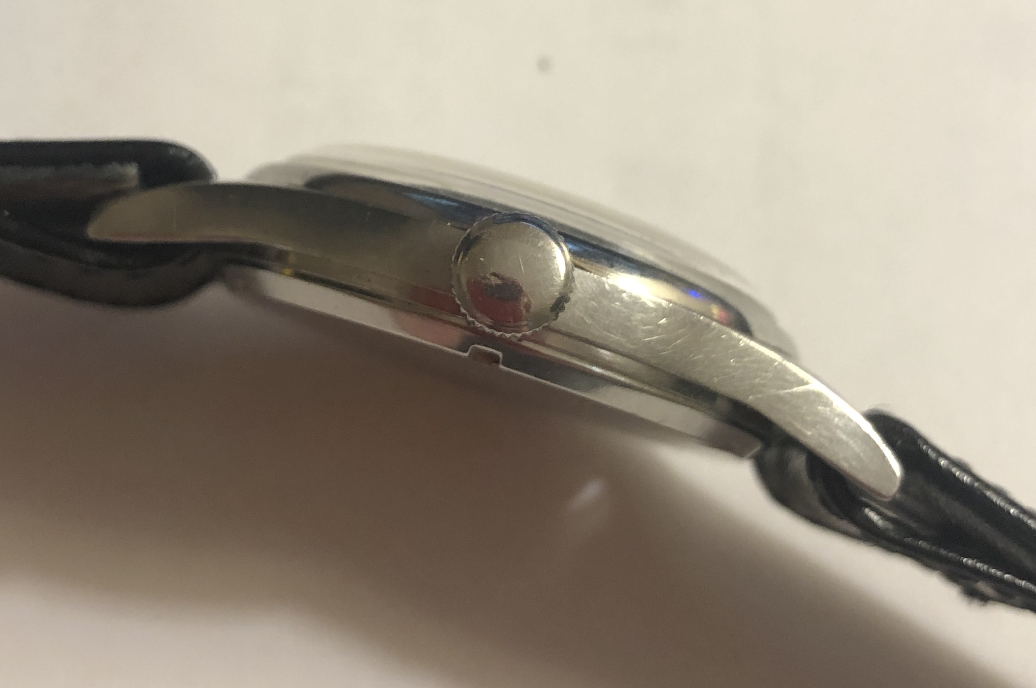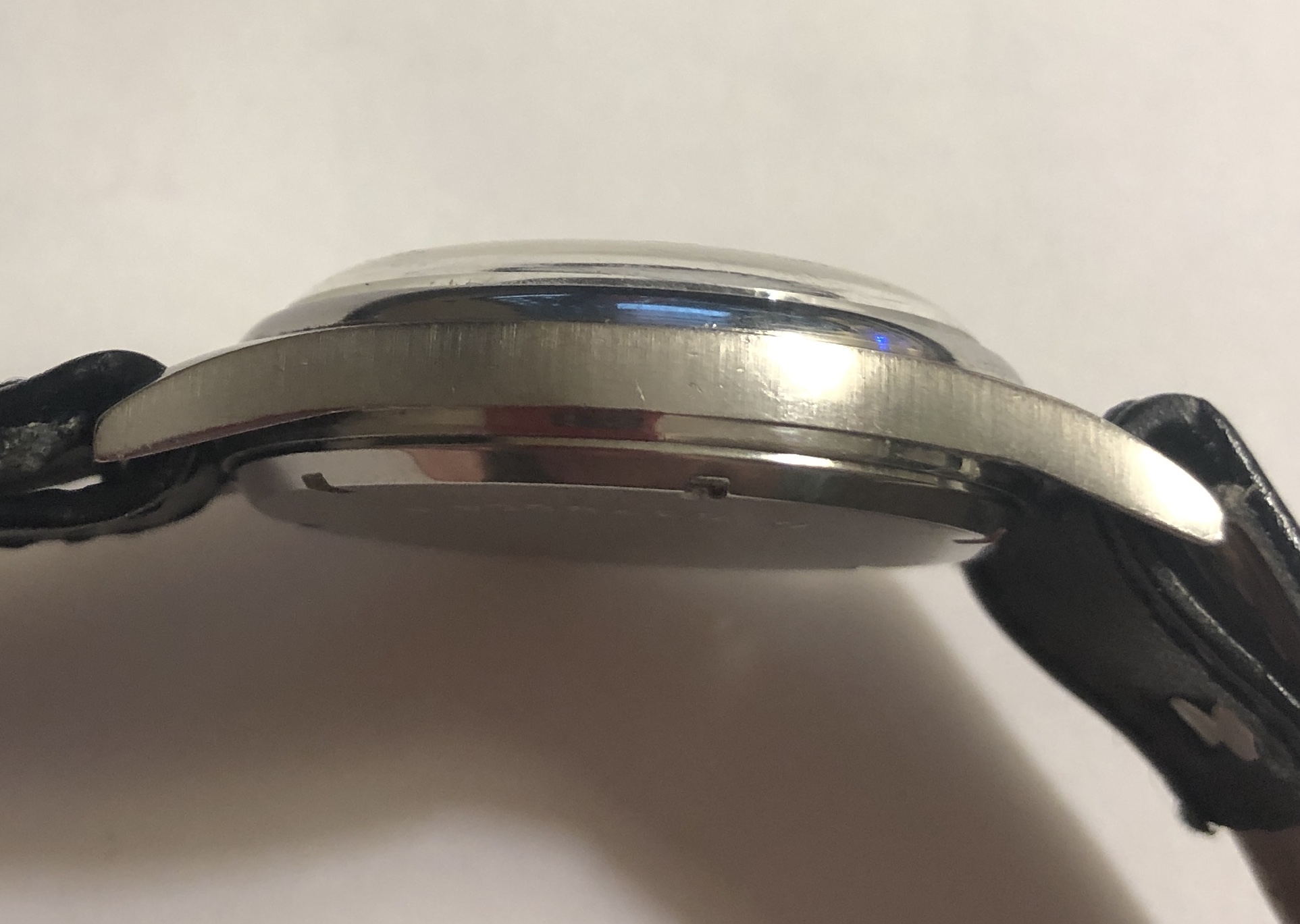 The 35mm Case is all stainless steel, and presents itself well. Fixed lugs. No major scuffs or scrapes are evident anywhere. Any minor case scuff marks or tiny dings appear over the top of what I presume was the original case finish. Overall, it looks very honest to my eye. I believe the fine-toothed crown to be original as well, and it shows similar wear consistent with the rest of the watch.