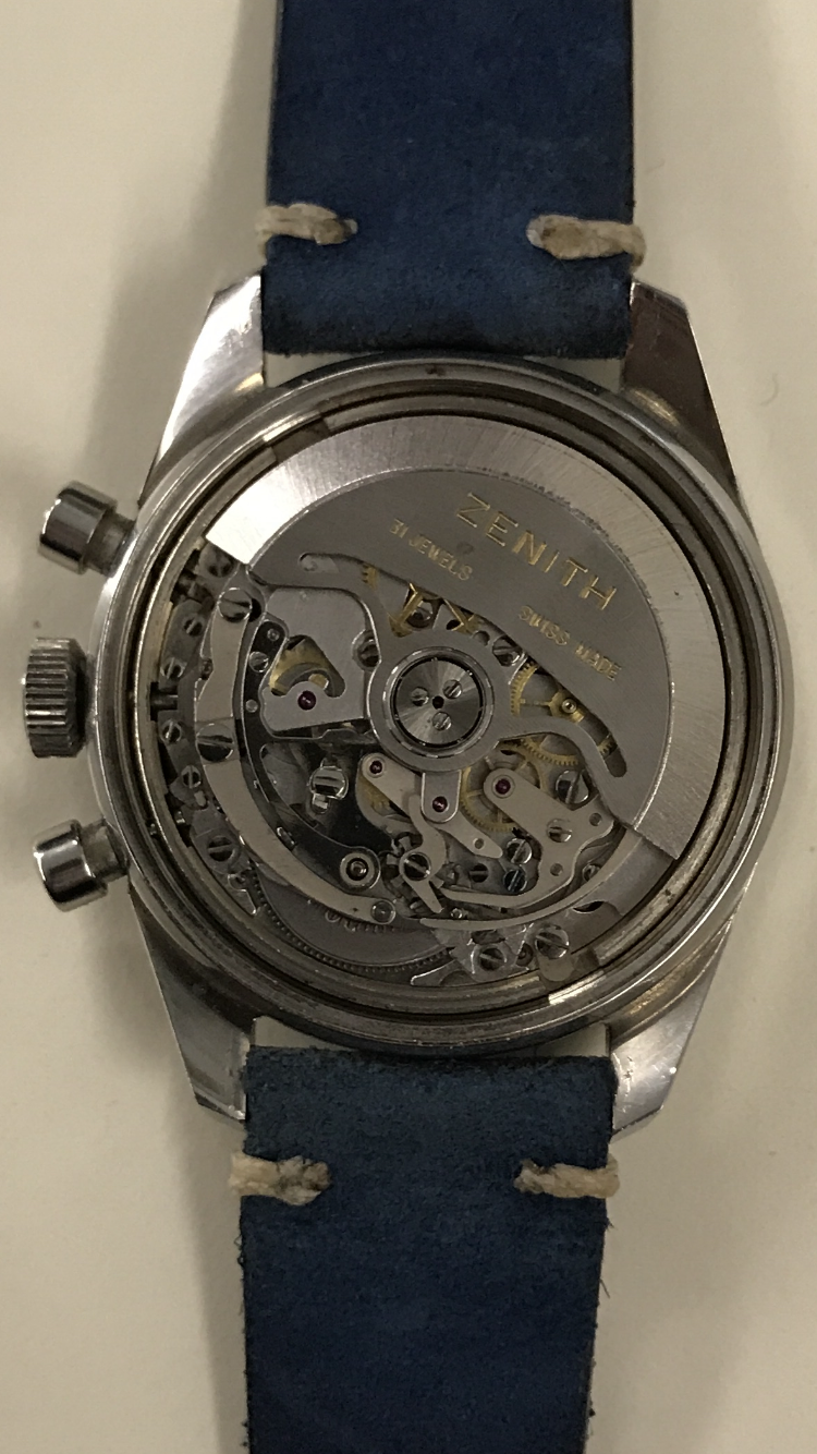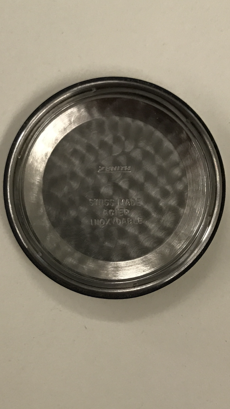 - The Mark I, early production series, with case no. 538DXXX to 539DXXX, estimate range in the 200 to 400, with thin sub dials hands, plain (or smooth) case back, no groove on the lugs, slightly different design from the two other mark, dial with letter P (from CHRONOGRAPH) and letter C (from AUTOMATIC) perfectly superposed, winding crown set with a four pointed star inside a circle inside case back engraved and centered, as follow, by order of appearance from top to bottom « Zenith, Swiss Made, Acier Inoxydable » (no Spillman number).
