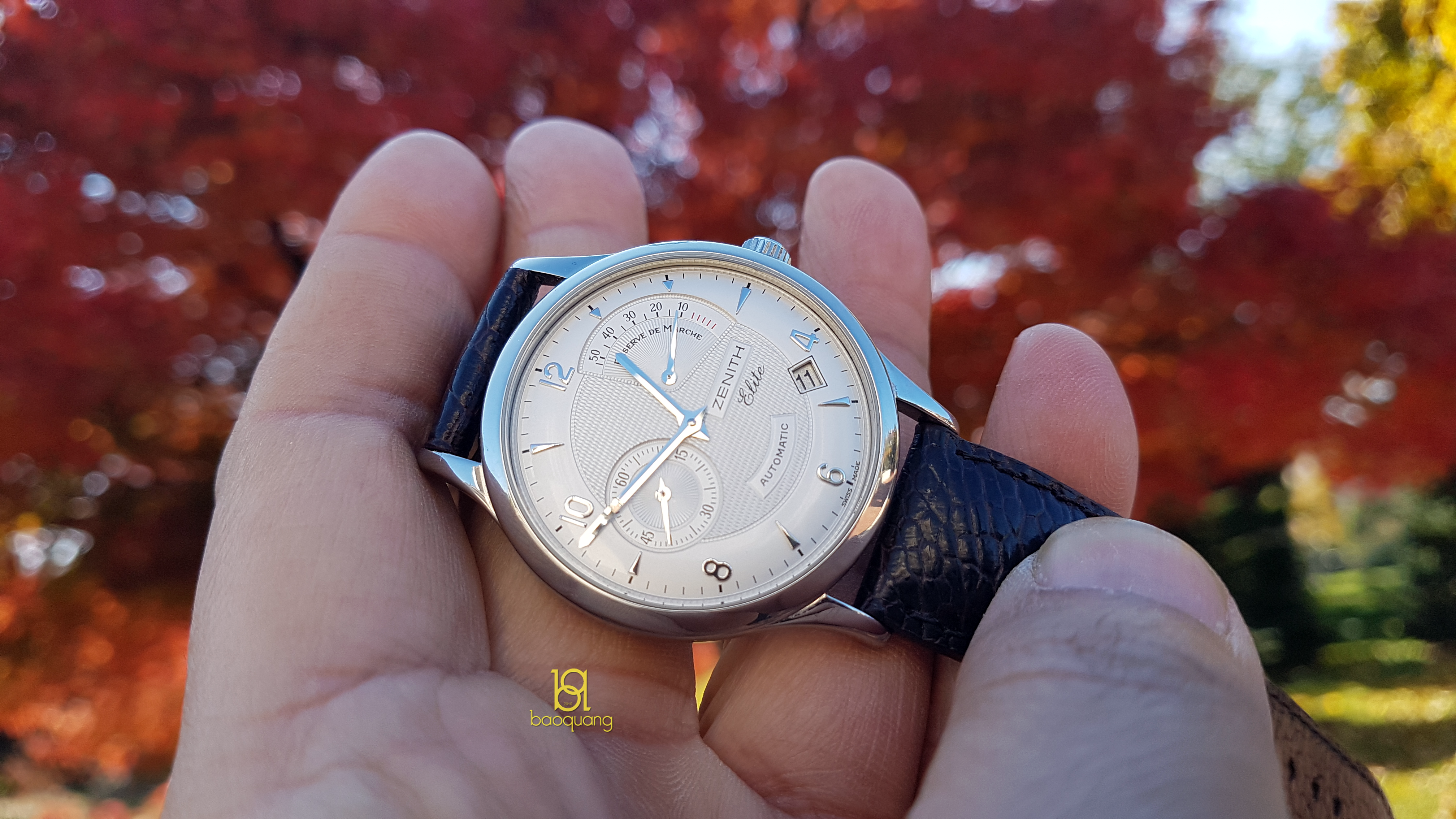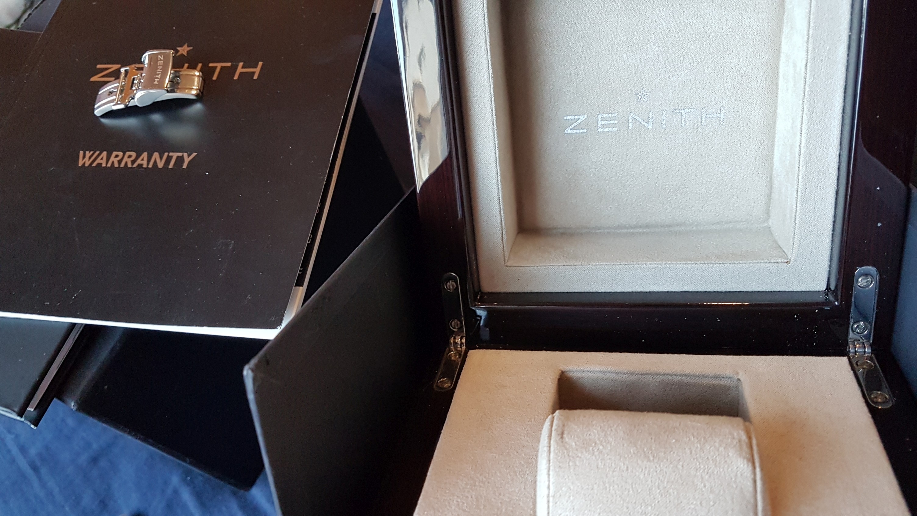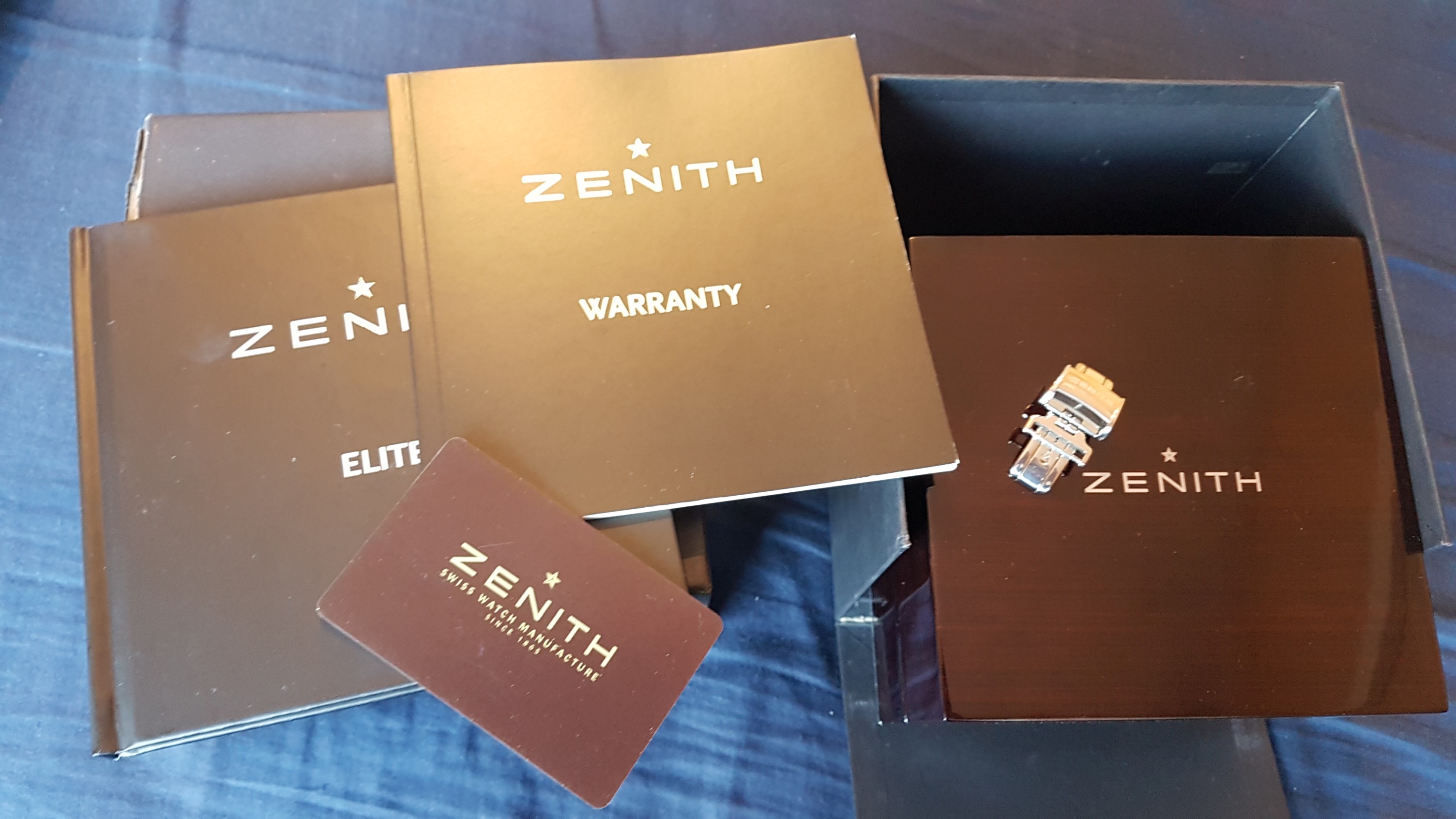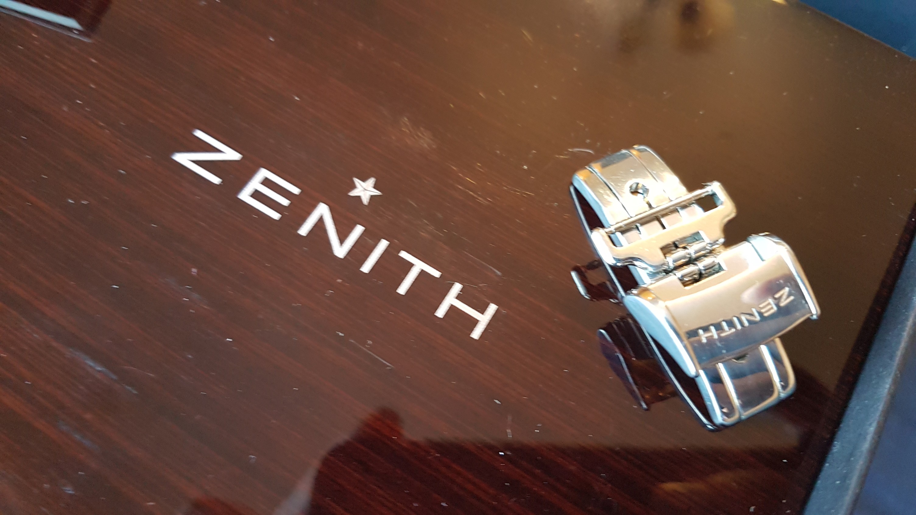 Description: This watch has been shown in reddit r/Watches - https://www.reddit.com/r/Watches/comments/qka6a1/zenith_elite_automatic_power_reserve/ - and got some love 😀. Beautiful guilloche dial, transparent caseback reveals the wonderful thin Zenith automatic movement. The power reserve indicator is one of the most useful complications, IMHO. Keeps exact time, fully functional. Installed a genuine leather strap with a generic buckle, original Zenith deployant clasp is included, also with the full box and books set.