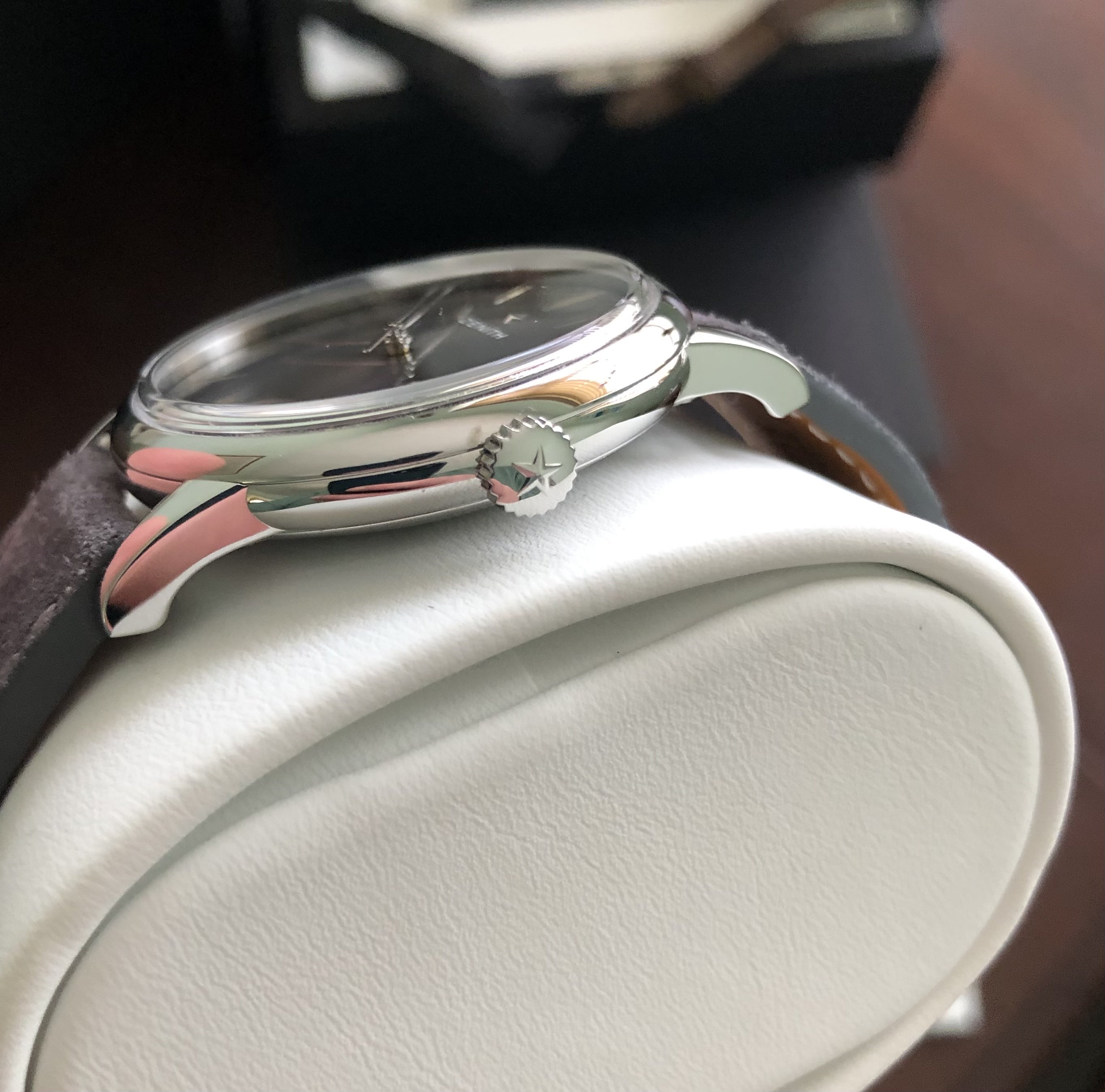 The smoked grey, black dial changes and depends on the light, sometimes the smoked, colour gradient is dark grey and other times black and sometimes has a warm, almost brownish hue, it’s never the same.