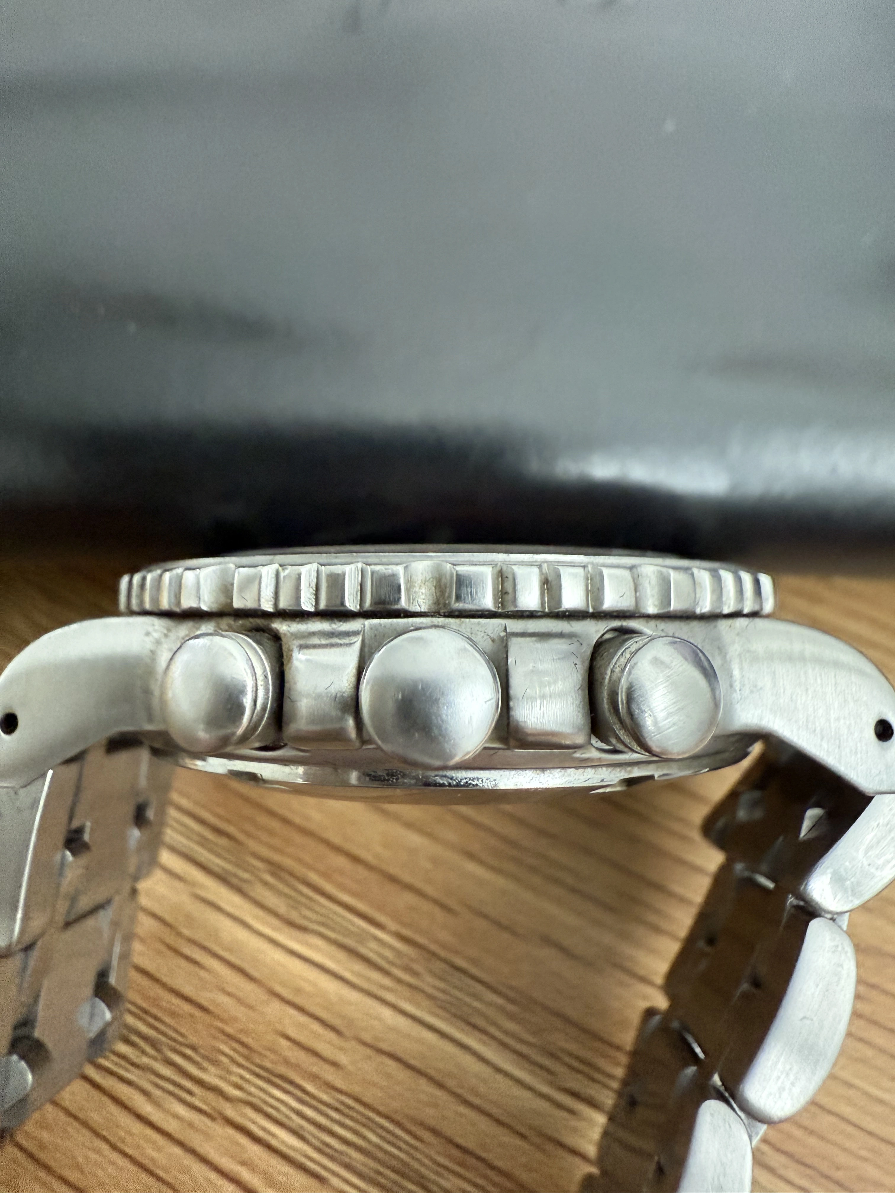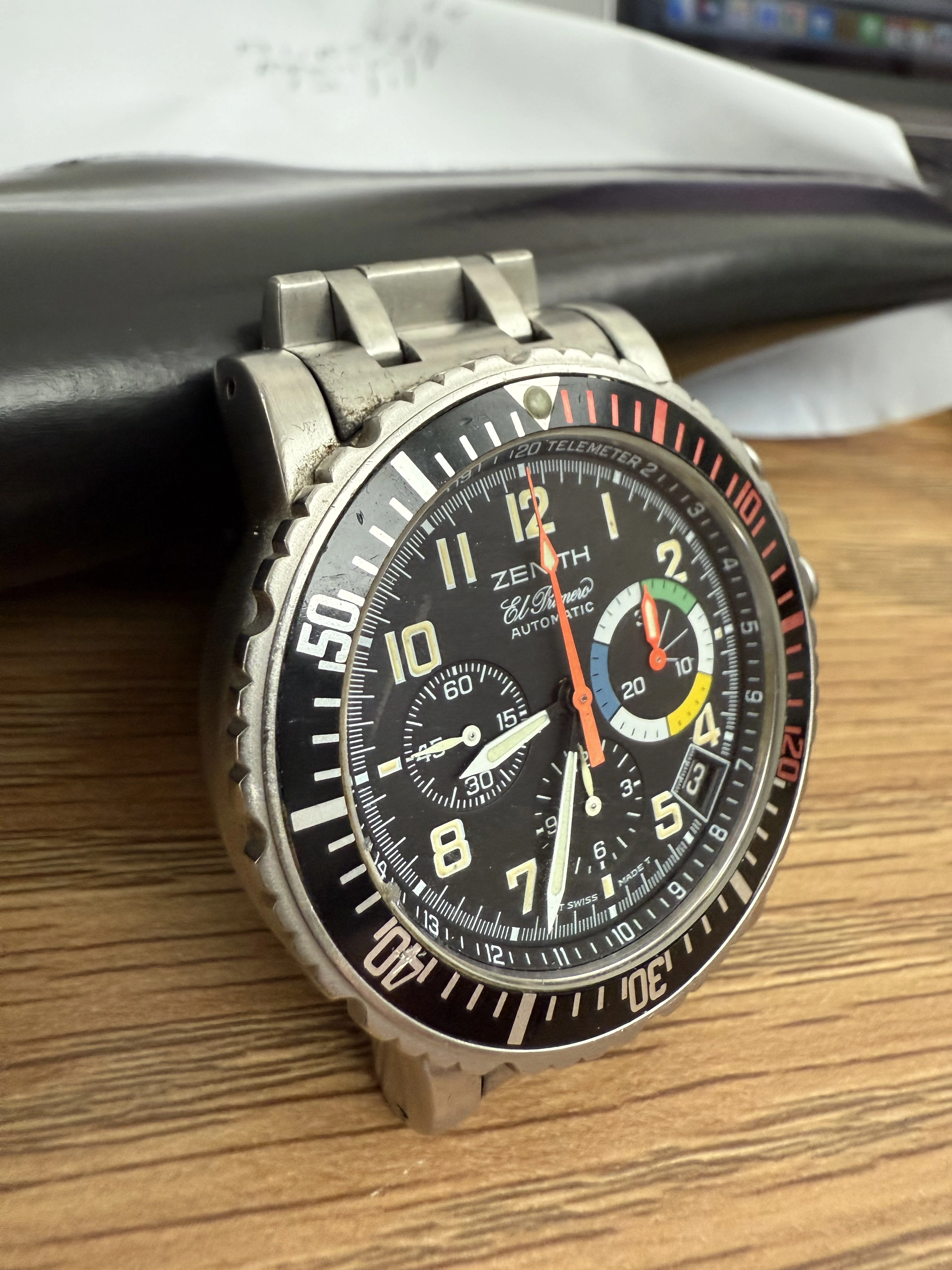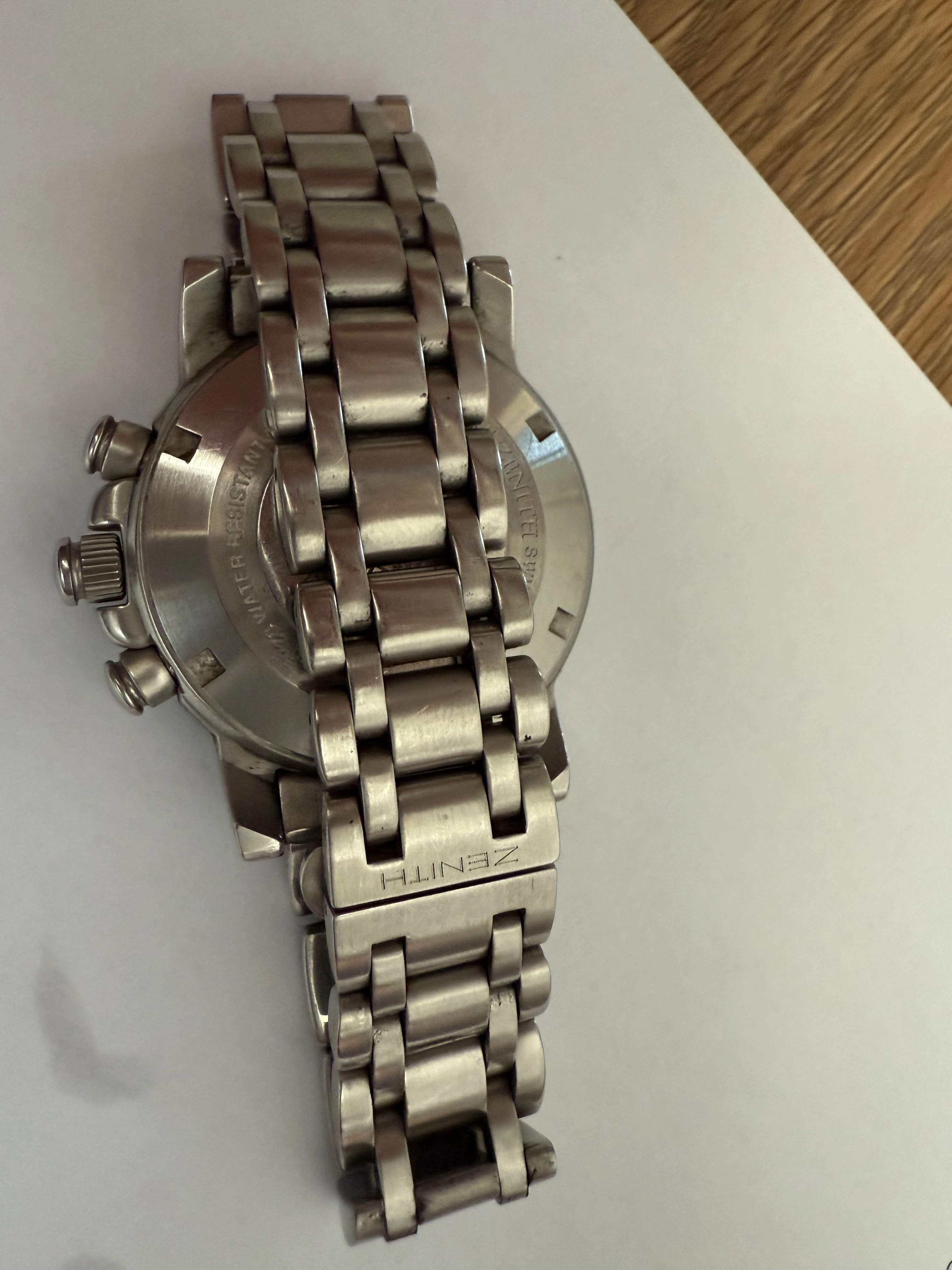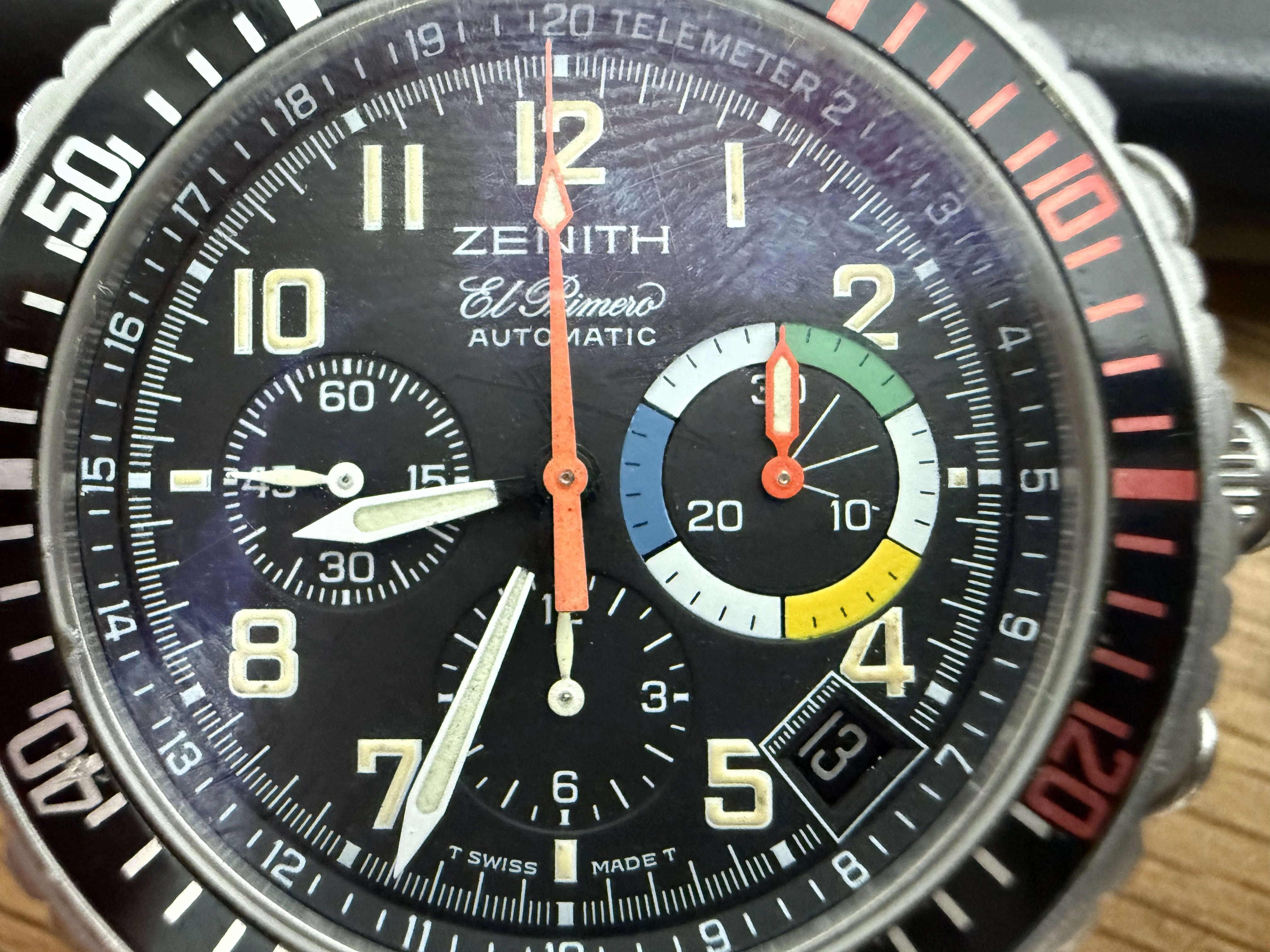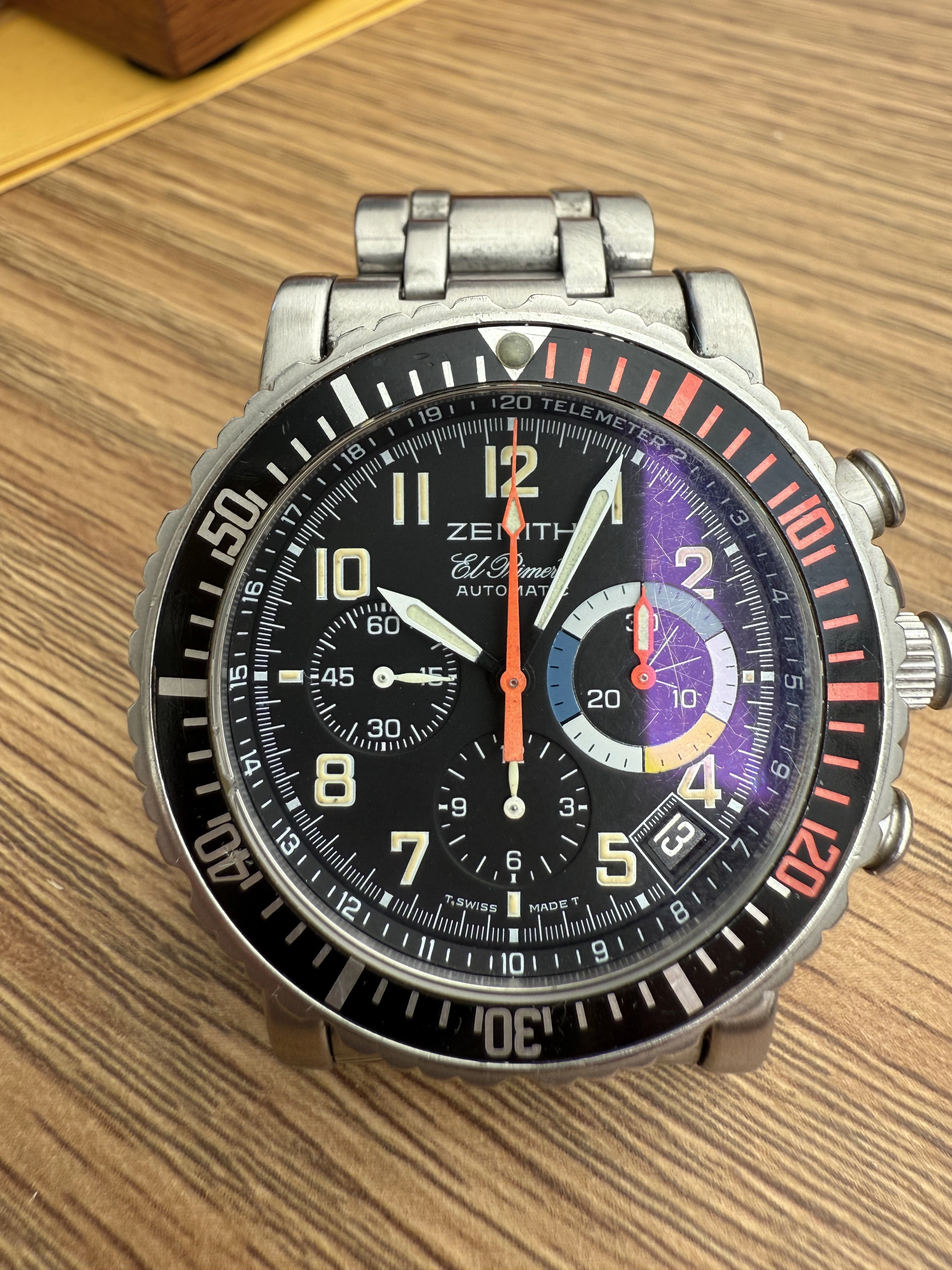 This is the earlier 1990s version with tritium hands and dial not later luminova. Fantastic multi faceted, multicolour dial with all original tritium. These watches were supposedly created to answer a French air force request for a new pilot watch but the order was cancelled before delivery. Could be an apocryphal tale, but, hey, everyone loves a good back story. Fitted with the iconic Zenith El Primero movement, one of the very first ever automatic chronograph movements and used for many years in the Rolex Daytona. Here the El Primero movement is fitted with a flyback function for quick timer resetting when in a barrel loop over enemy territory. Or something. Unmarked dial and hands, original red/black bezel in excellent condition, small scratch at 40, never noticed on the wrist but visible in these photos. On the lovely OEM Zenith bracelet which fits a 7.5 inch wrist.