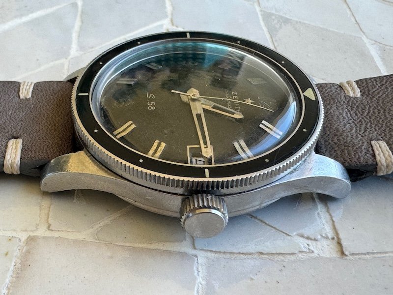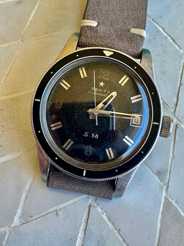 Up for grabs here is a watch every Zenith fan knows: the early 1960s S.58. Freshly serviced, keeping excellent time. The case is unpolished, 37mm, with enough scratches and dings to tell of a robust life. Crown is replaced. Dial has patina, but is unmolested. Asking $4k obo plus shipping