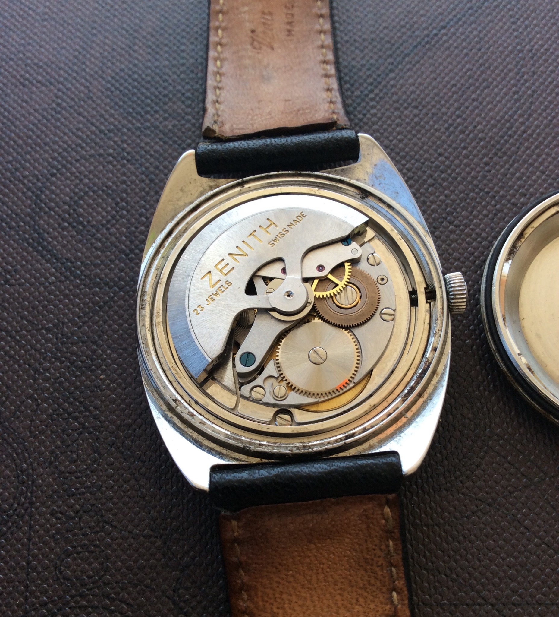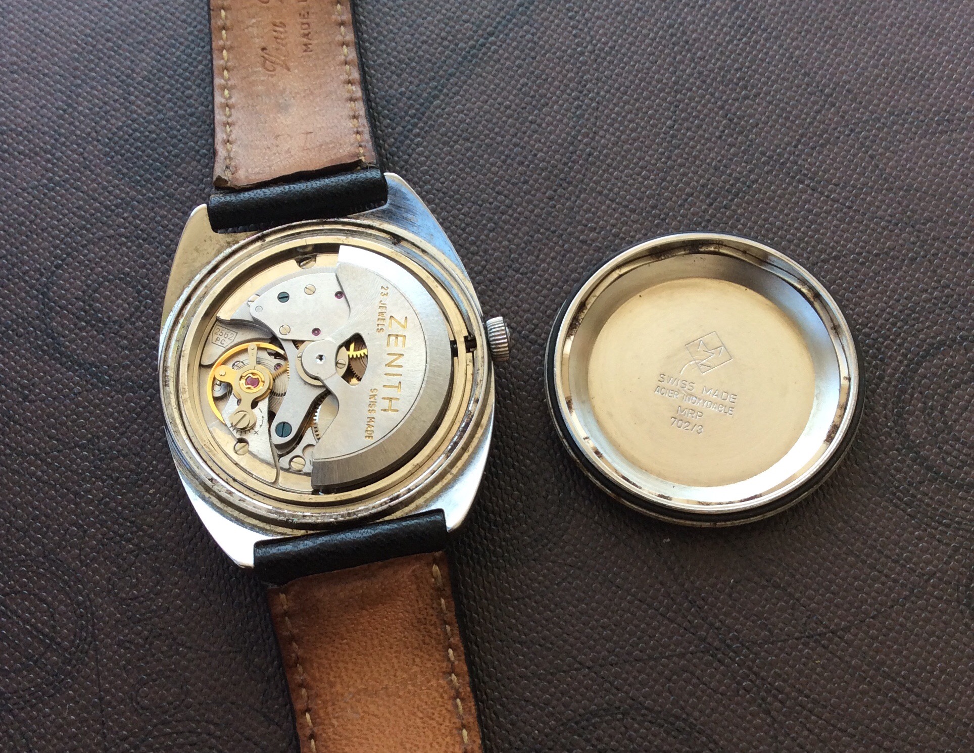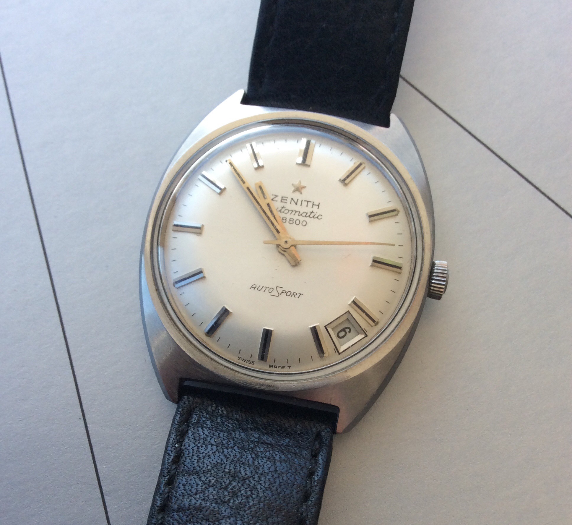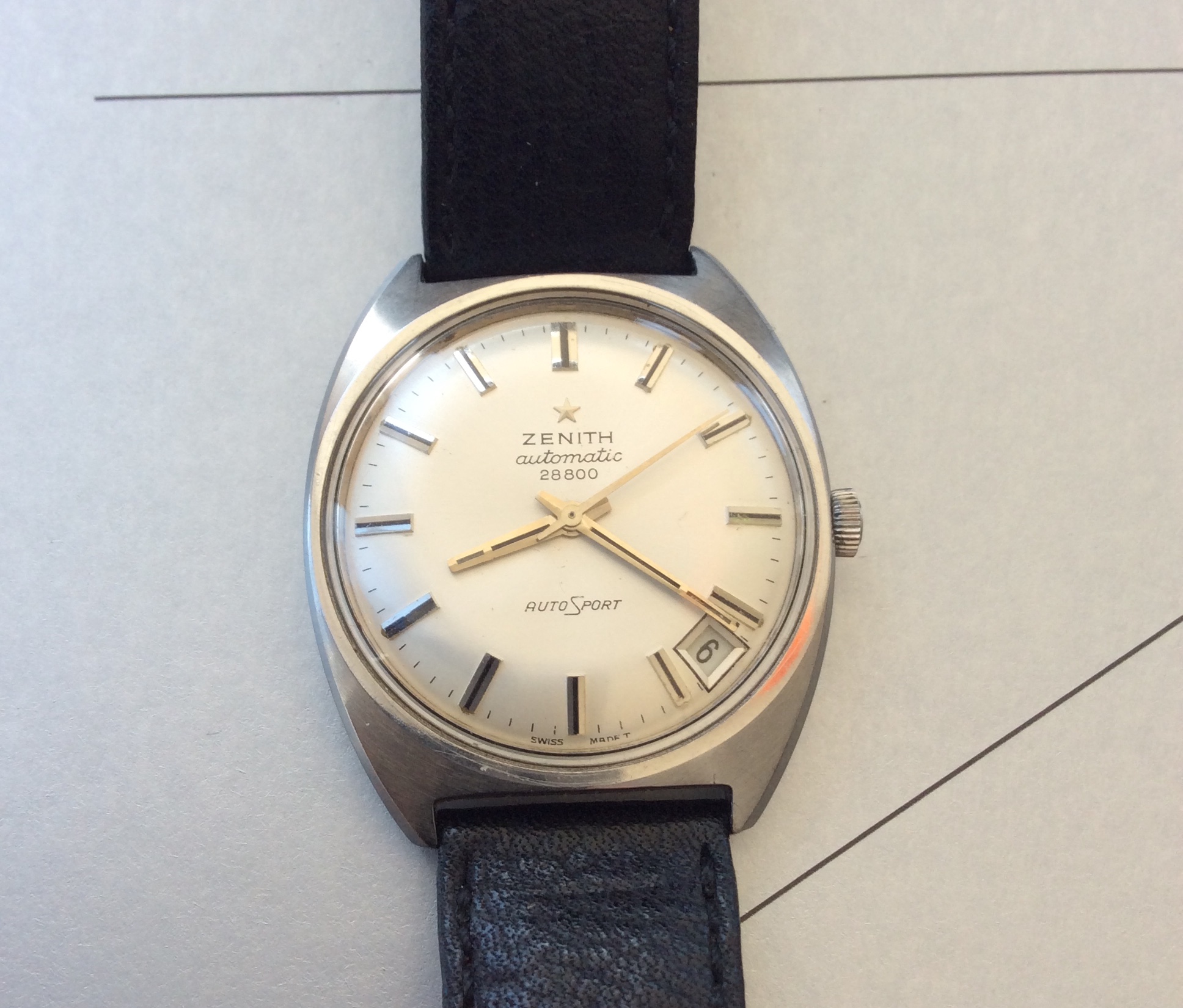 ·Very good condition case with only minor signs of use and sharp lugs and edges (33x39mm with 18mm lug width). Screw down caseback shows some scratch marks from careless opening. Zenith Caliber 2562PC looks to be running reasonably well, but service history is unknown so might be good to get one done before using it on a regular basis. Very nice original silver brushed dial with silver and black hour markers and an applied Zenith Star. There’s a very light mark just near the 3 o’clock marker and also very very light marks above the Autosport text. Original hands, nice clean crystal, and correct signed crown.