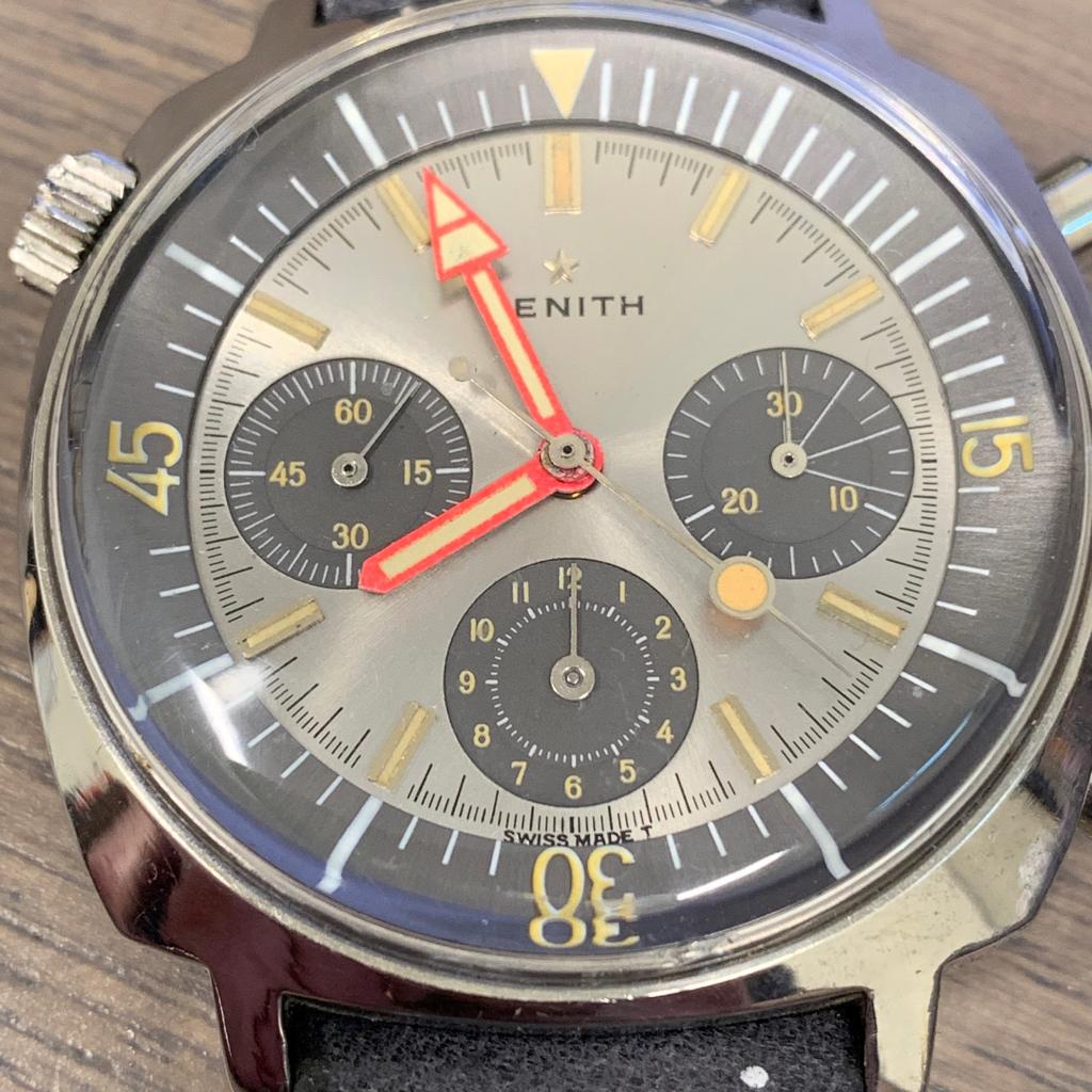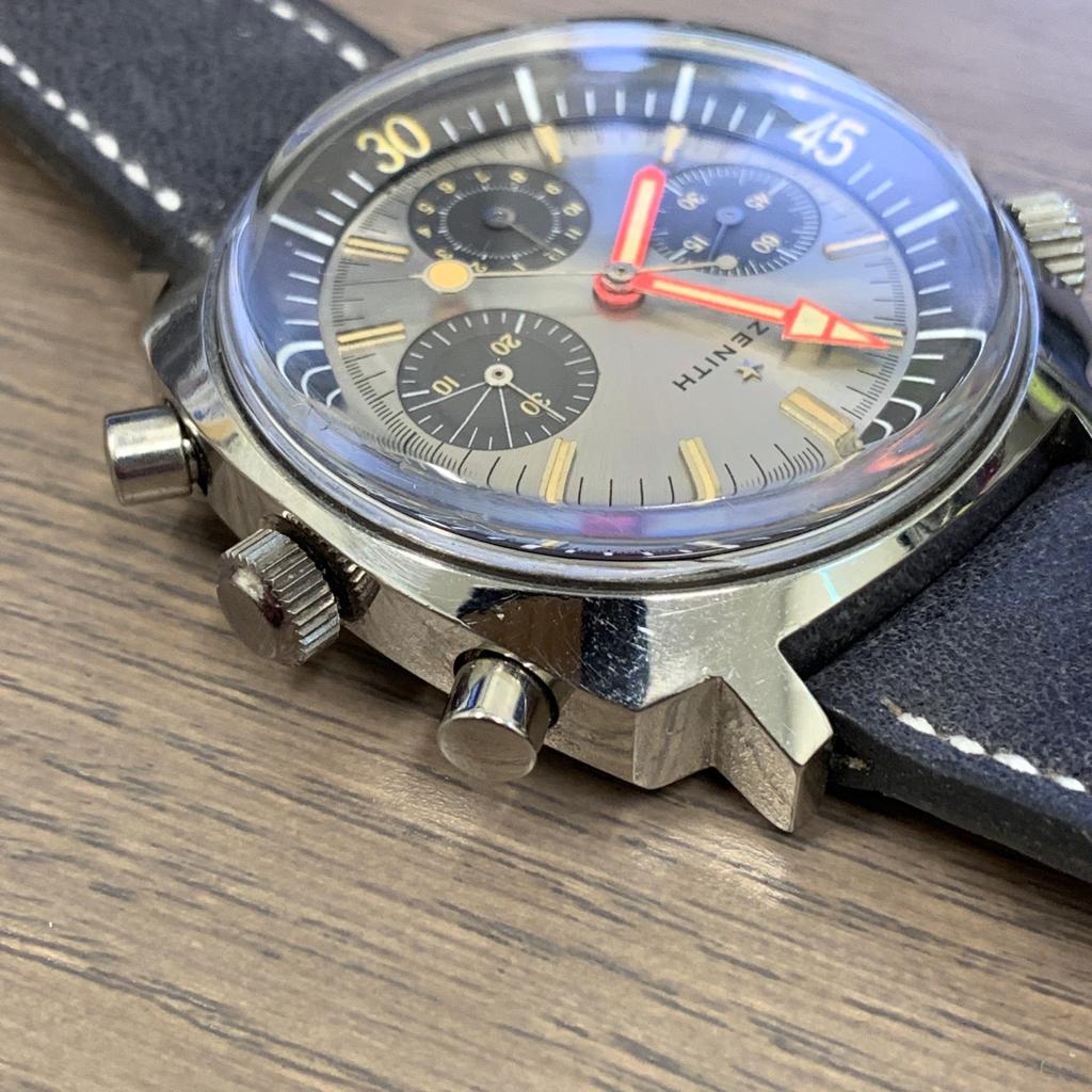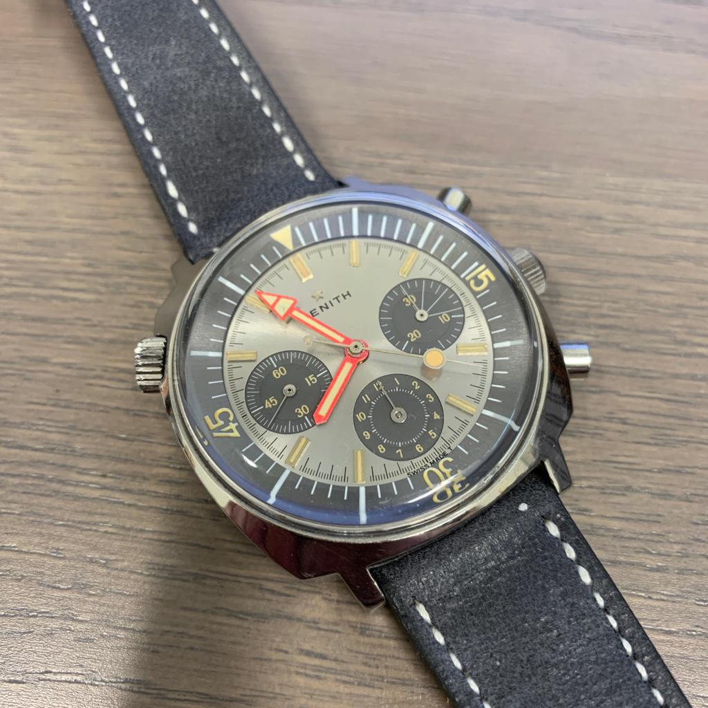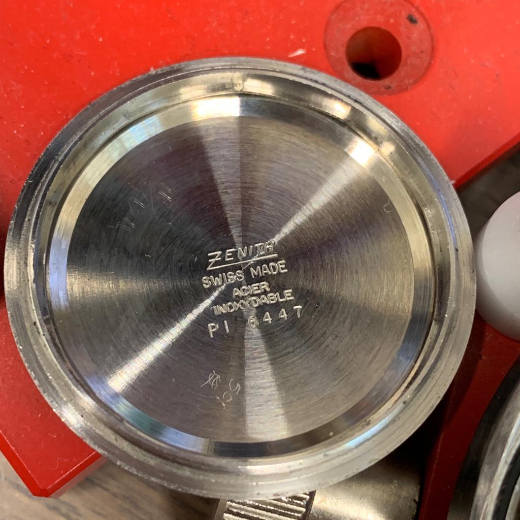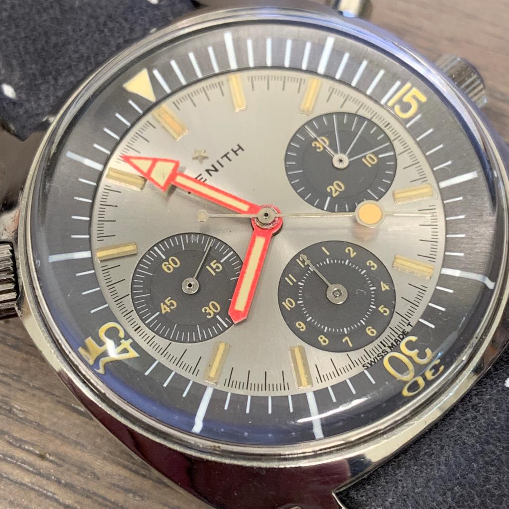 One of the greatest looking Zenith chronographs is the Super Sub Sea A3736. This grey dialed version with the orange hands is one of the nicest looking versions from the Sub Sea collection. The condition of the hands, dial and inner rotating bezel are in great shape and seem to have all the original tritium lume. The Zenith 146HP movement looks to be very clean and all features function properly however service history is not known. Case looks to have been polished in the past however the serial is still seen faintly (Serial 815Dxxx). Watch is sold as head only. Any questions or need extra pictures feel free to dm/email me.