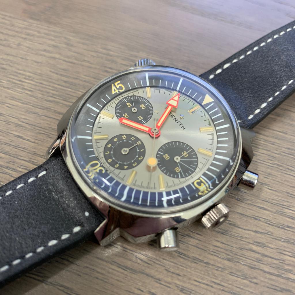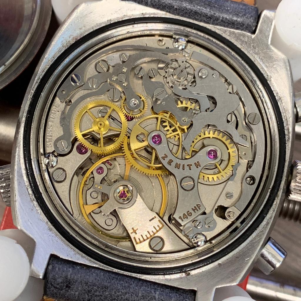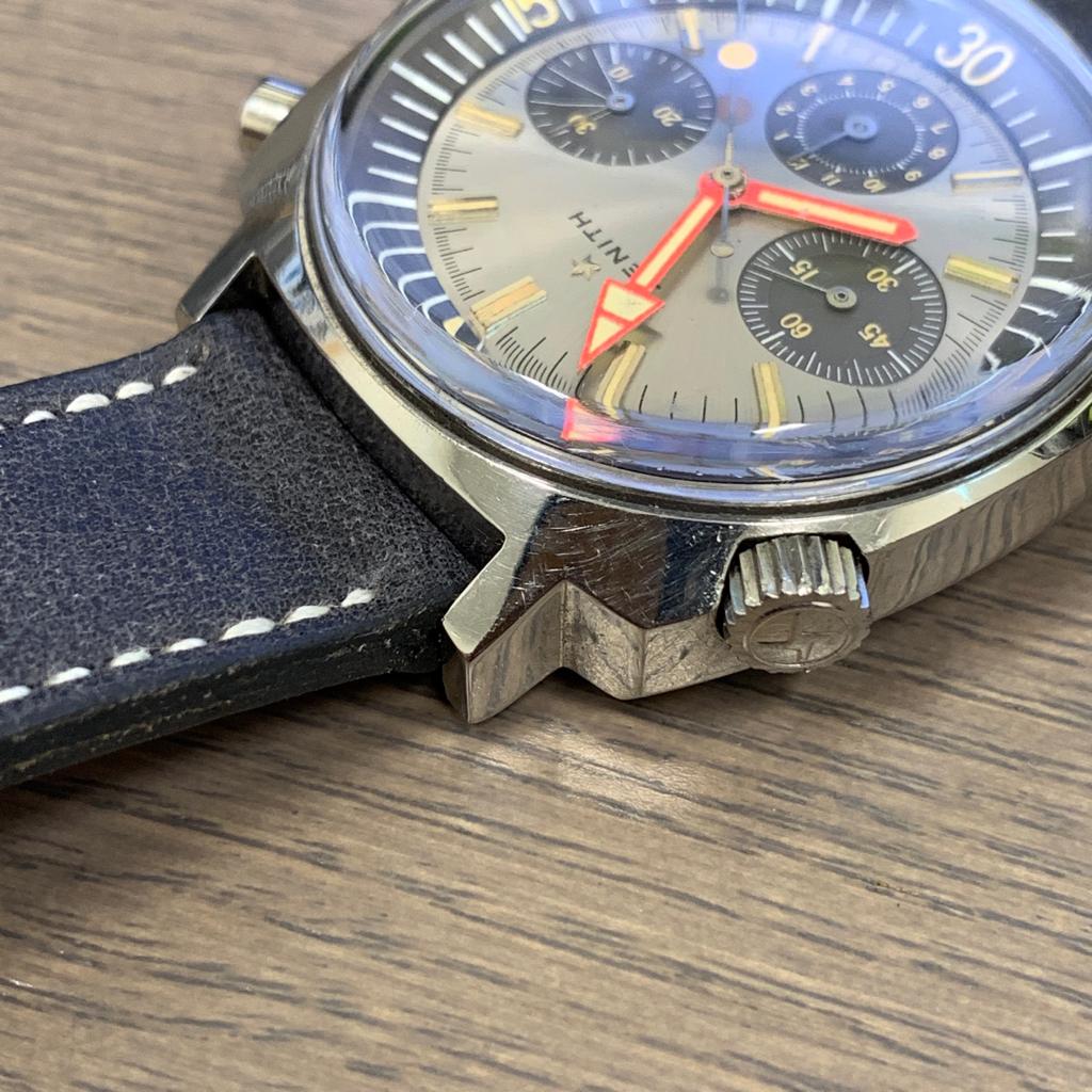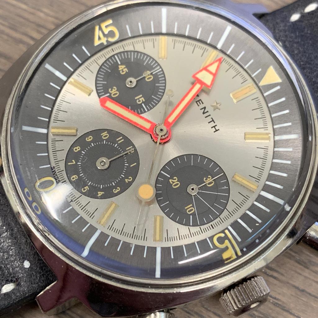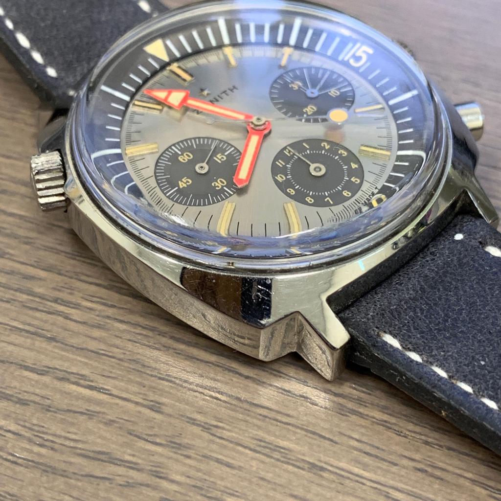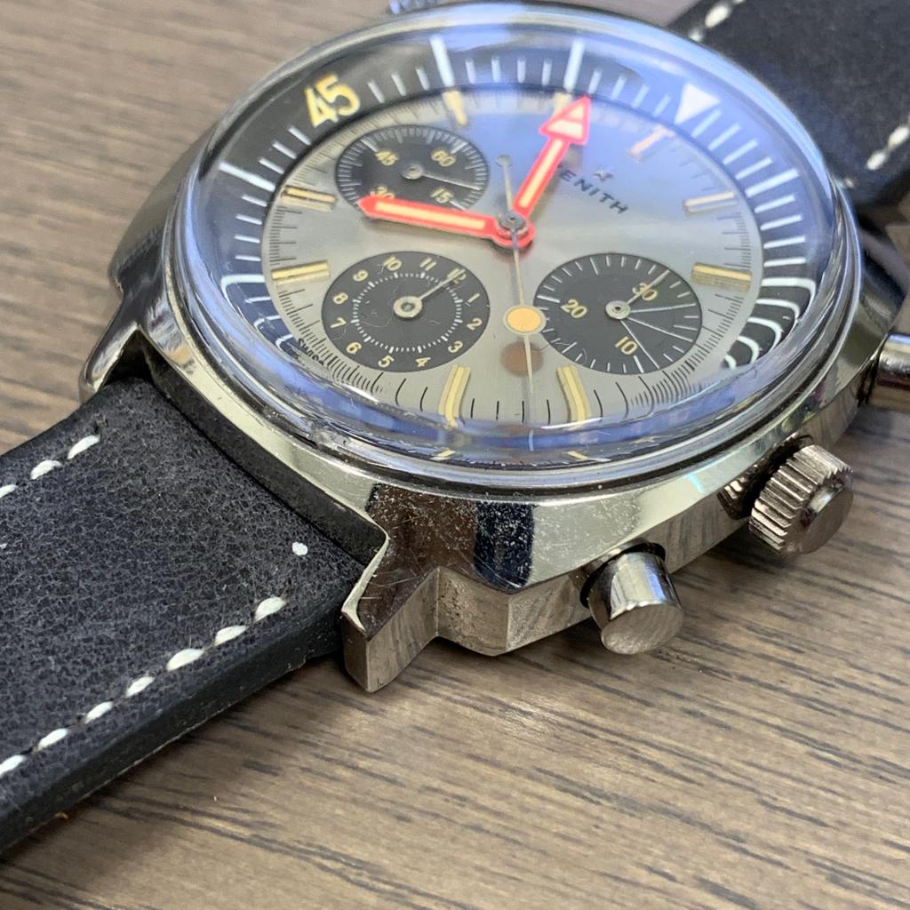 One of the greatest looking Zenith chronographs is the Super Sub Sea A3736. This grey dialed version with the orange hands is one of the nicest looking versions from the Sub Sea collection. The condition of the hands, dial and inner rotating bezel are in great shape and seem to have all the original tritium lume. The Zenith 146HP movement looks to be very clean and all features function properly however service history is not known. Case looks to have been polished in the past however the serial is still seen faintly (Serial 815Dxxx). Watch is sold as head only. Any questions or need extra pictures feel free to dm/email me.
