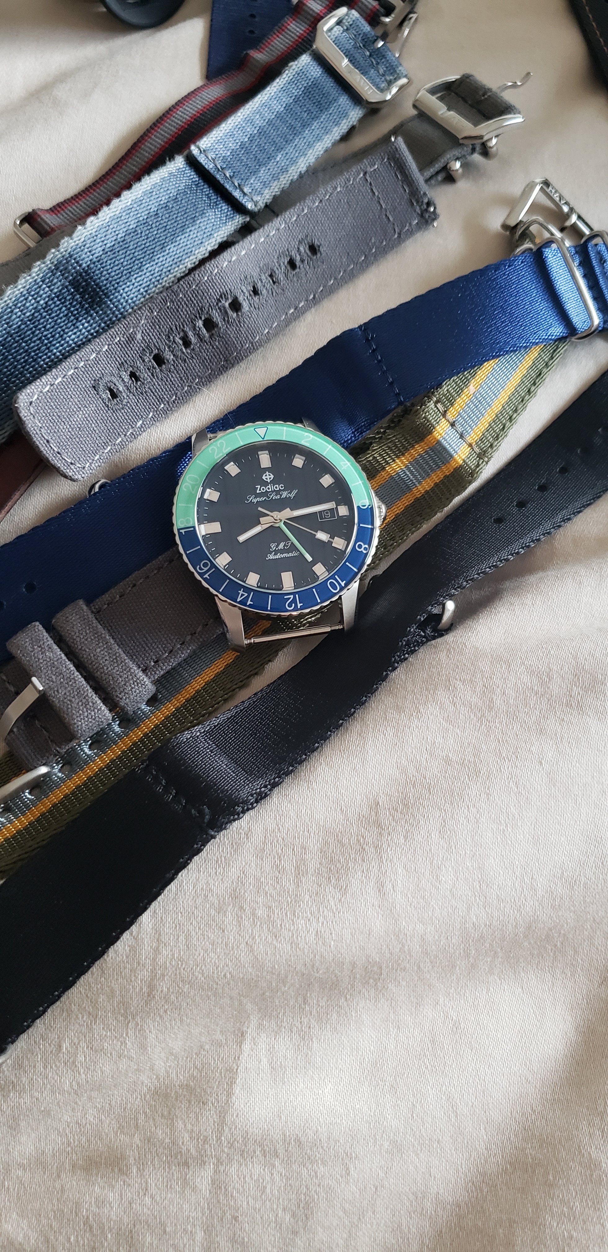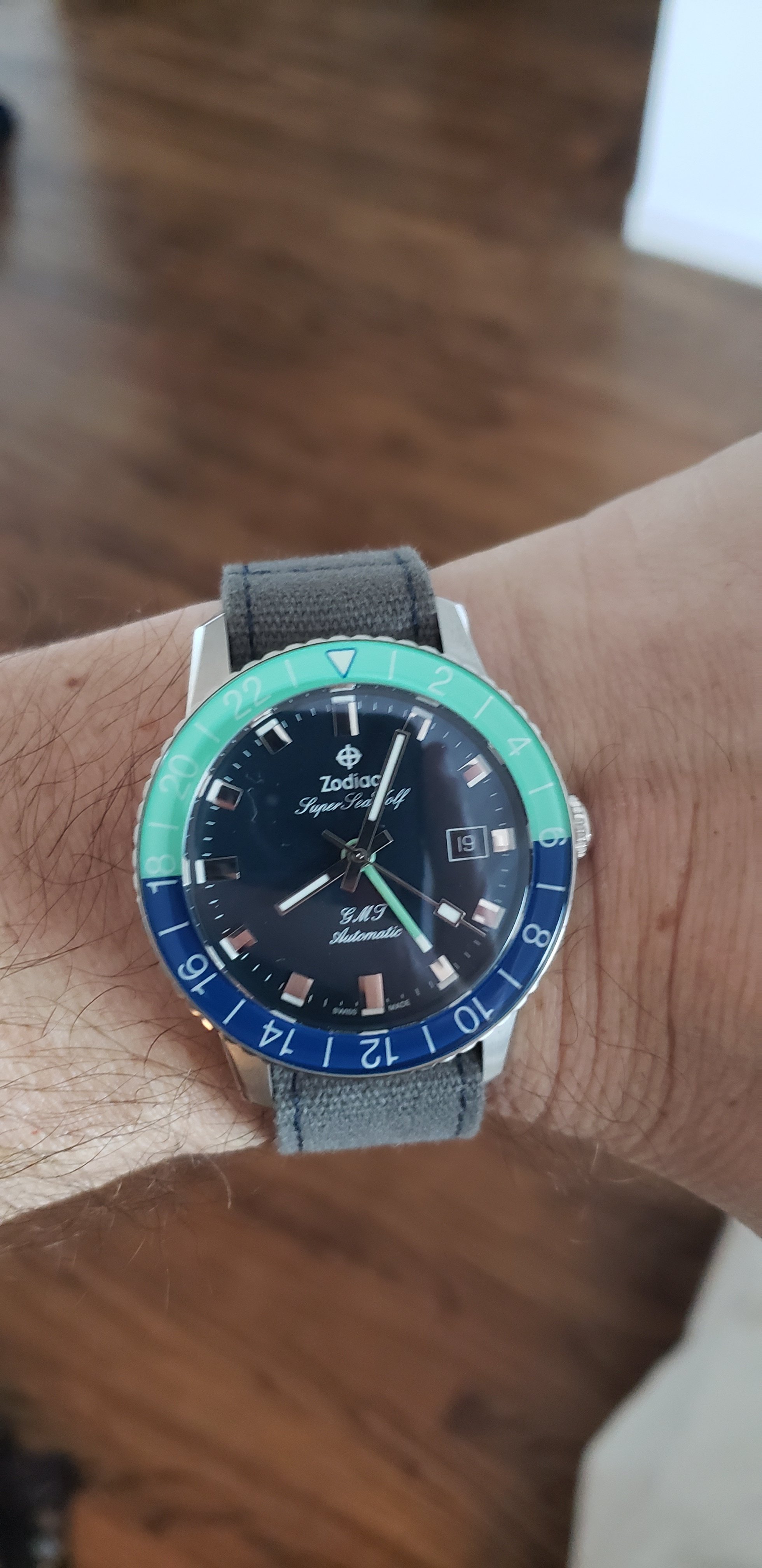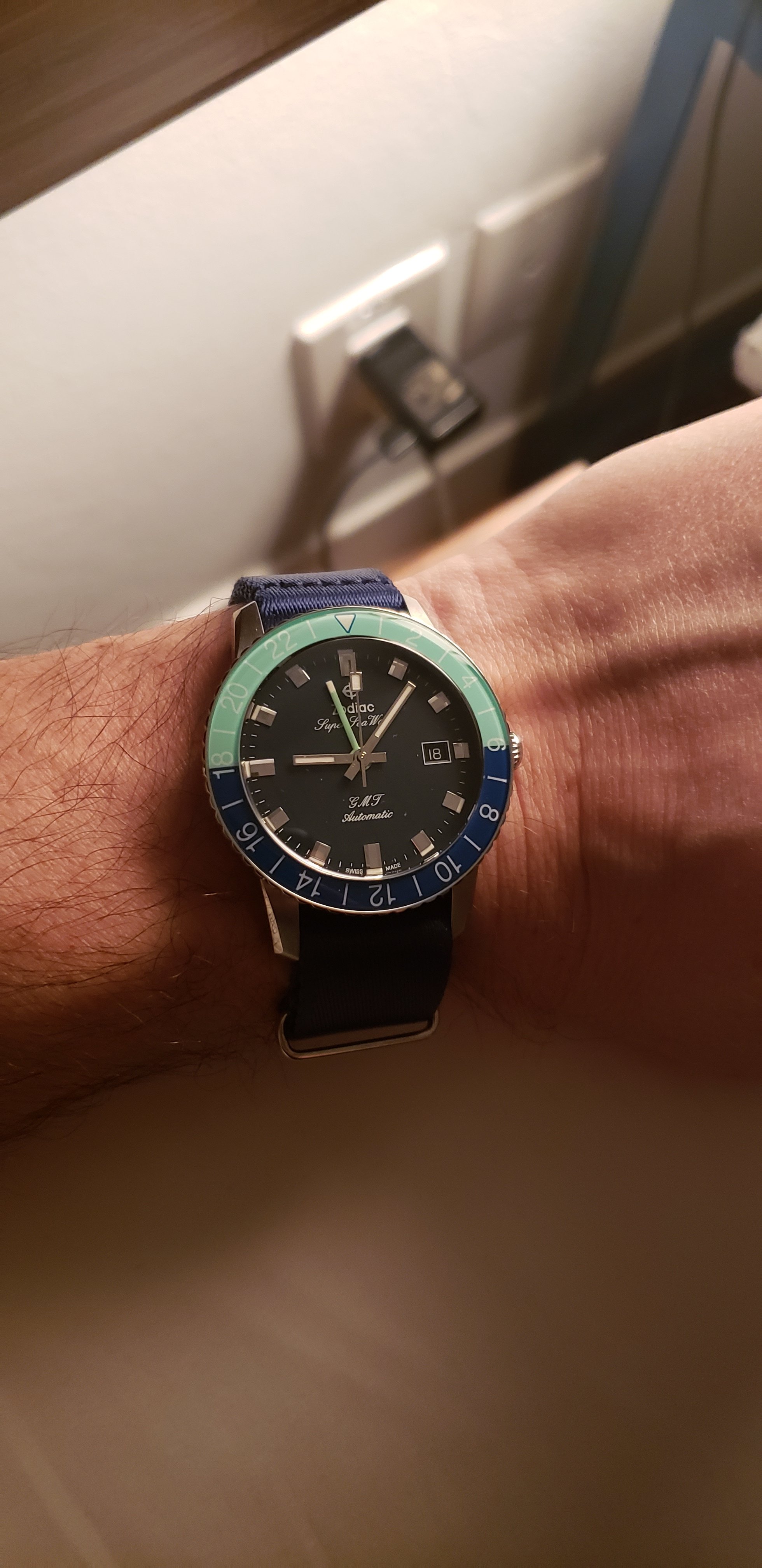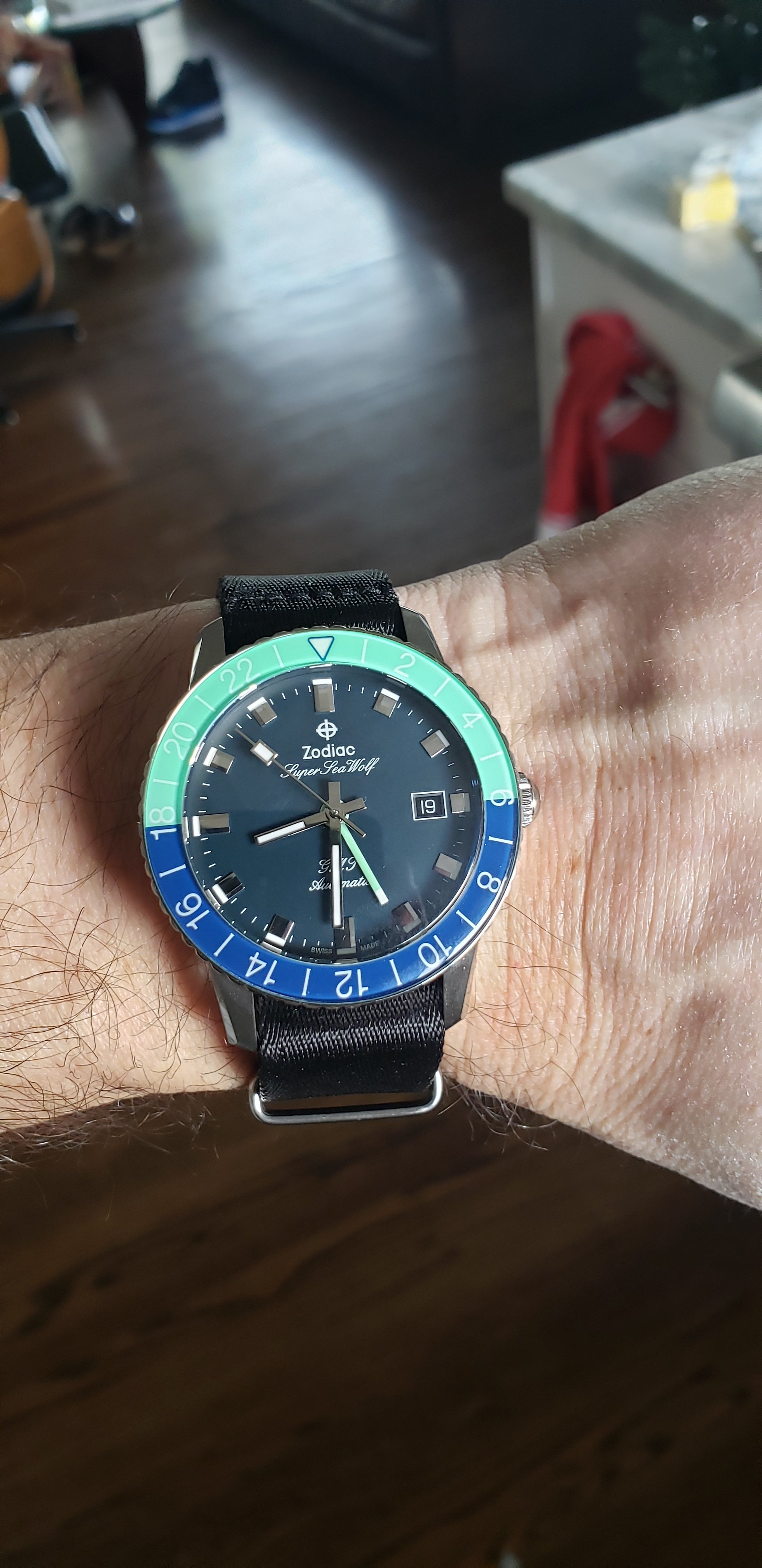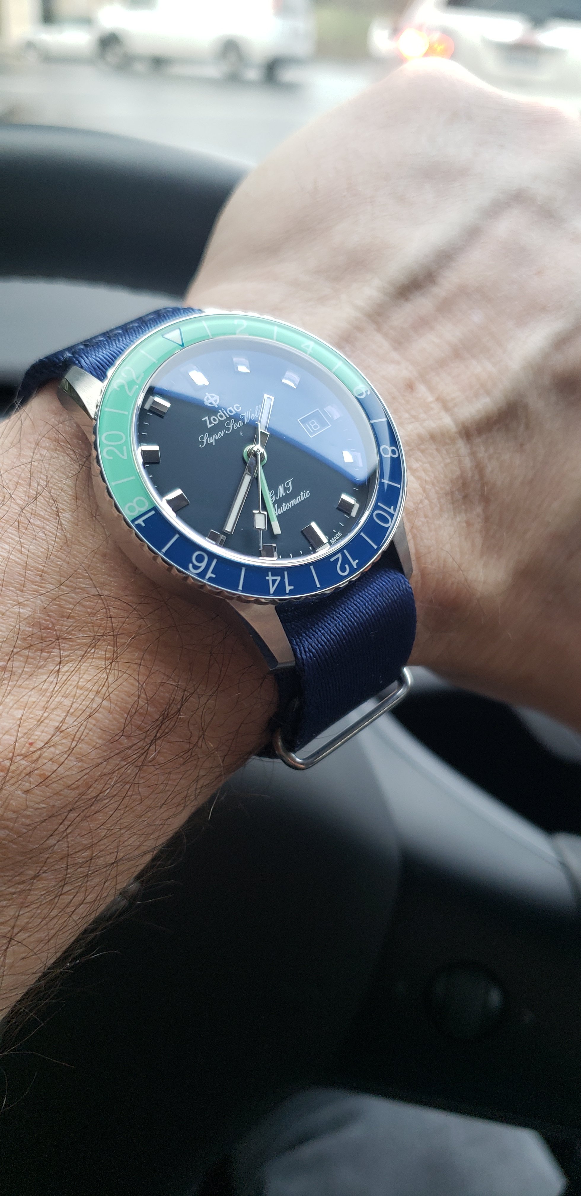 Some additional thoughts...it's definitely a fun watch and a nice change up from my current collection of mostly black dial/bezel SS sports watches. I like that its unique and that I'm not likely to see others in the wild. Had a few quibbles with the bracelet, so think I'll stick with the NATO for a while. Bracelet isnt terrible and the SEL did give it a solid feel, but I'm spoiled by the Oyster on my Sub - theres no comparison. Crown is a bit small and doesnt have the smoothest action, but typical for this price point I guess- similar action to my Sinn 104. I absolutely love the dial color in the light. It's like a blueish -black ...hard to describe but amazing to look at when the light catches it. I know the bezel is polarizing for some, but I dig the color scheme. Even got a compliment from my wife who usually just rolls her eyes when I buy a new watch, so that's saying something. Overall, very happy and look forward to making some memories with this one! Oh, and couldn't resist one more wrist shot!