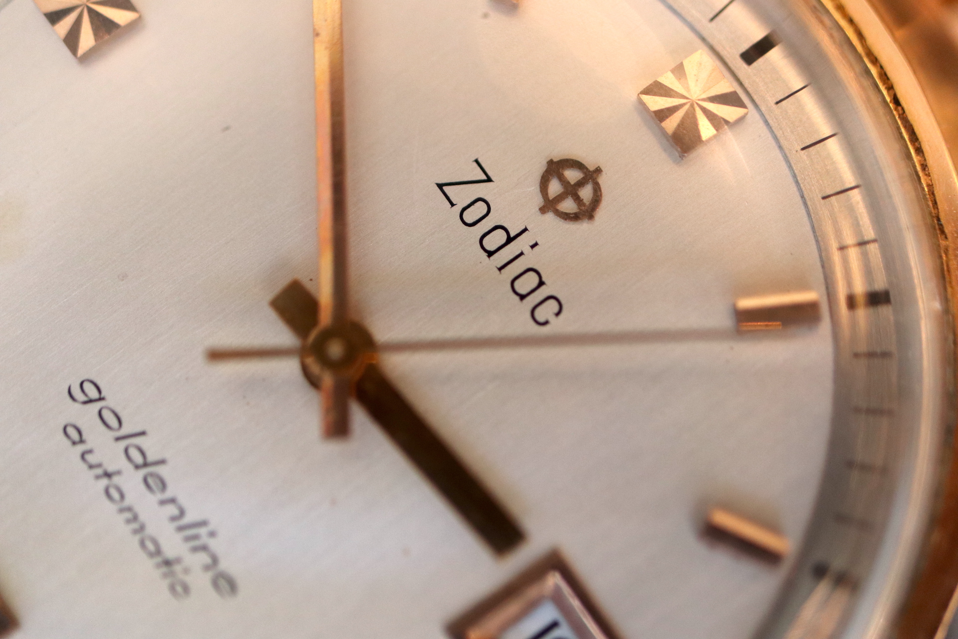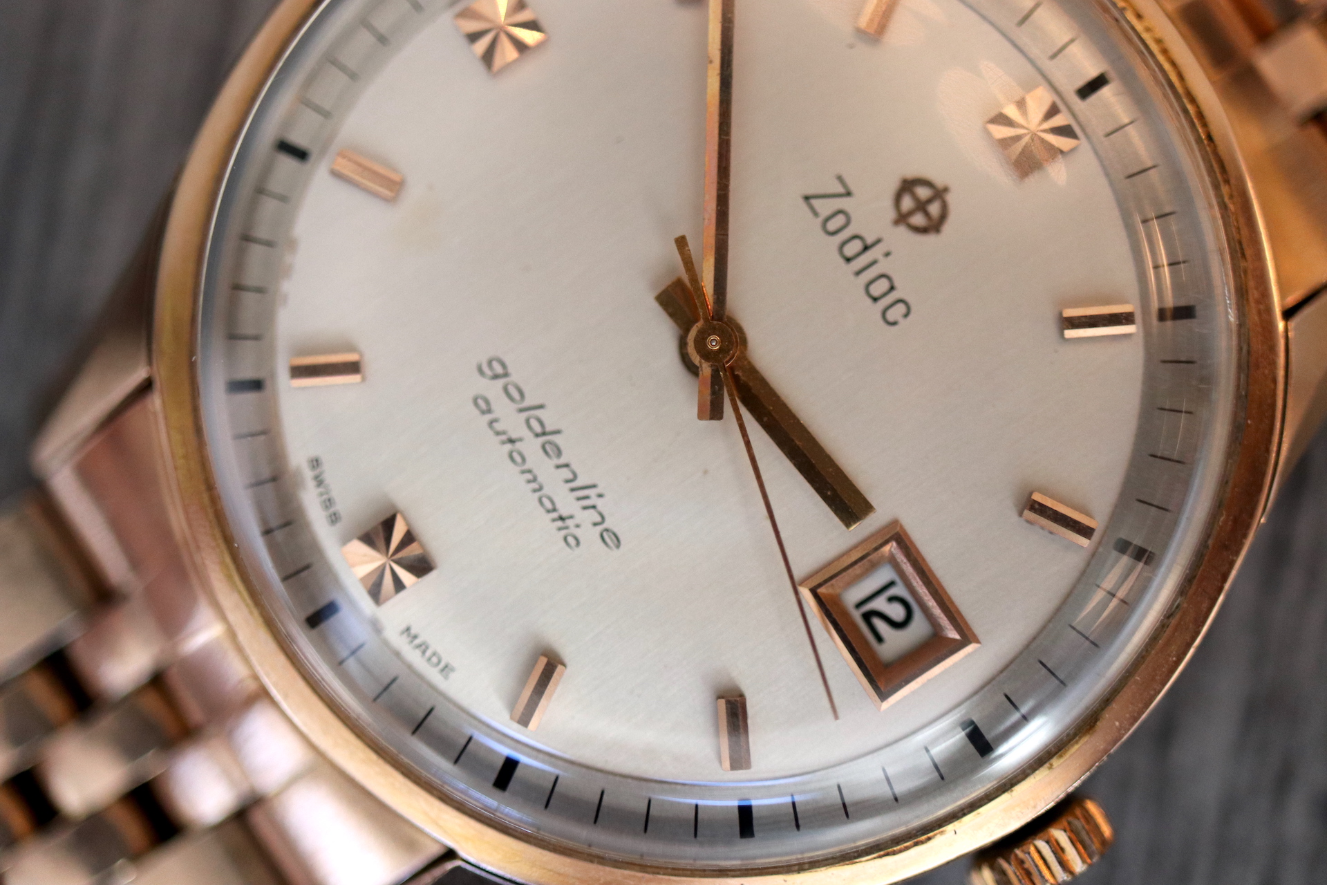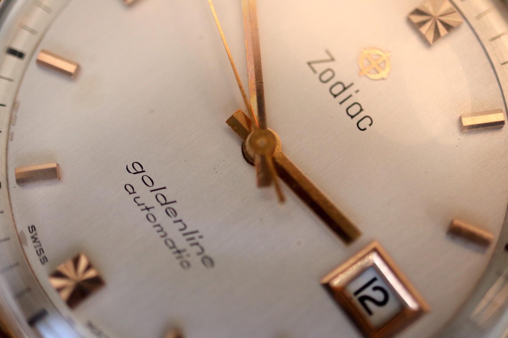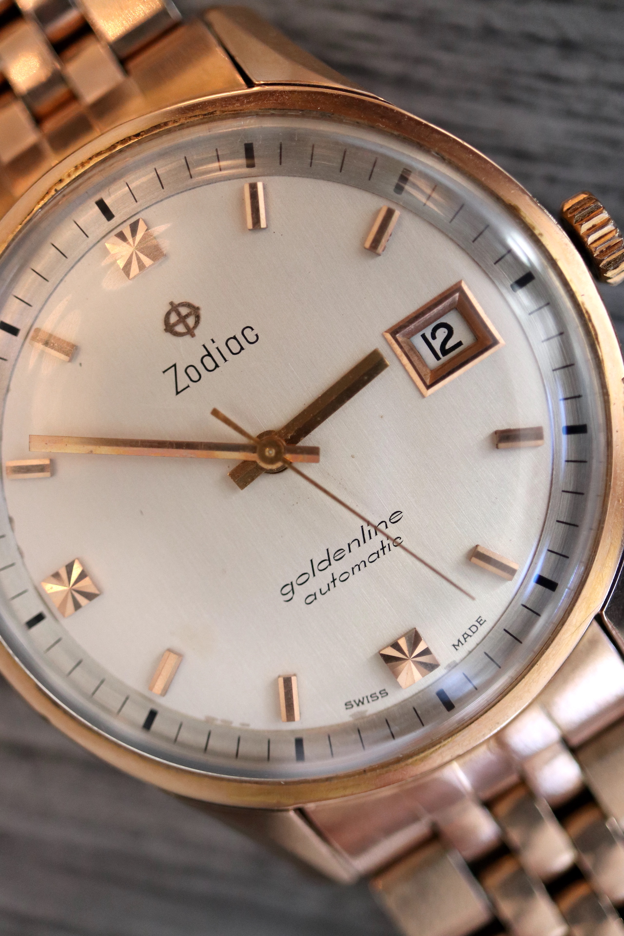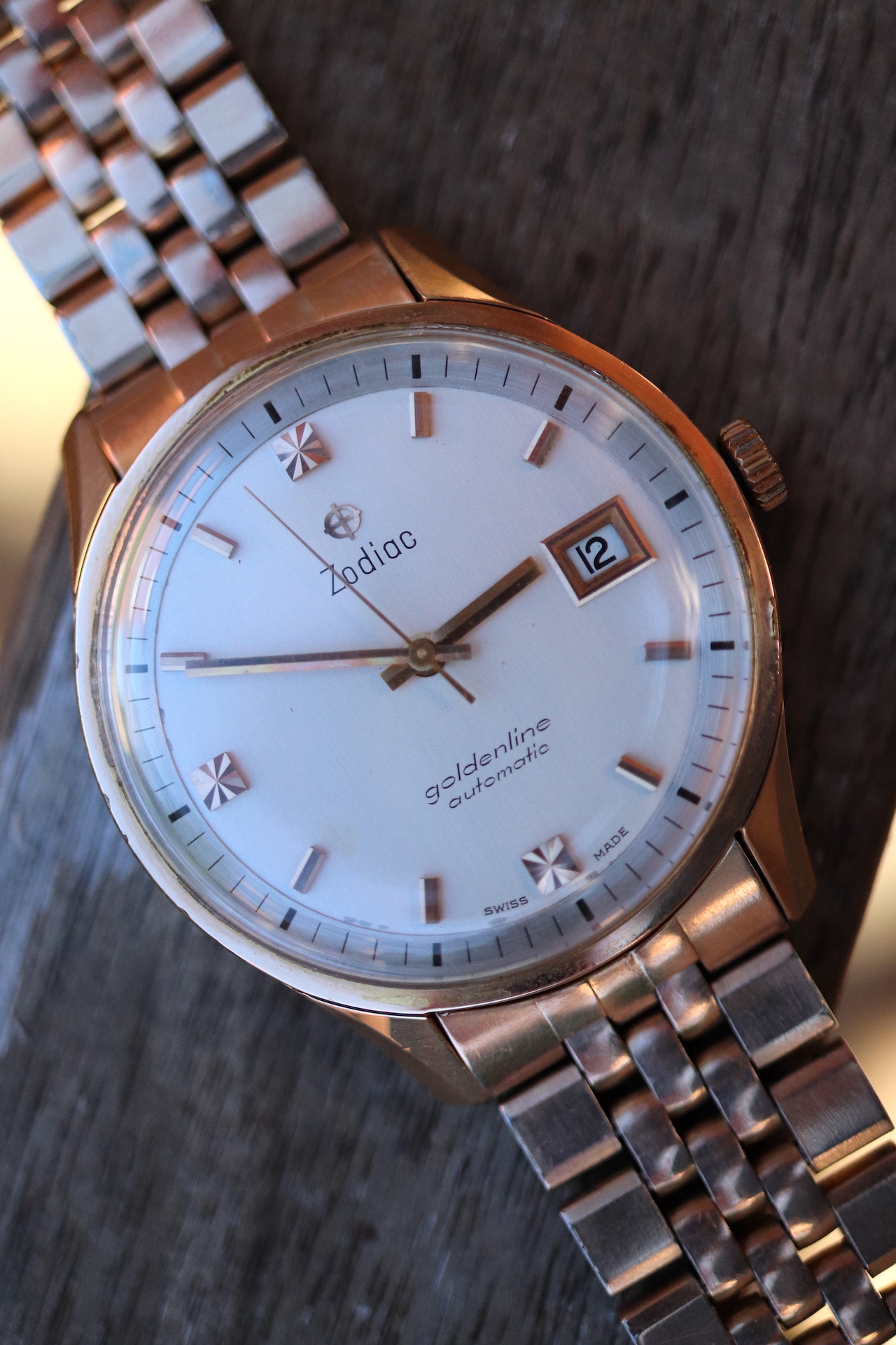 ·For sale, I have a Zodiac Goldenline Ref: 722 924 It has the Caliber 70 which is an automatic movement. Rose gold in color. Case measure 36mm without the crown. There are some scuffs and dents all around and some blemishes on the dial between 6 to 8. I can't open this type of case so unfortunately, I can not provide any movement pictures.