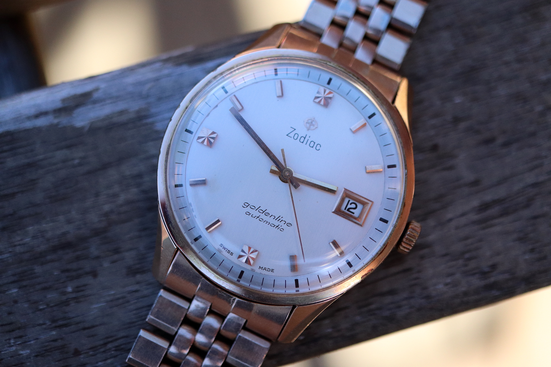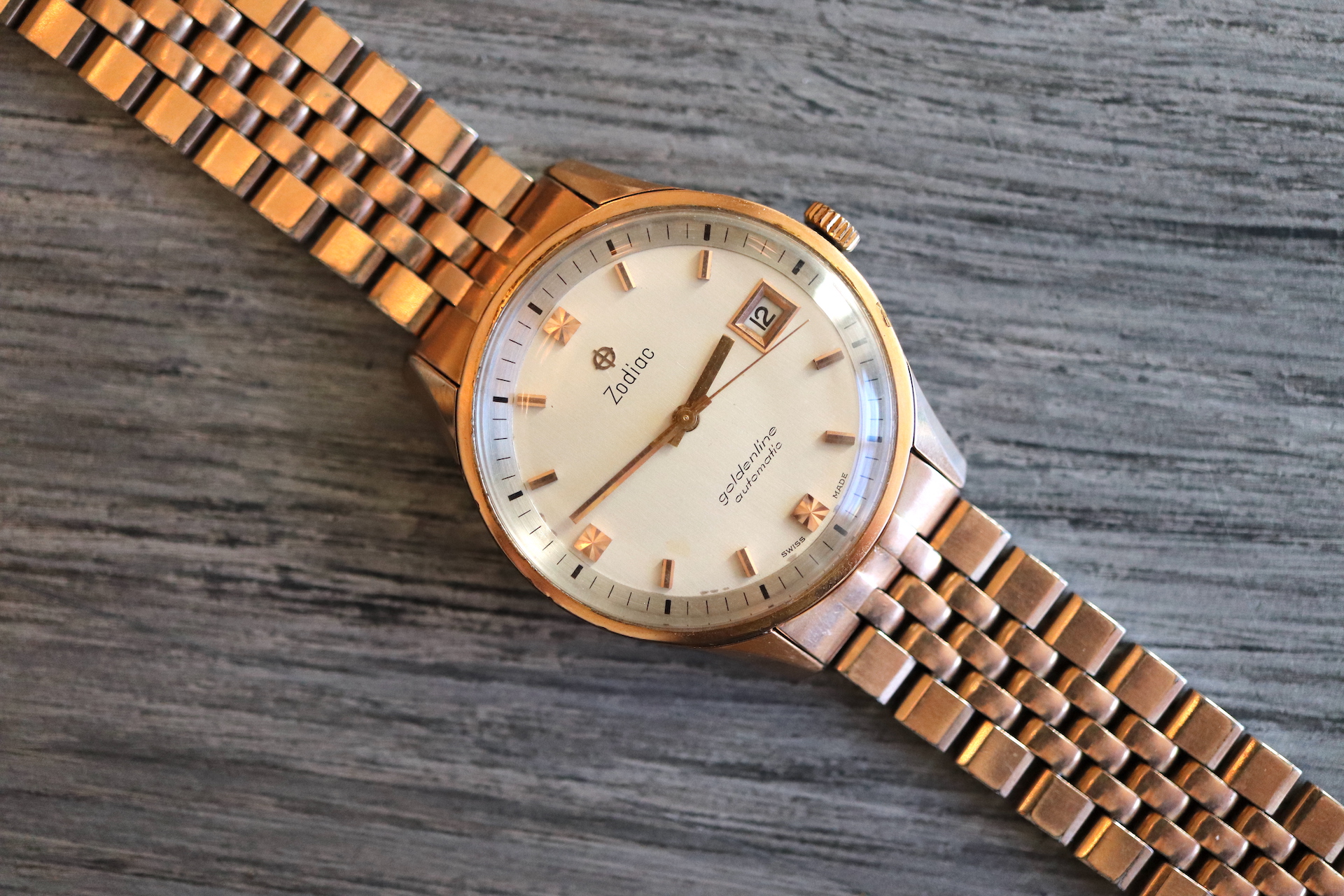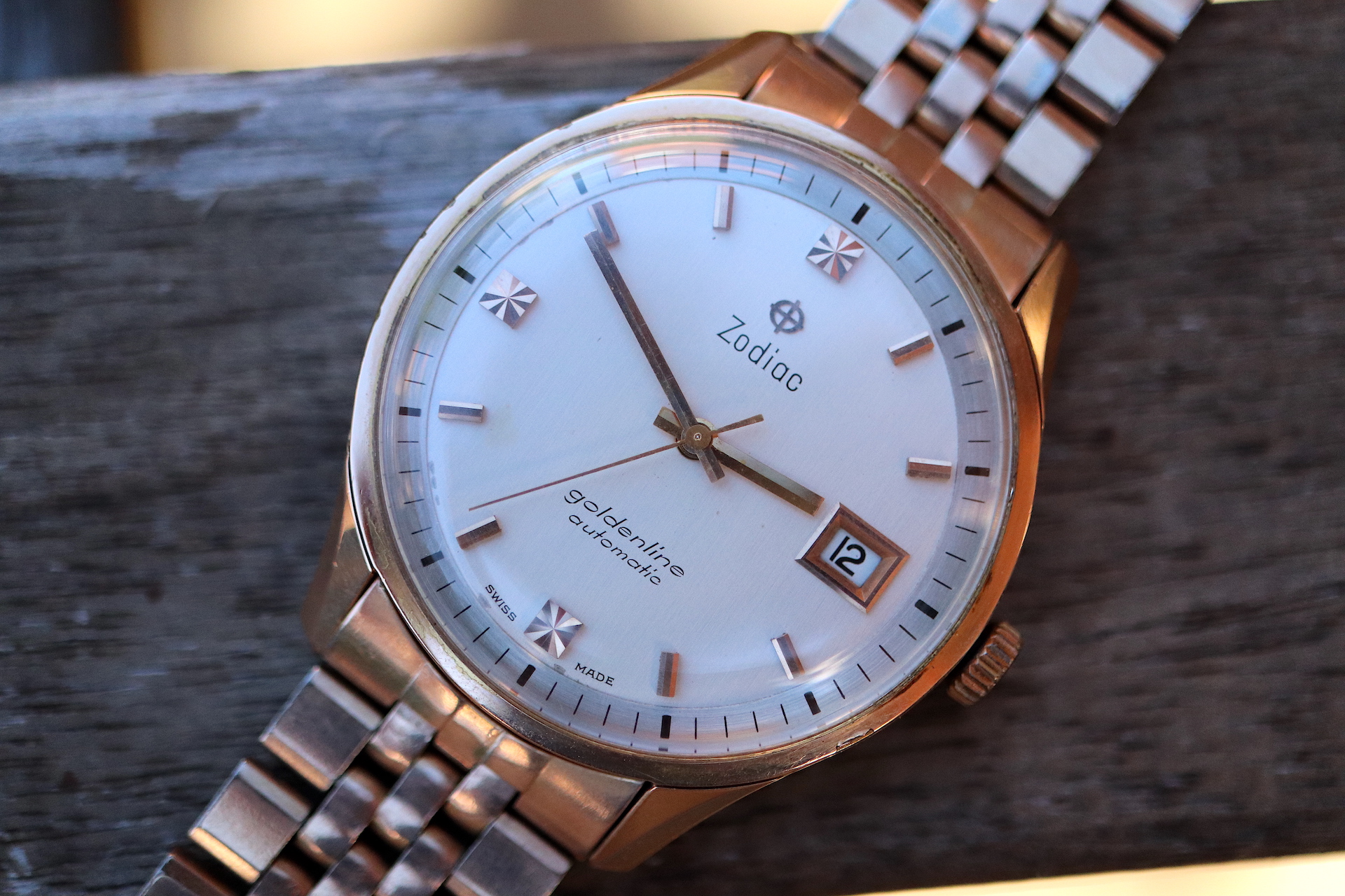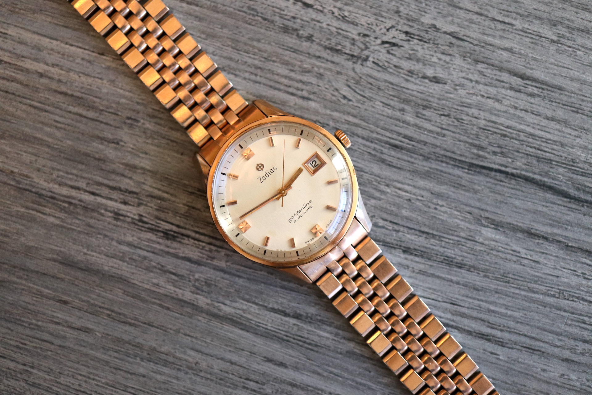 ·For sale, I have a Zodiac Goldenline Ref: 722 924 It has the Caliber 70 which is an automatic movement. Rose gold in color. Case measure 36mm without the crown. There are some scuffs and dents all around and some blemishes on the dial between 6 to 8. I can't open this type of case so unfortunately, I can not provide any movement pictures.